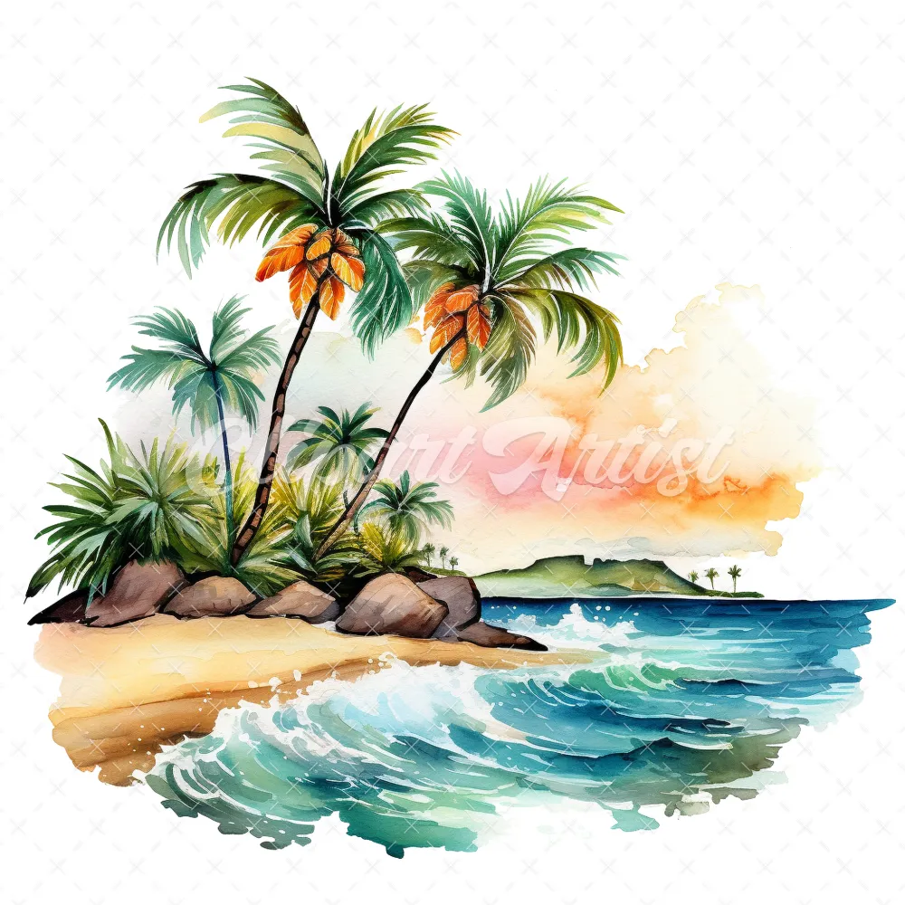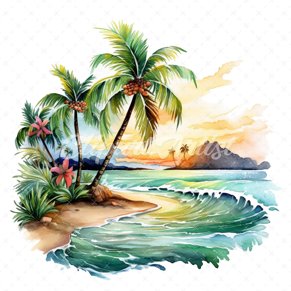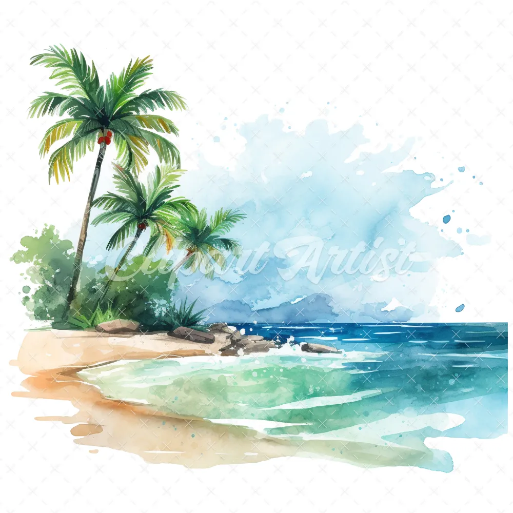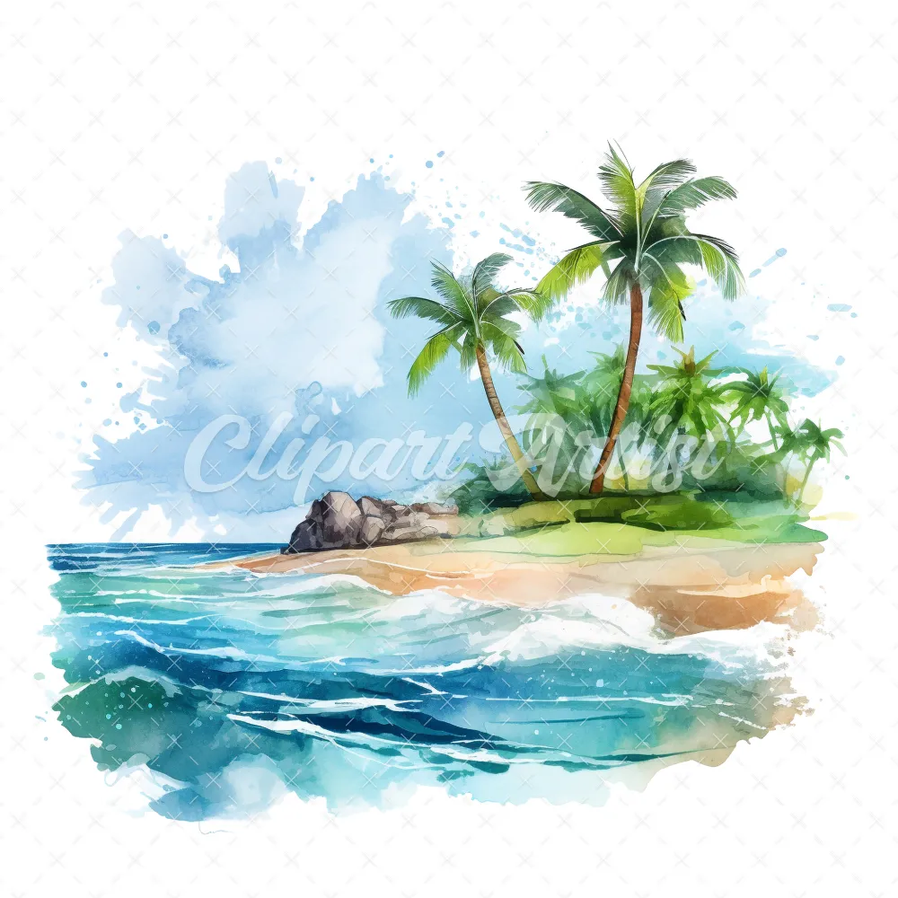 20 High-Quality Tropical Beach Clipart – Tropical beach digital watercolor JPG instant download for commercial use – Digital download