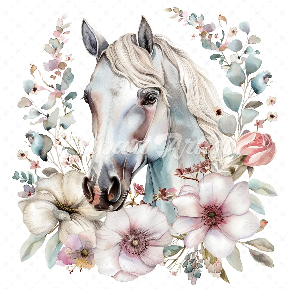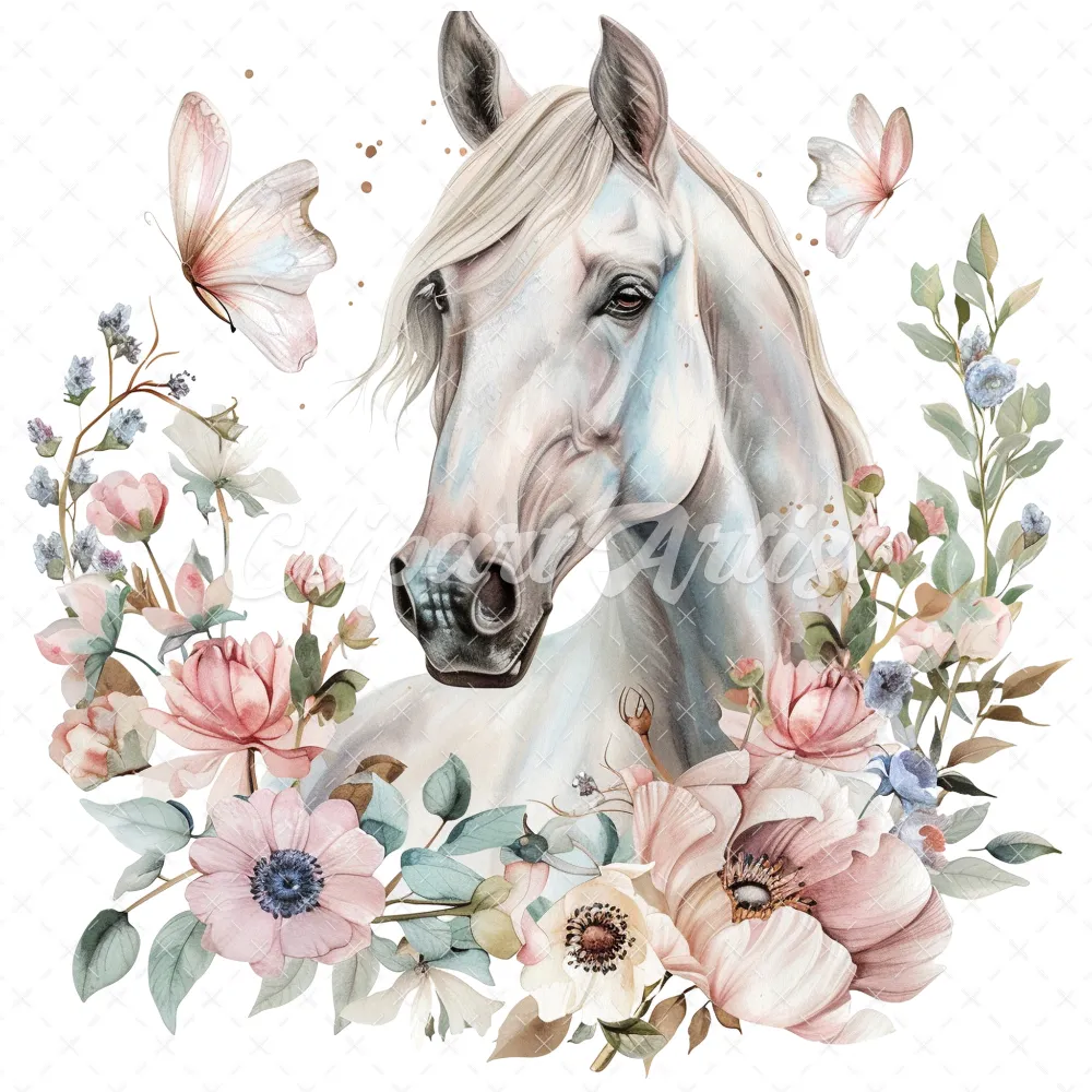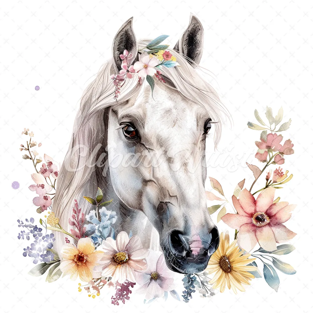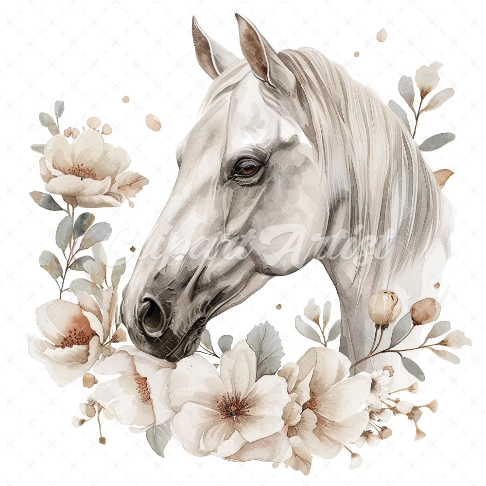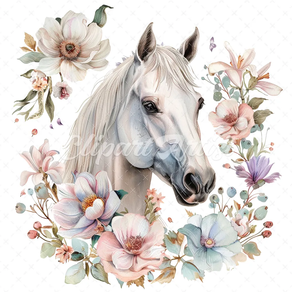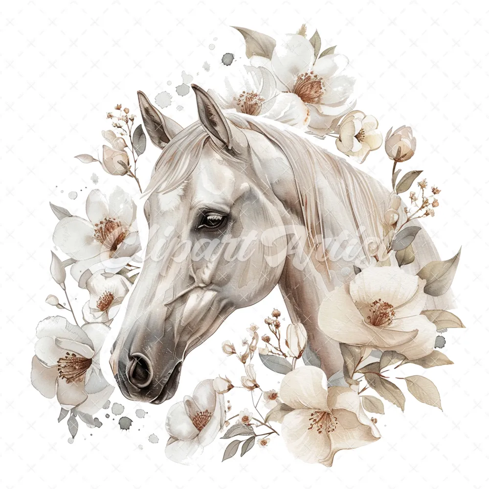 20 High-Quality White Floral Horse Clipart – White horse digital watercolor JPG instant download for commercial use – Digital download