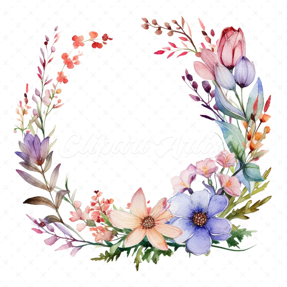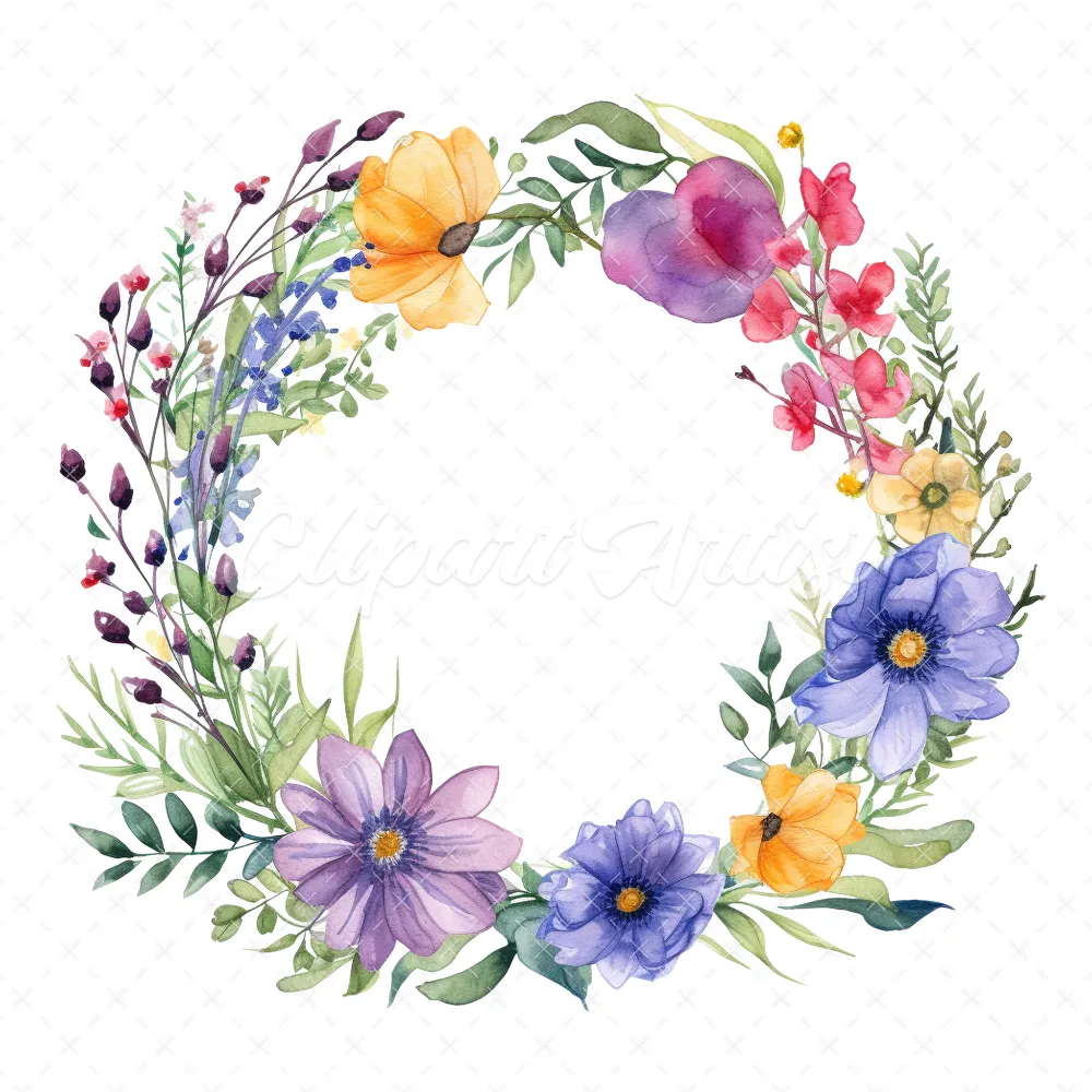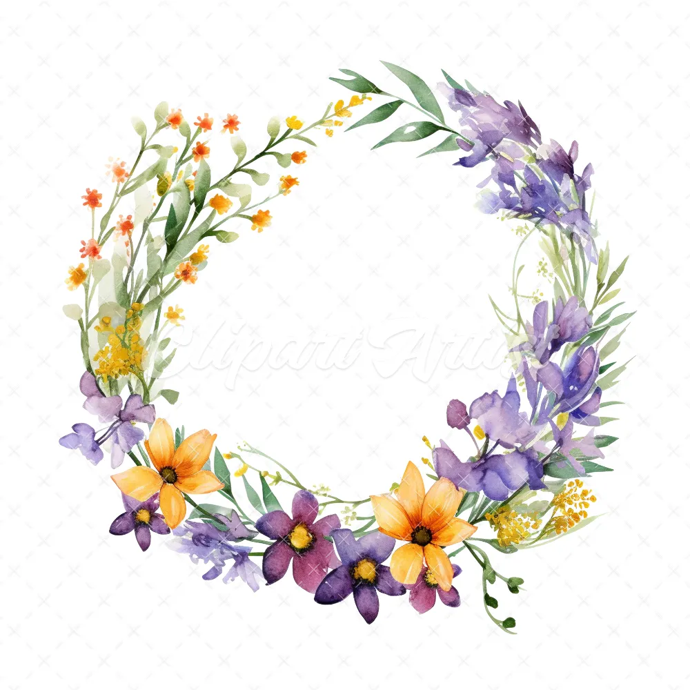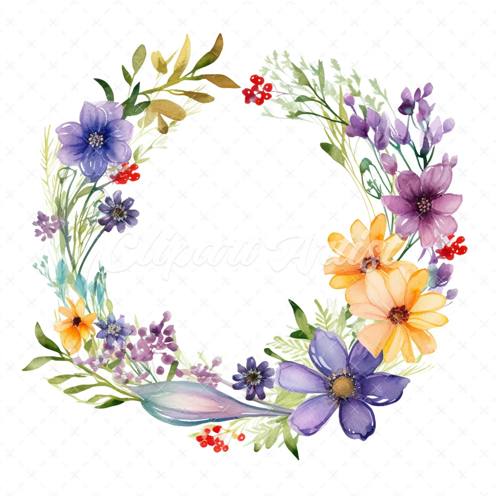 20 High-Quality Wildflowers Wreath Clipart – Wildflower wreath digital watercolor JPG instant download for commercial use – Digital download