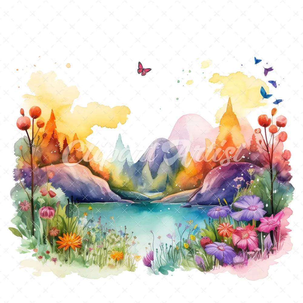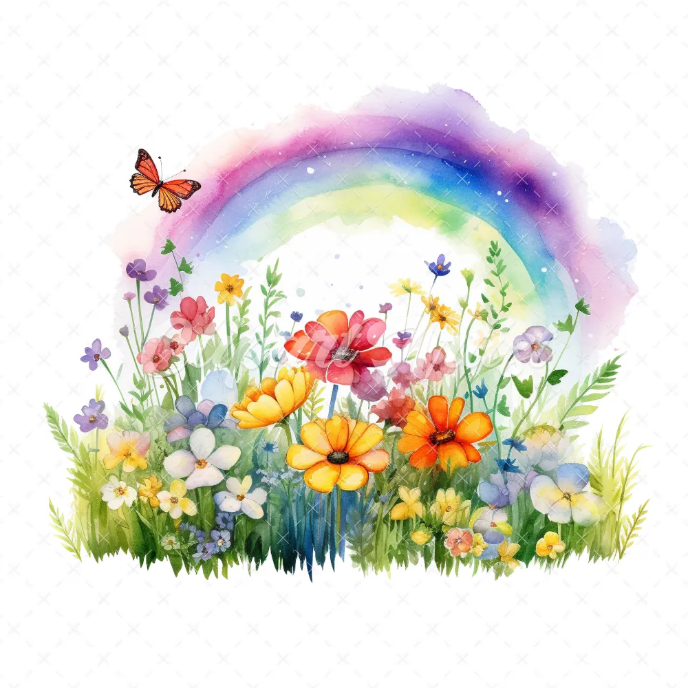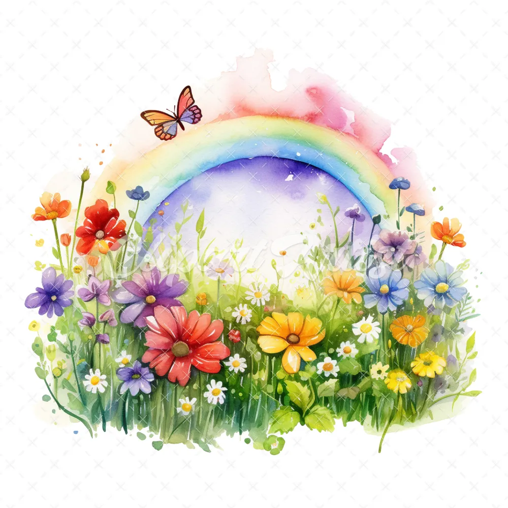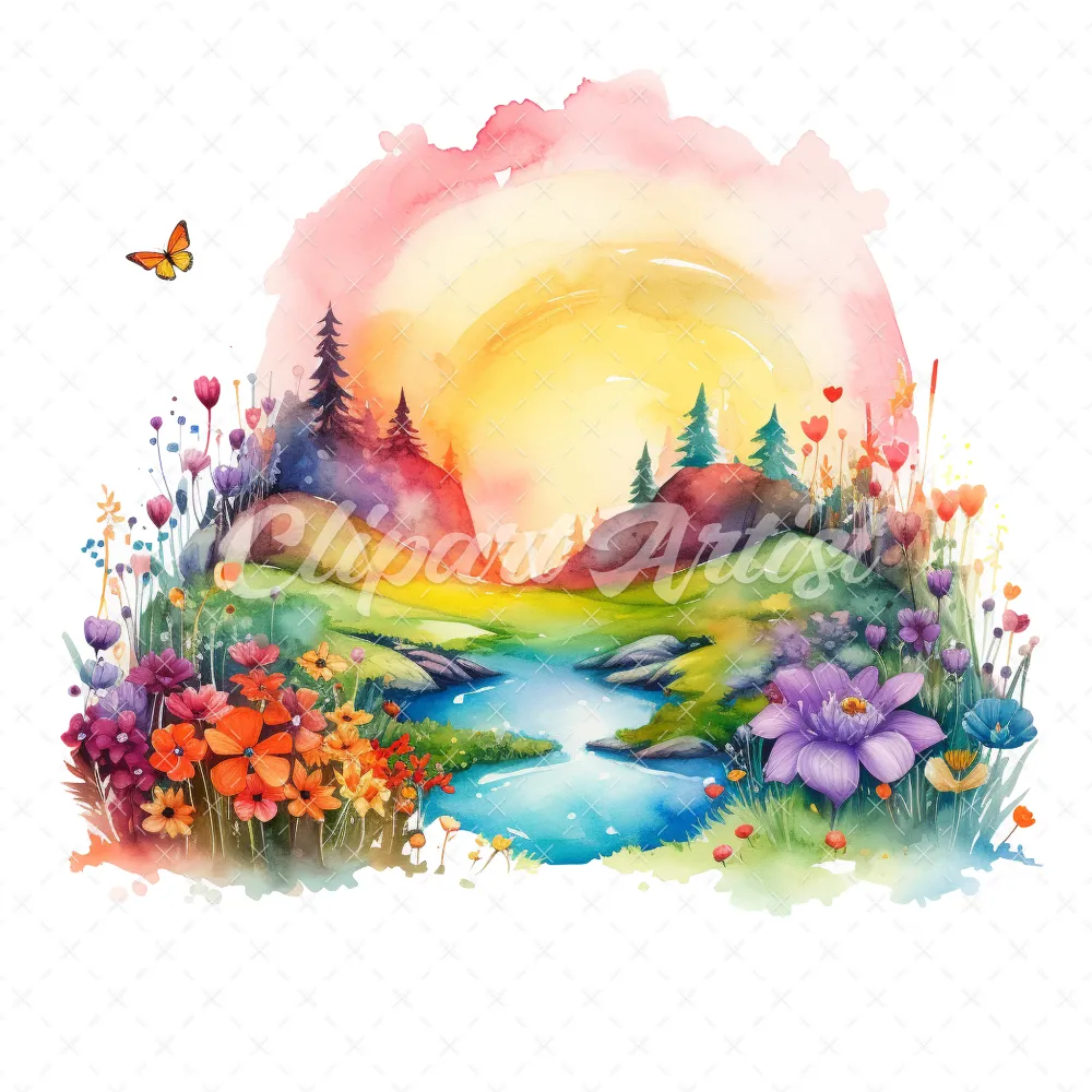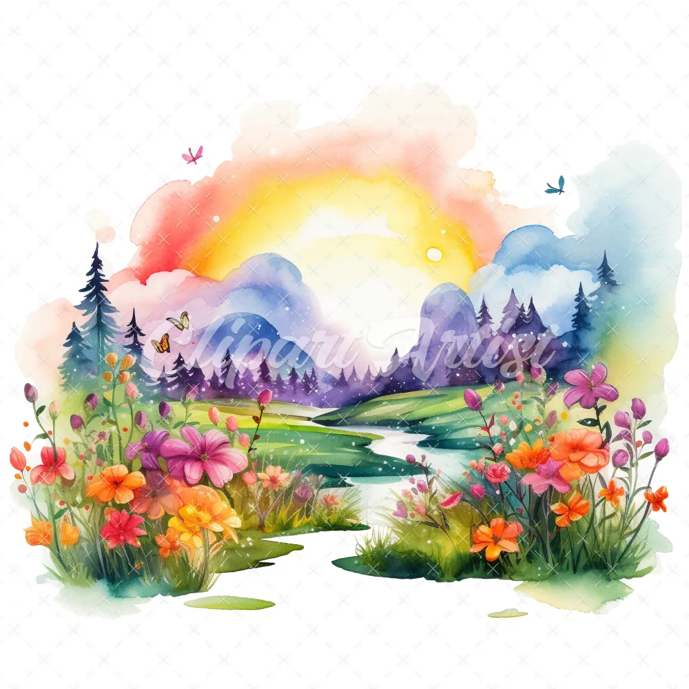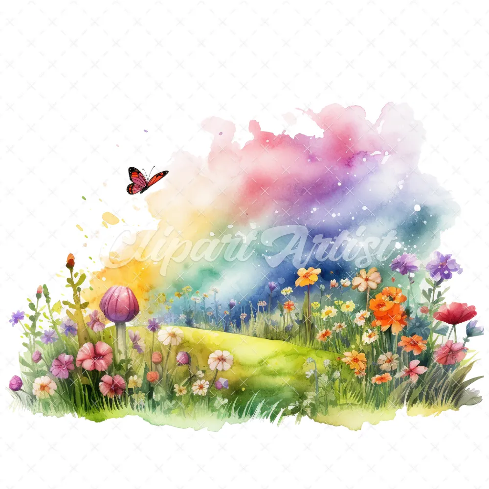 22 High-Quality Rainbow Meadow Clipart – Rainbow meadow digital watercolor JPG instant download for commercial use – Digital download