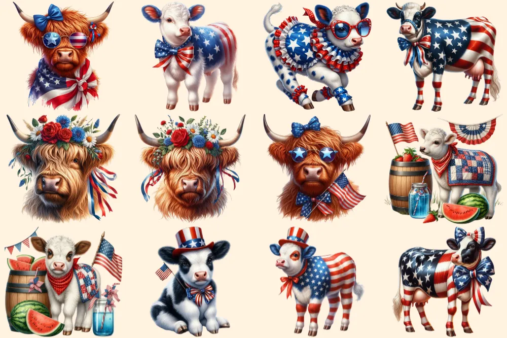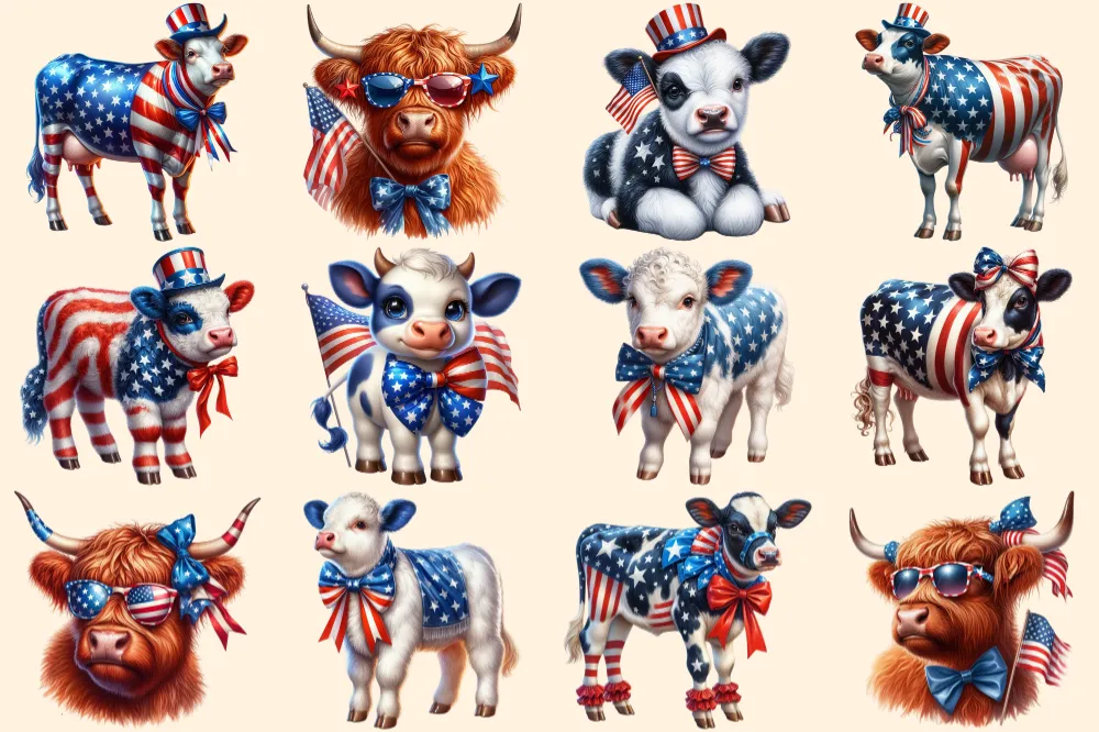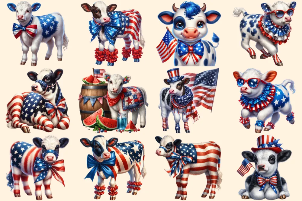 4th of July Cows PNG Clipart Collection – 55 PNG, American pride calf graphics, Cow printables, Commercial use, Digital download