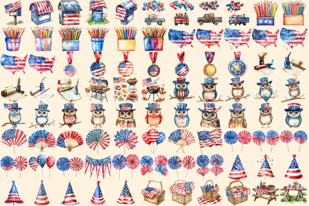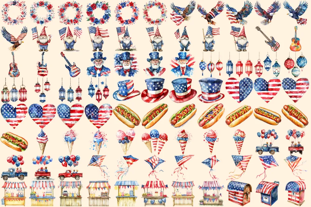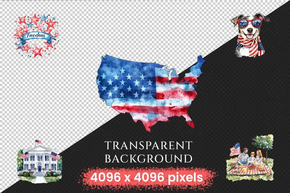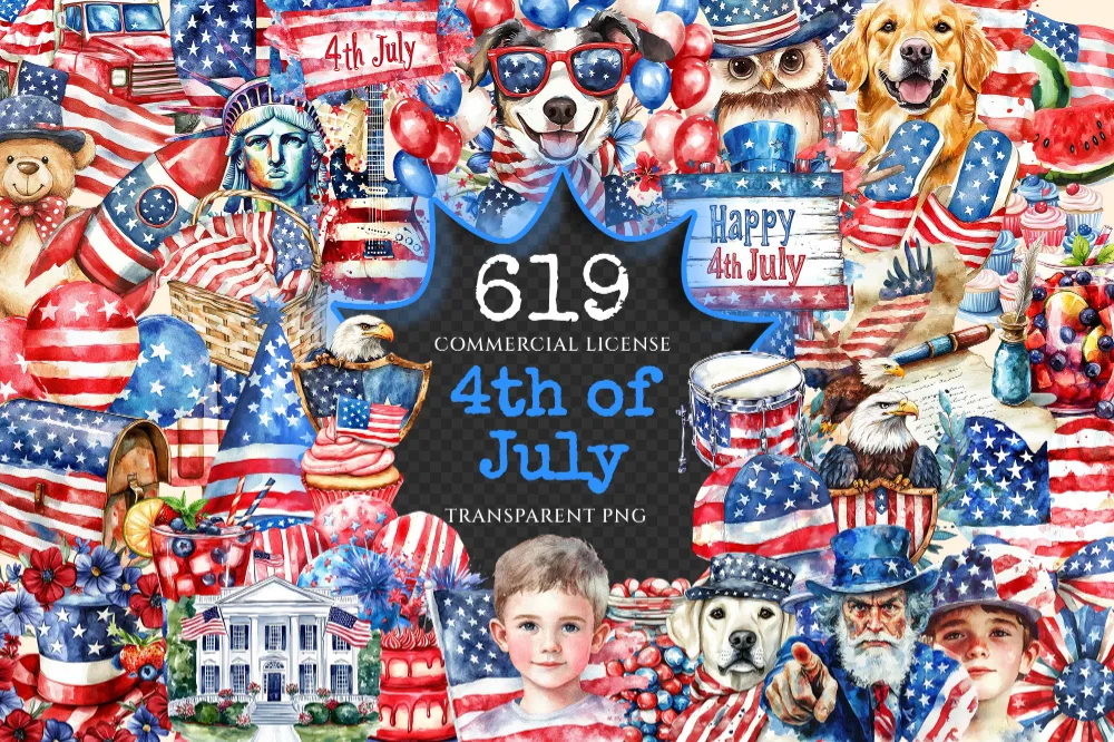 4th of July Watercolor Clipart Bundle – 615+ transparent PNG, American celebration graphics, Patriotic png, Commercial use, Digital download