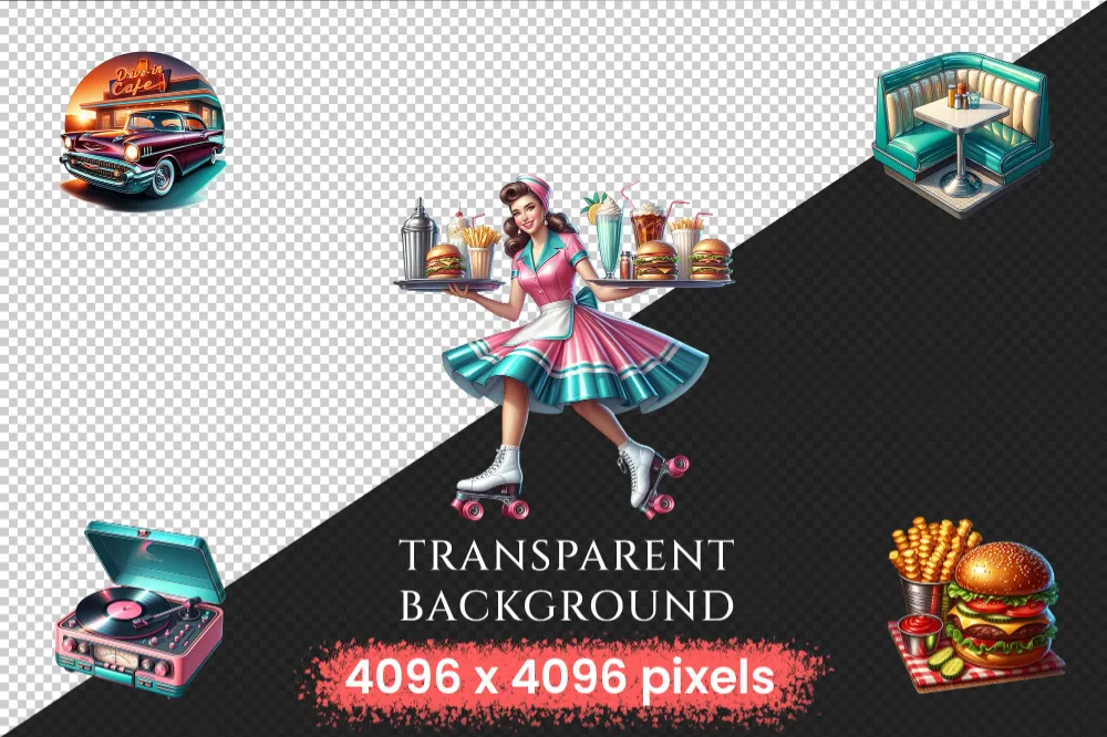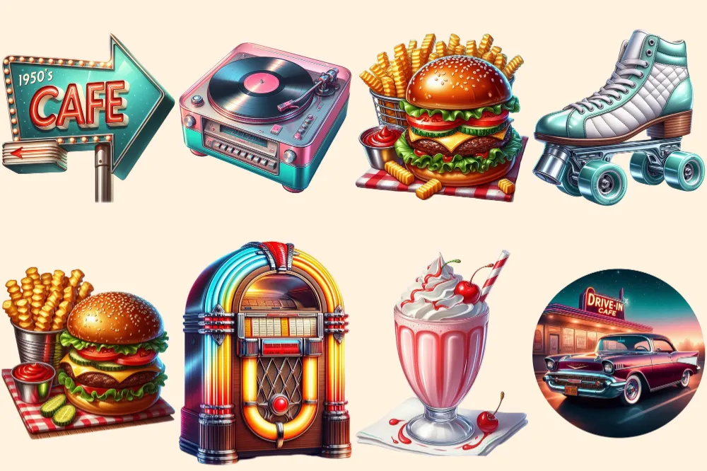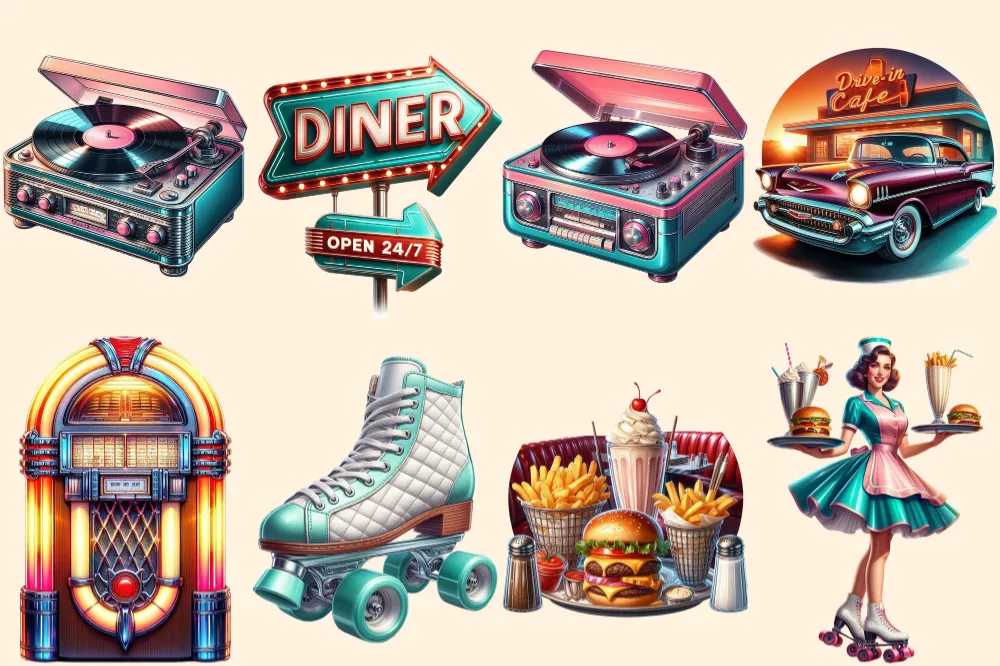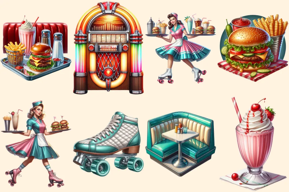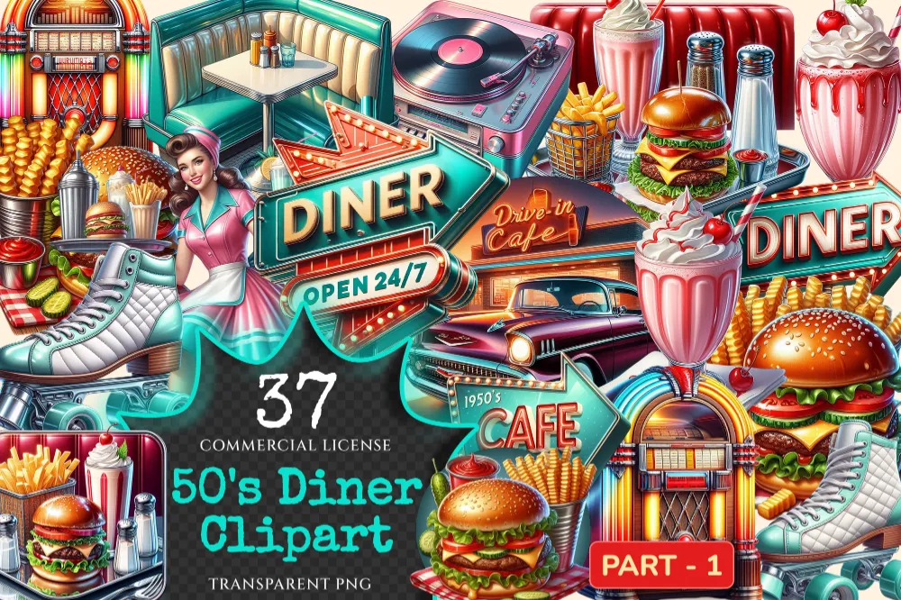 50’s Diner PNG Clipart Collection – 37 PNG, Nostalgic dining graphics, Retro aesthetic printables, Commercial use, Digital download