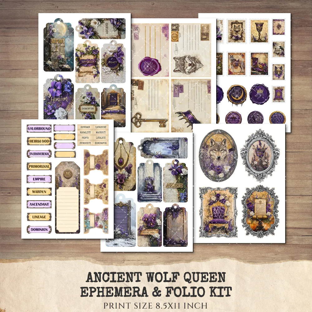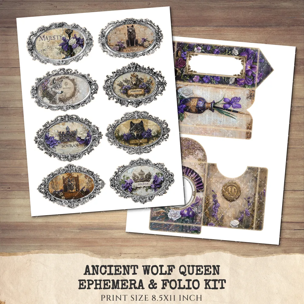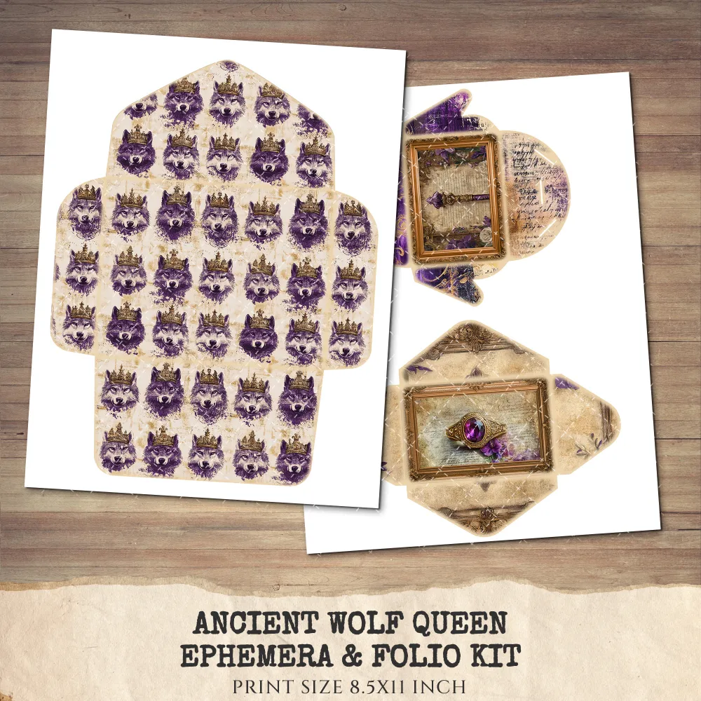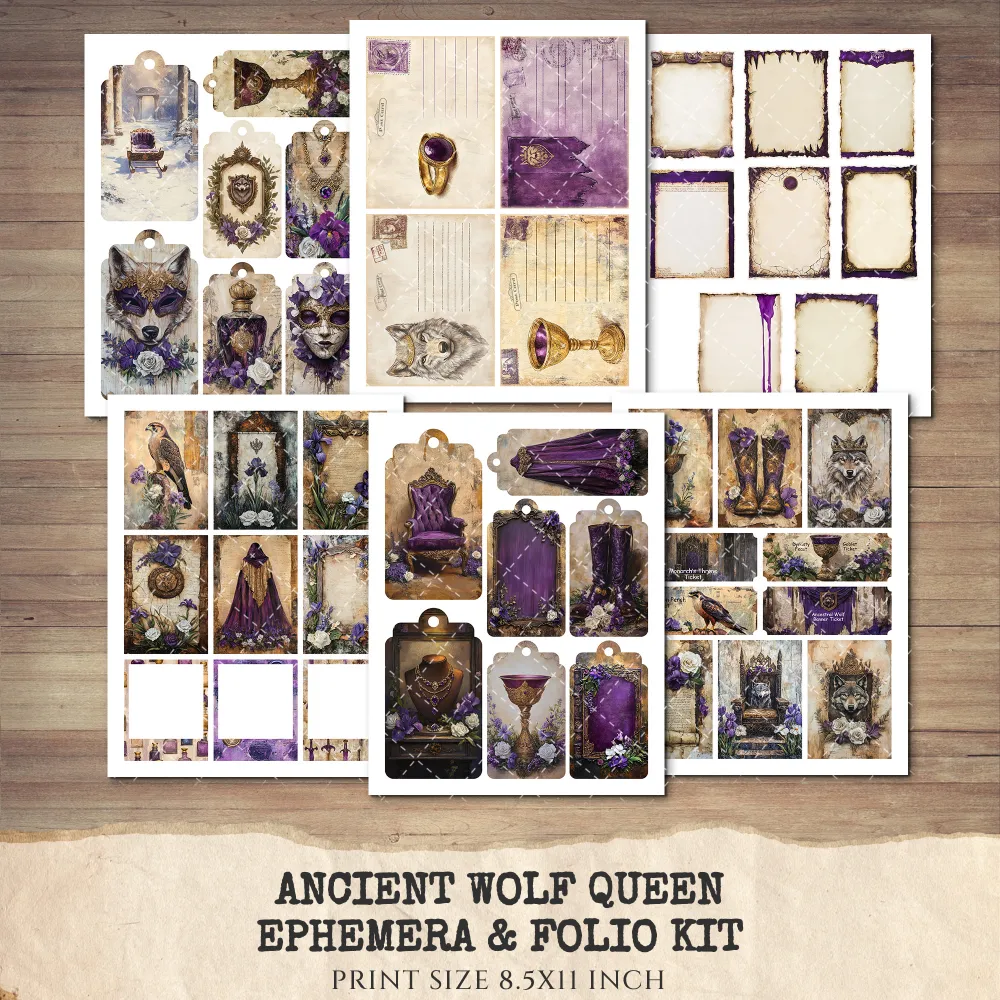 Ancient Wolf Queen Ephemera & Folio Kit – Lost Kingdom, Regal Woman Printables, Royal Purple, Throne, Crown, Kit, Digital Download