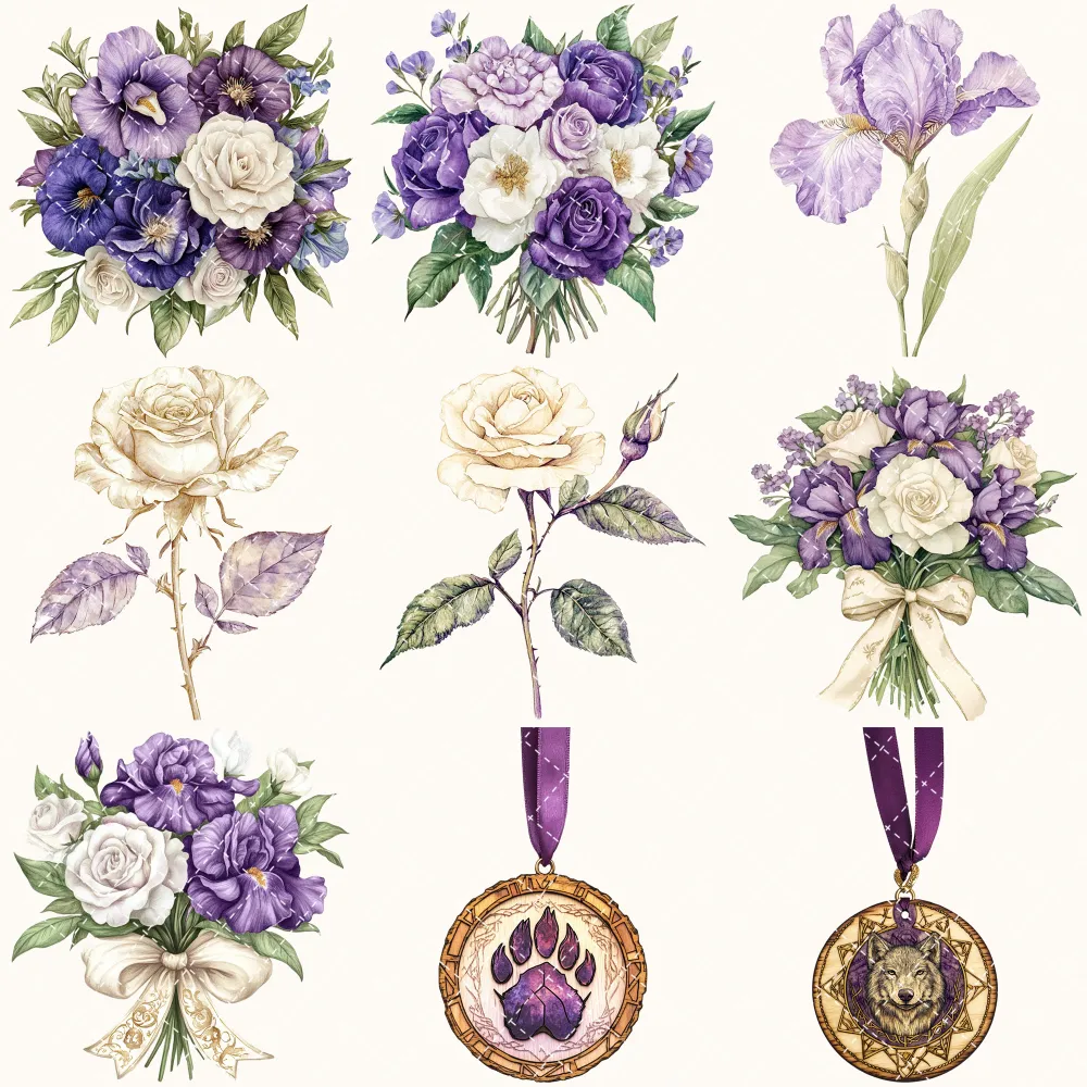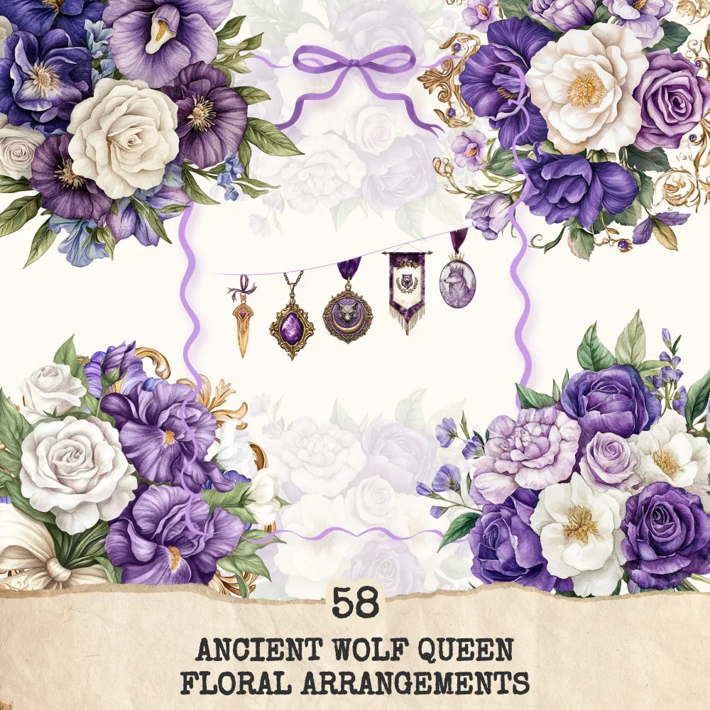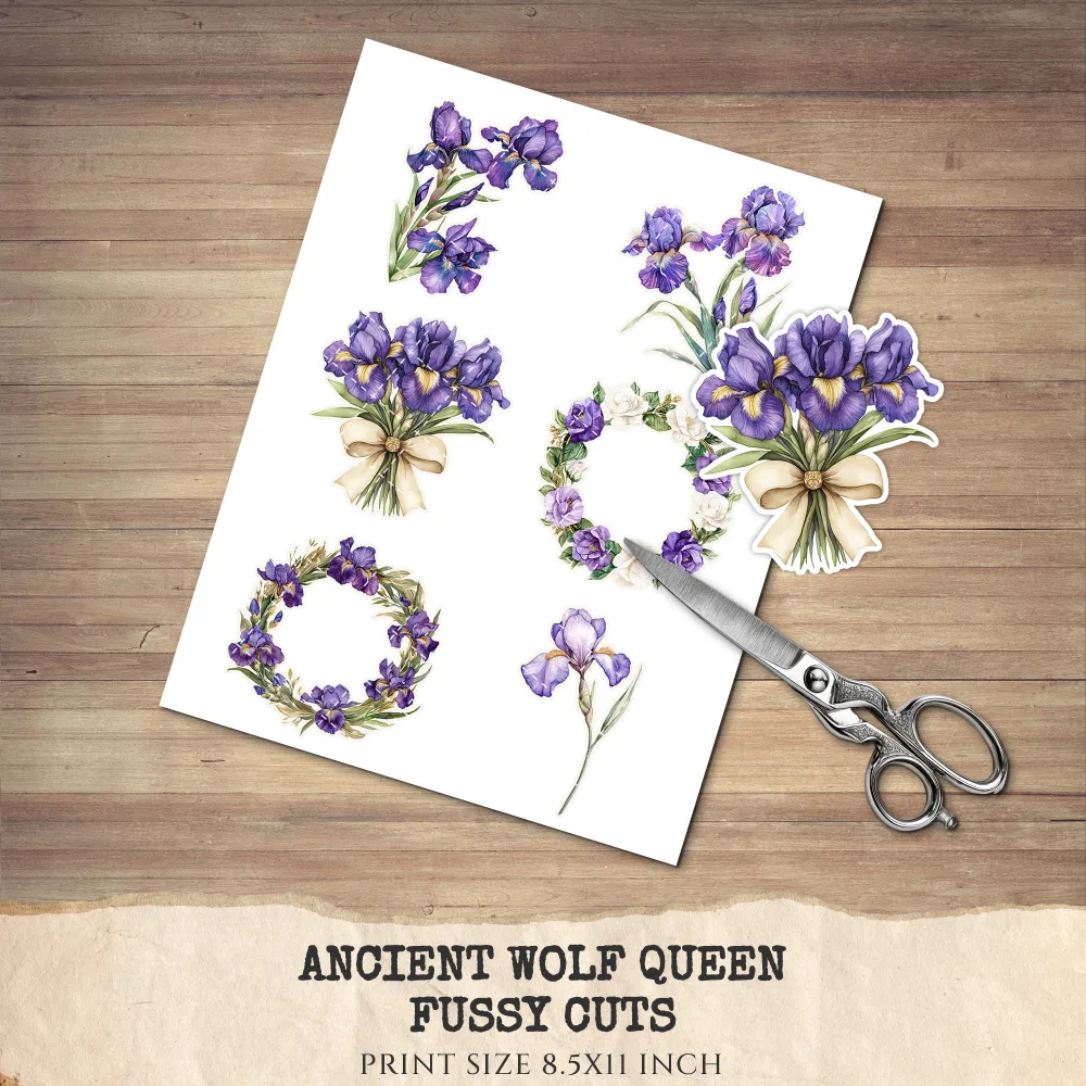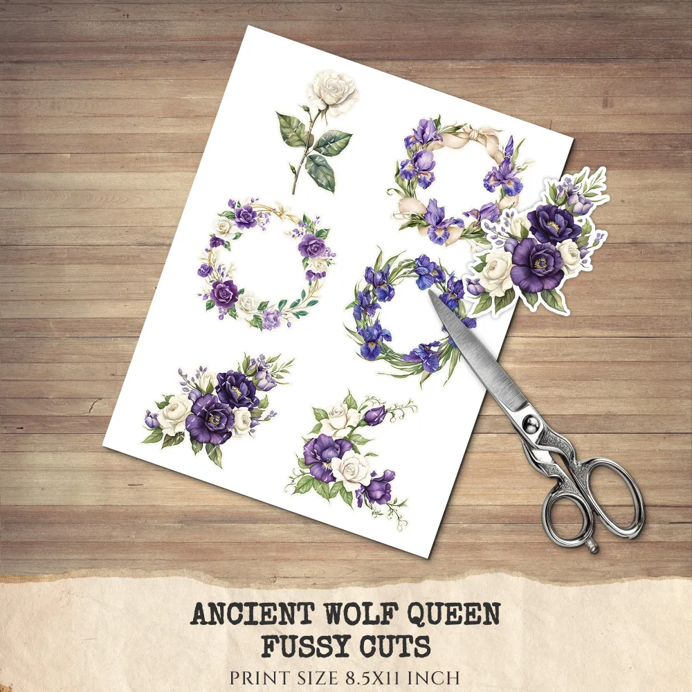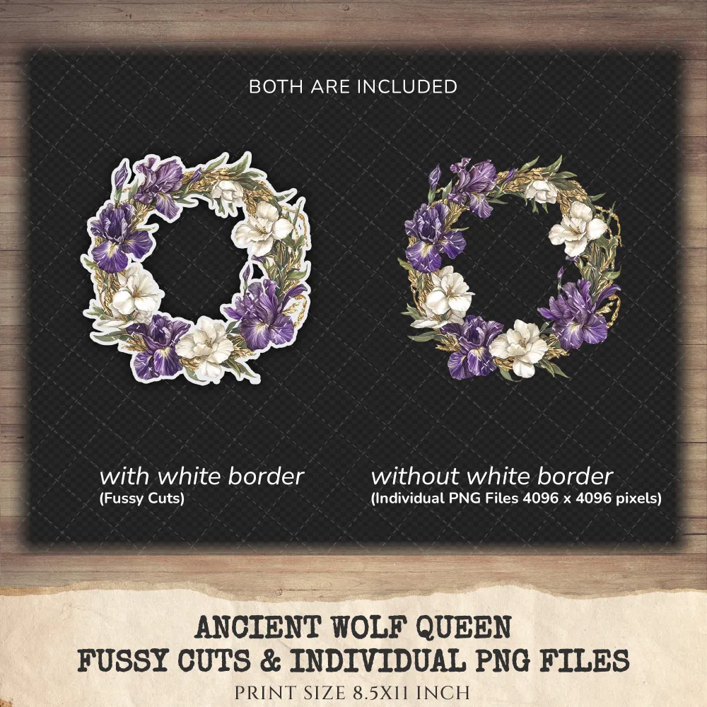 Ancient Wolf Queen Floral Arrangements, Purple Iris Floral PNG, White Rose Bouquet, Flower Art, Ancient Decor, Ornaments, Digital download