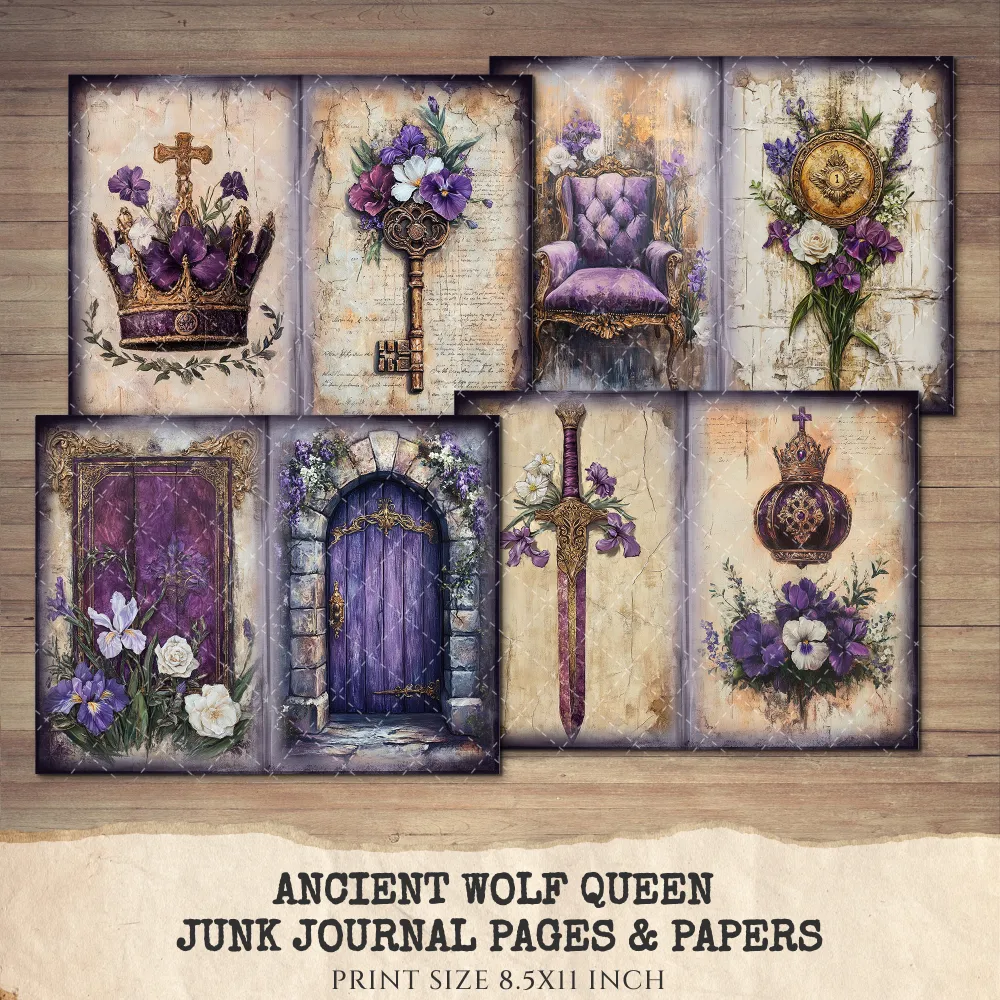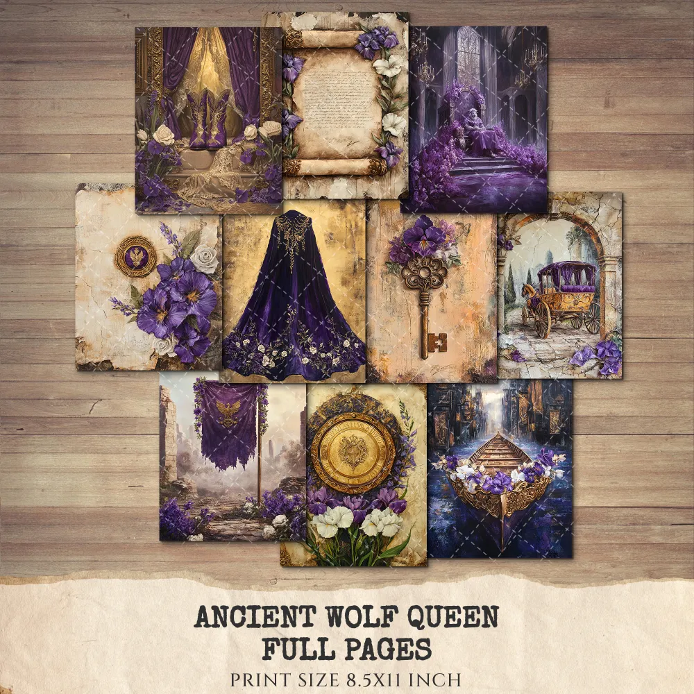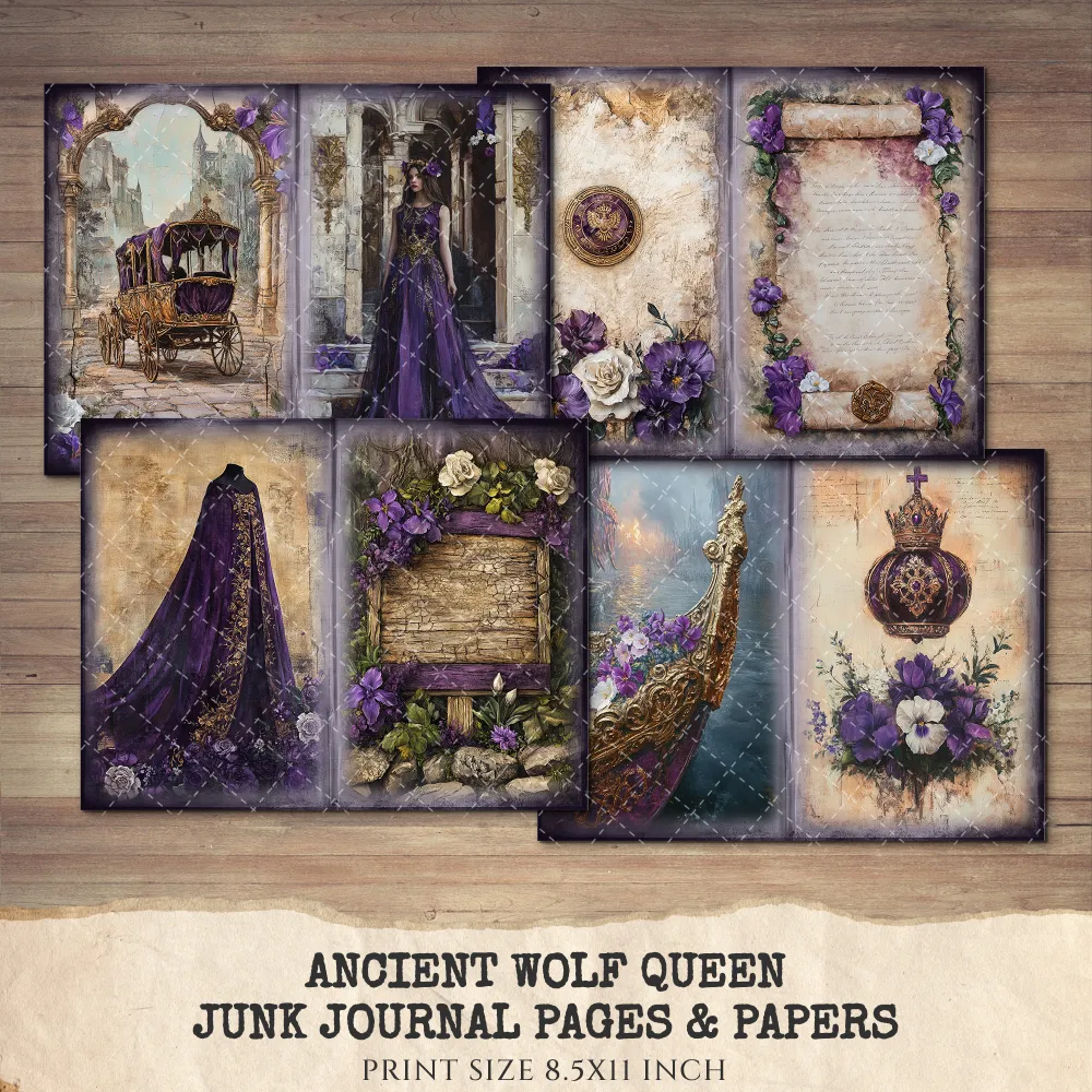 Ancient Wolf Queen Junk Journal Pages & Papers – Regal Woman, Lost Kingdom Printable, Royal Purple Scrapbook, Throne, Digital Download