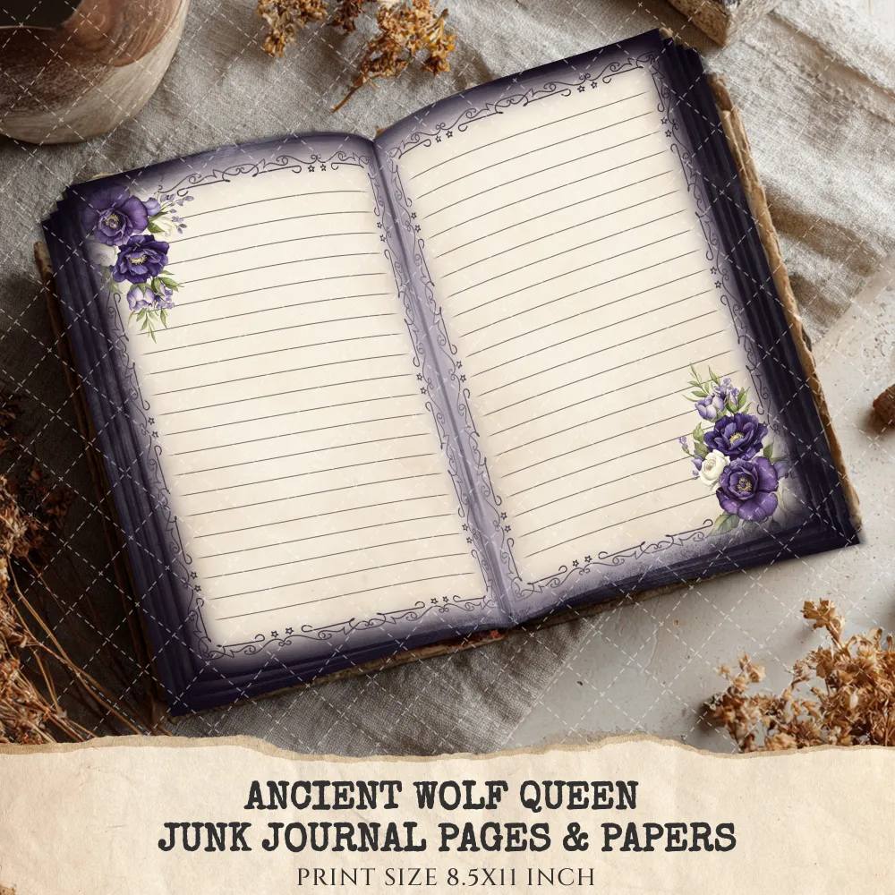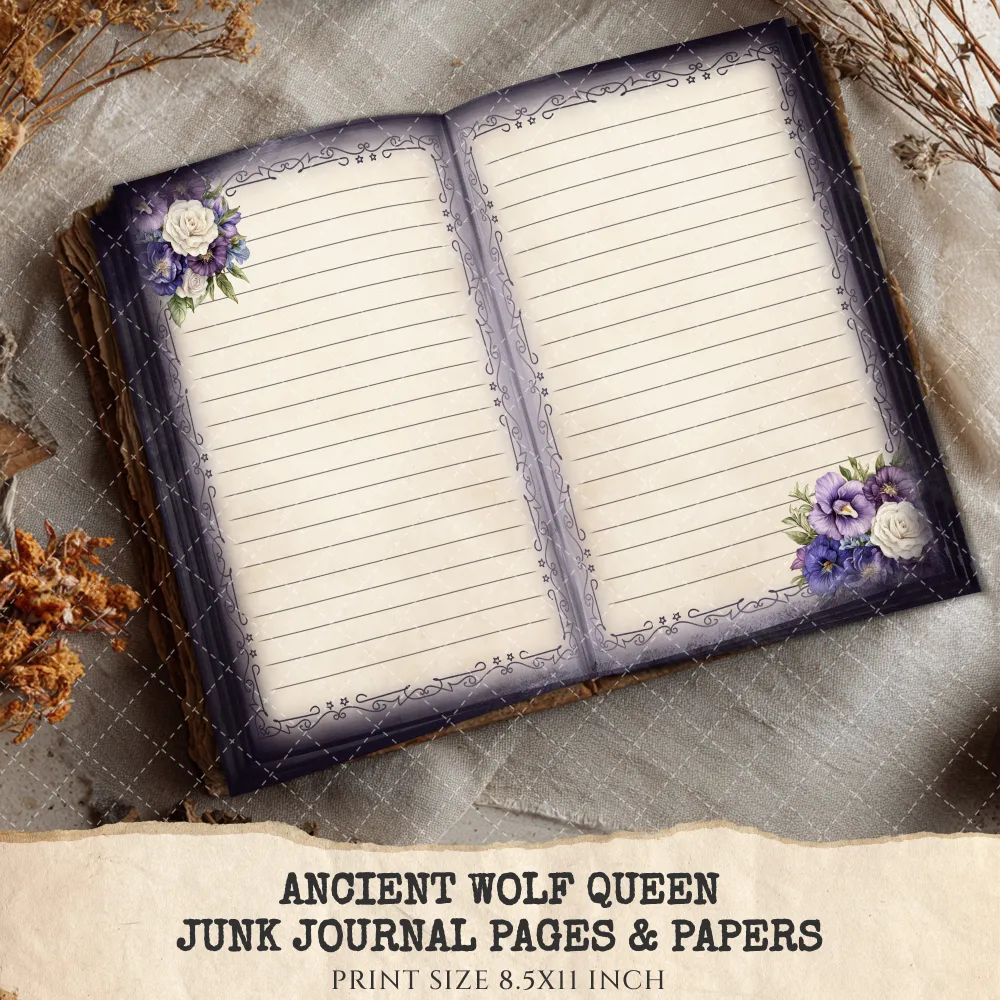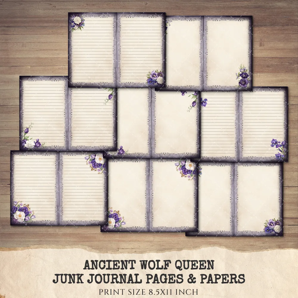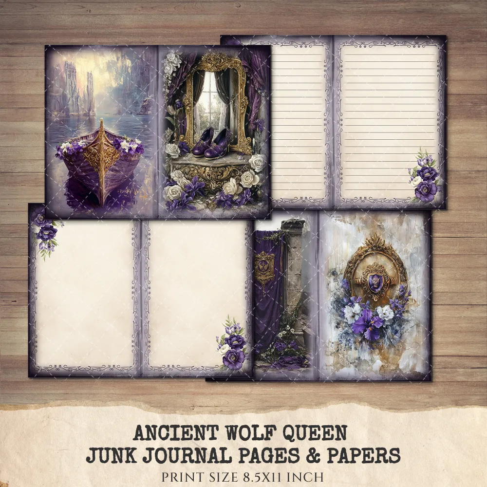Ancient Wolf Queen Junk Journal Pages & Papers – Regal Woman, Lost Kingdom Printable, Royal Purple Scrapbook, Throne, Digital Download