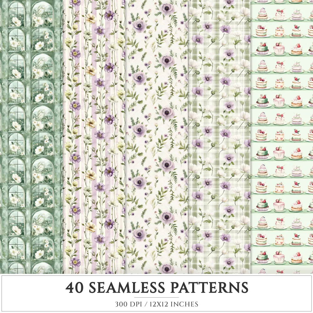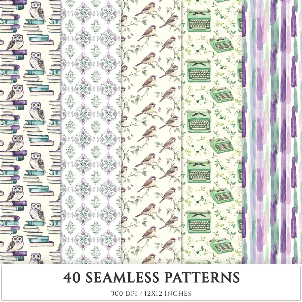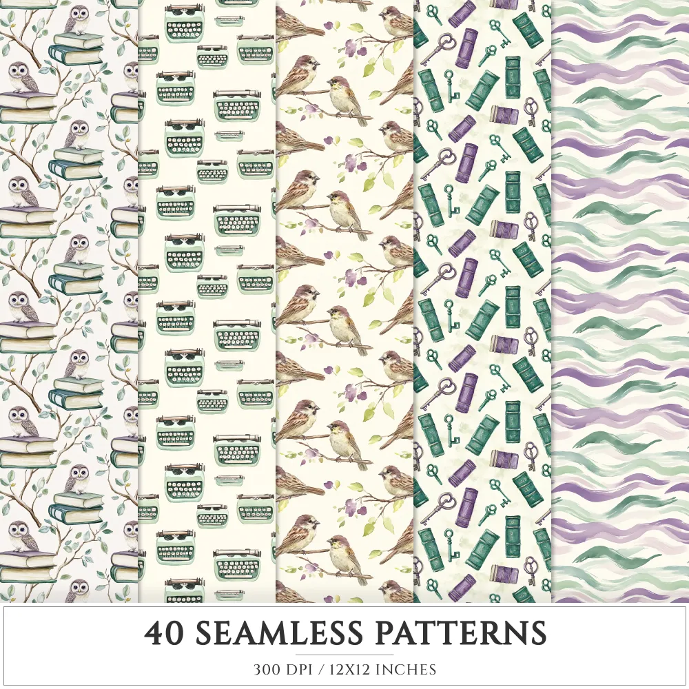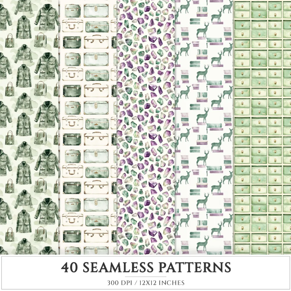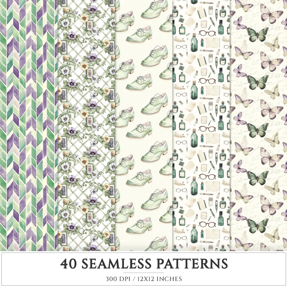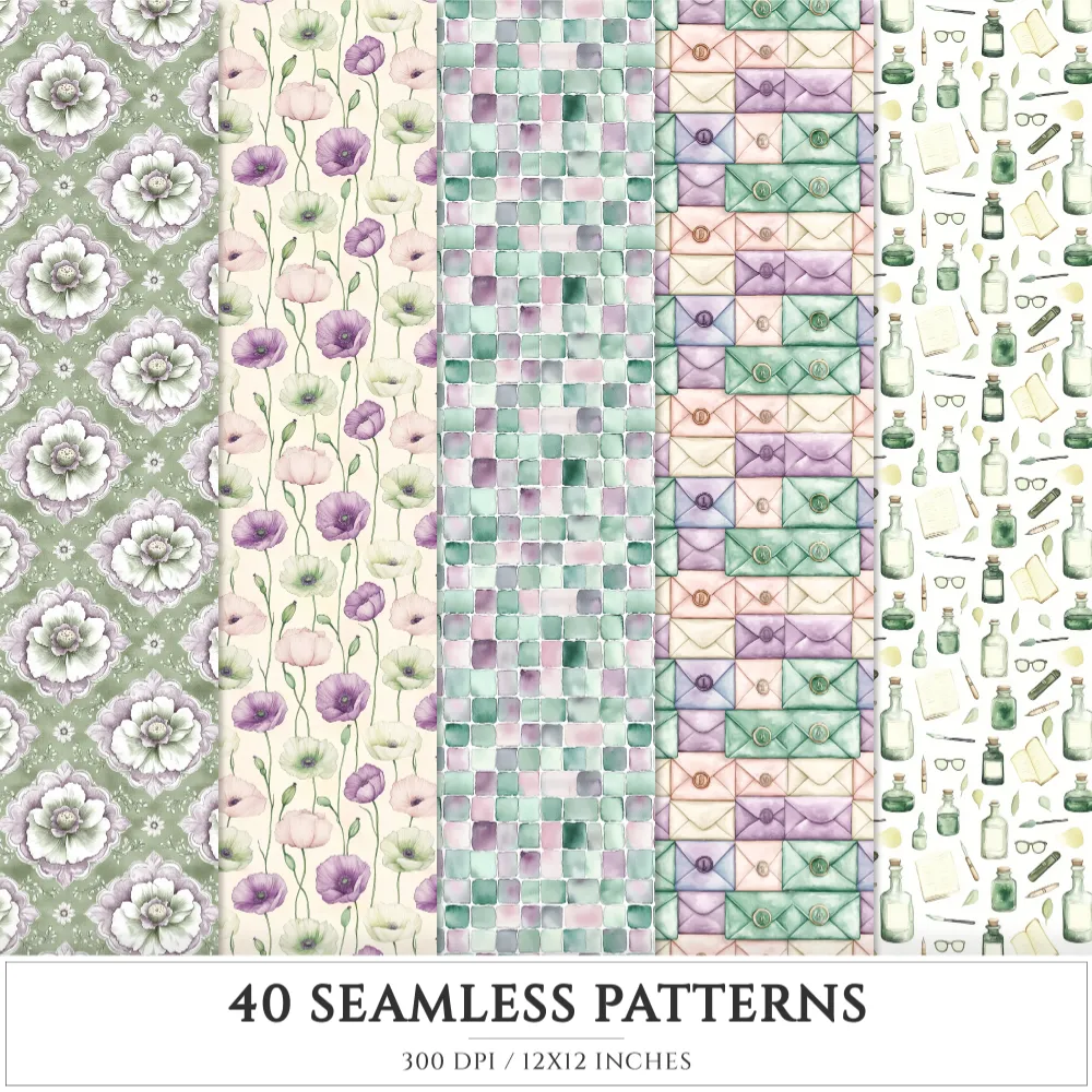 Arcane Reading Seamless Patterns, Magical Book JPEG, Poppy Floral Pattern, Forest, Vines, Crystals Repeating Pattern,Digital Scrapbook Paper