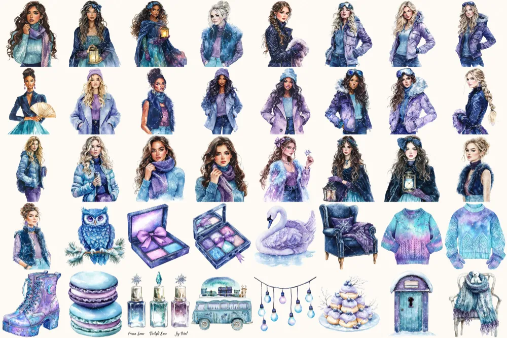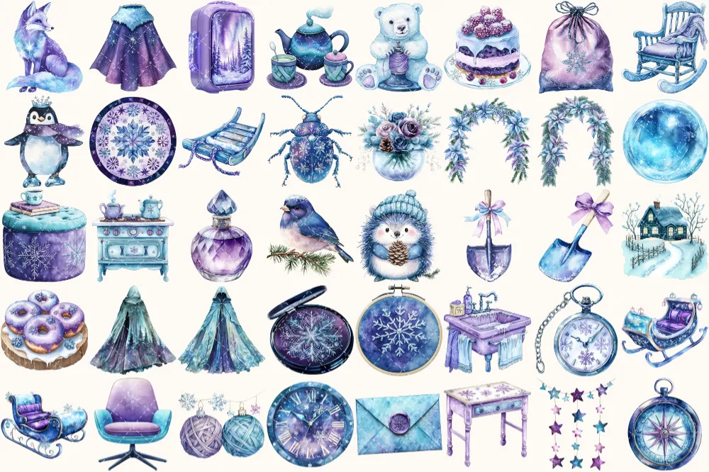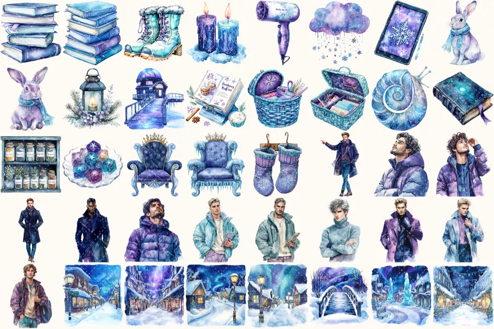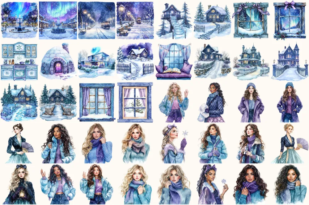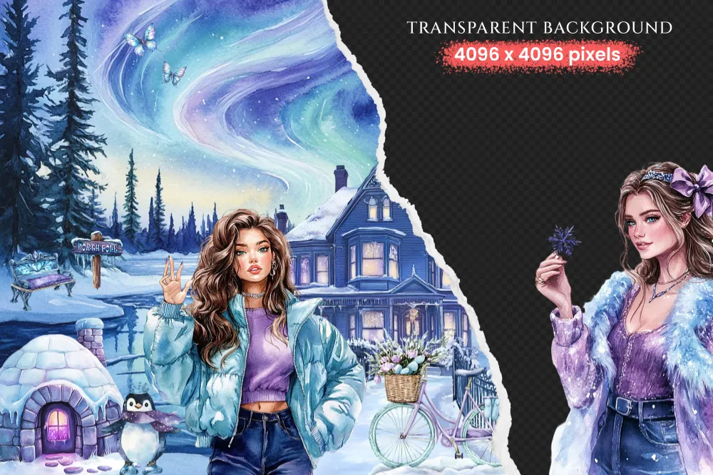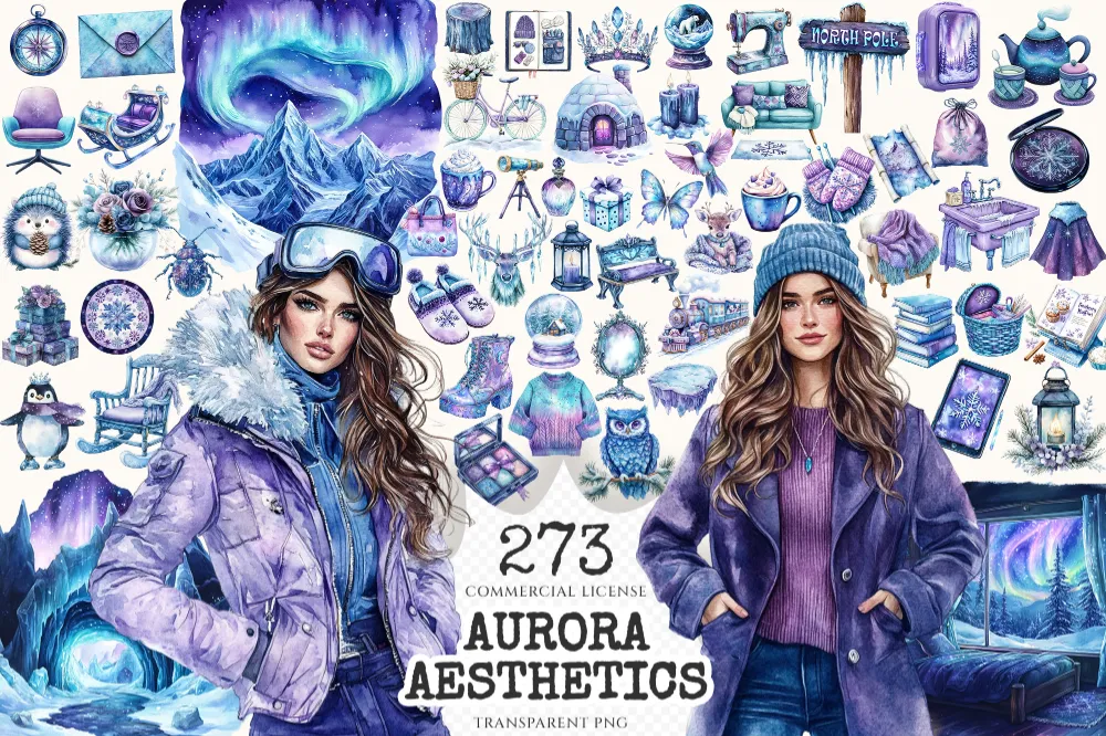 Aurora Aesthetics Watercolor Clipart Set – 270+ transparent PNG, Frosty winter graphics, North pole images, Commercial use, Digital download