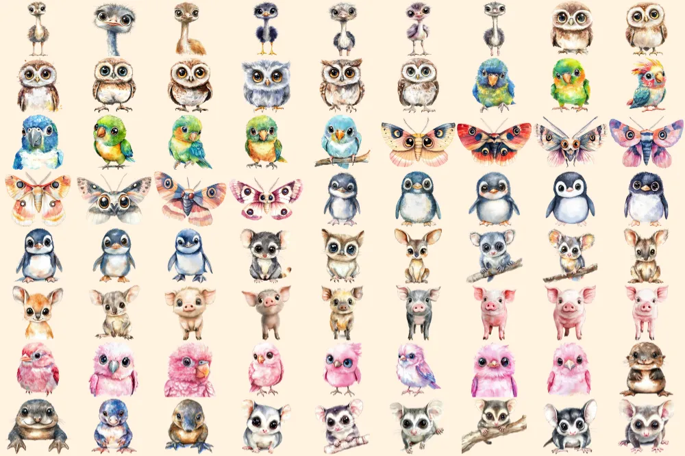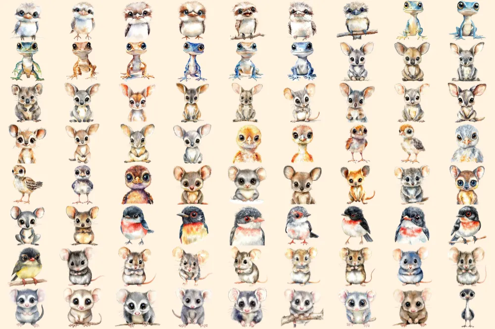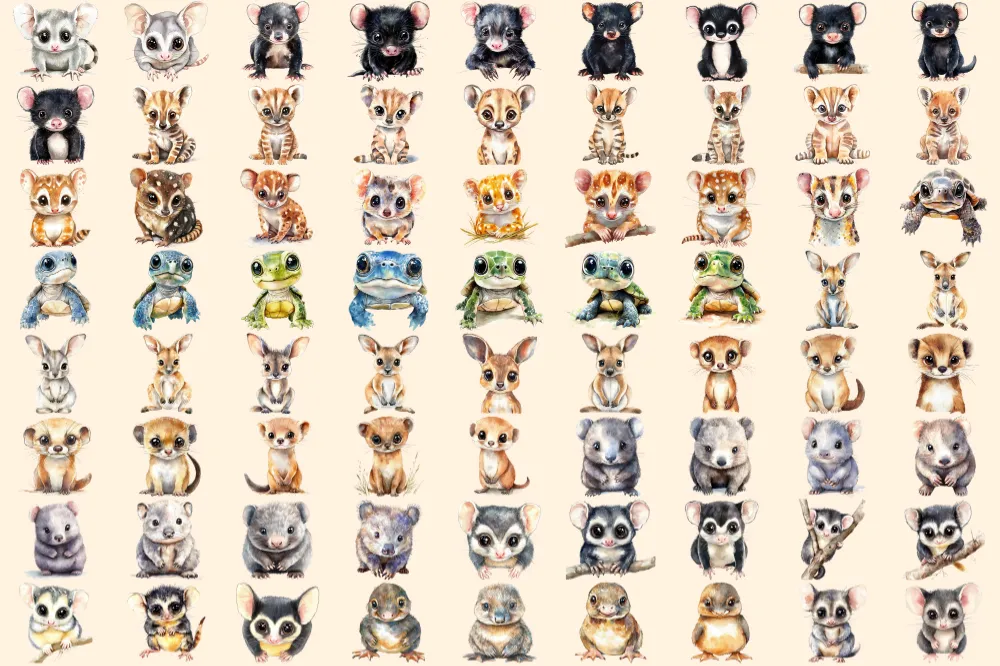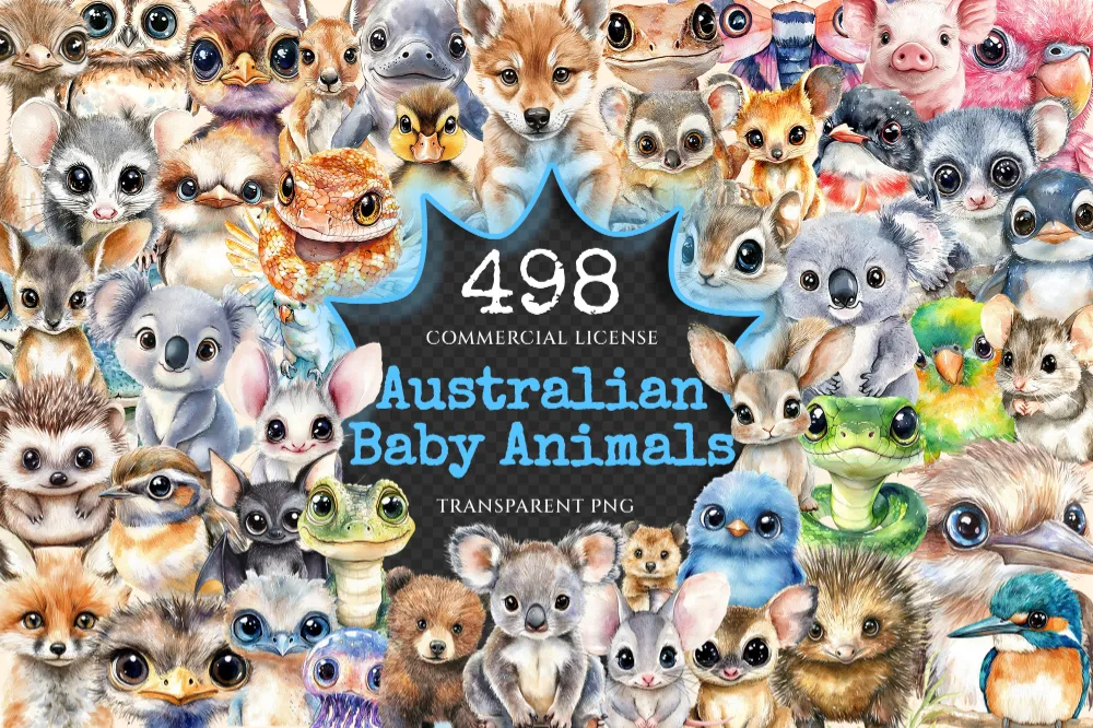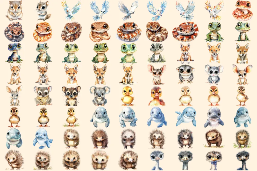 Australian Baby Animals Watercolor Clipart Bundle – 495+ transparent PNG, Aussie wildlife art,Cute creatures,Commercial use,Digital download