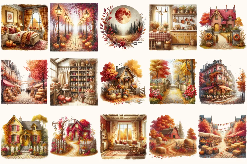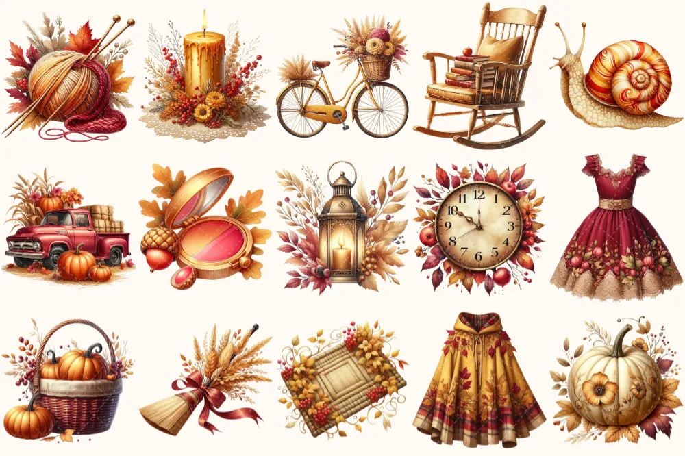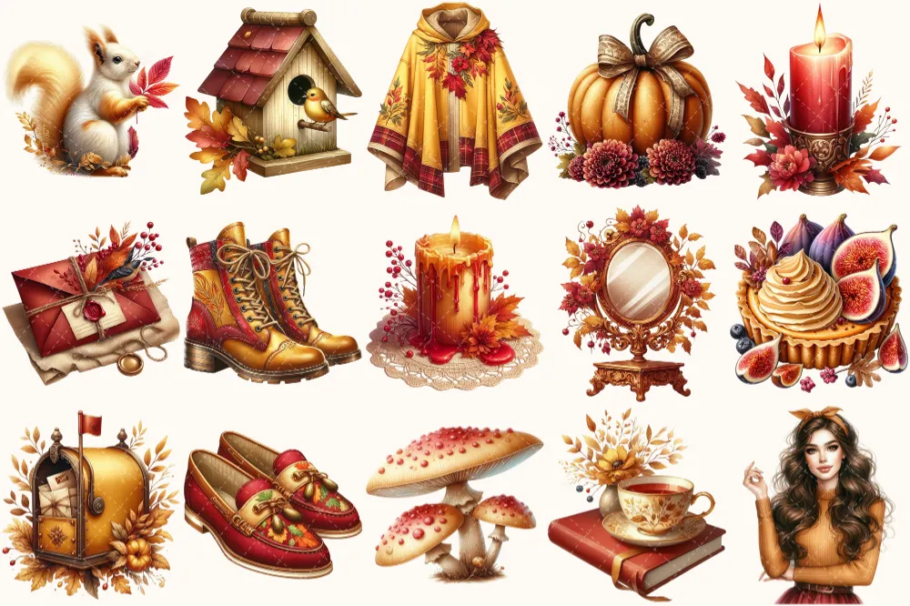 Autumn Enchantment Clipart Set – 120+ transparent PNG, Cozy autumn illustrations, Cottagecore fall images, Commercial use, Digital download