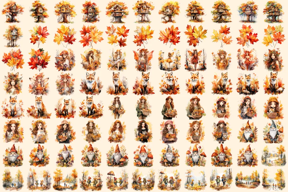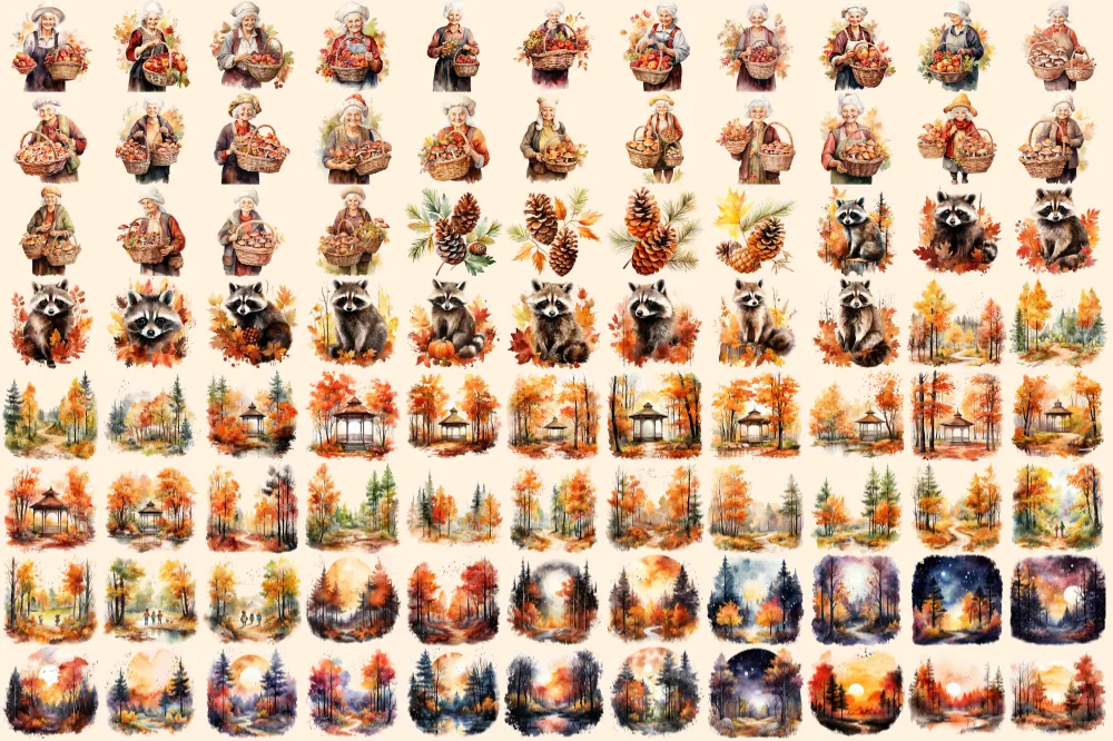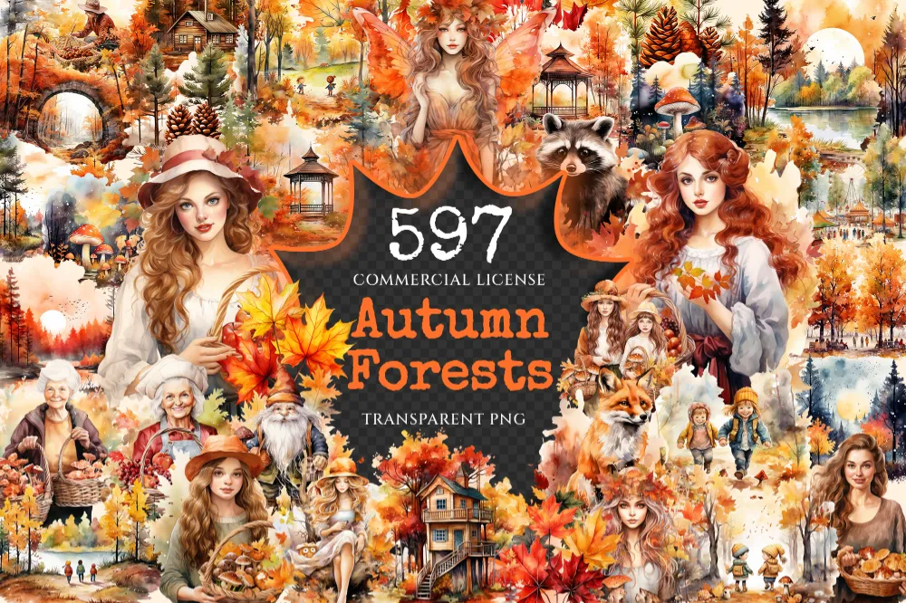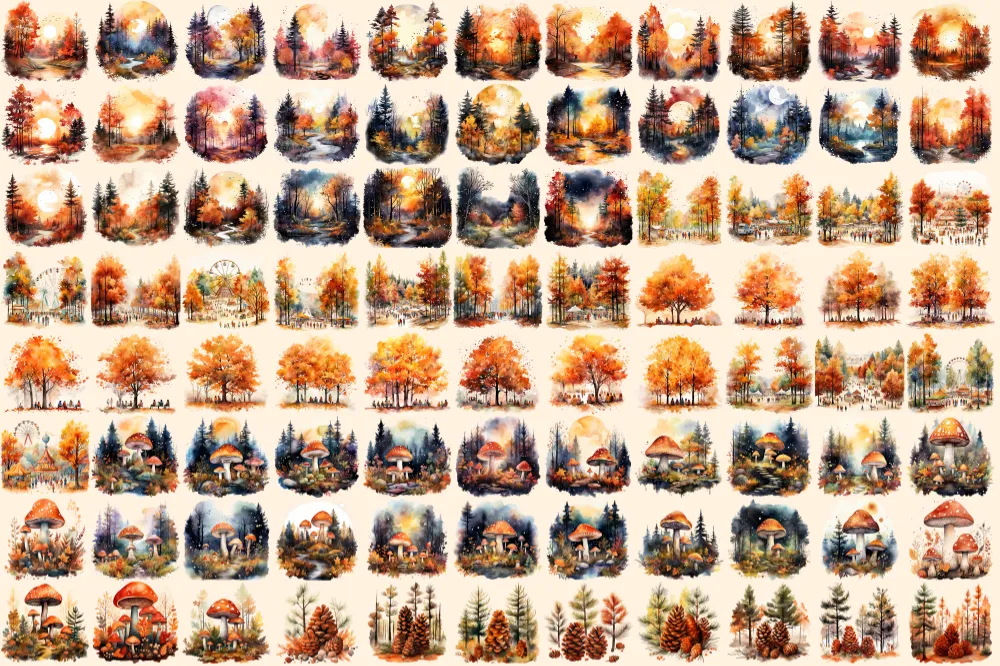 Autumn Forests Watercolor Clipart Bundle – 595+ transparent PNG, Cute woodland graphics, Autumn forest art, Commercial use, Digital download