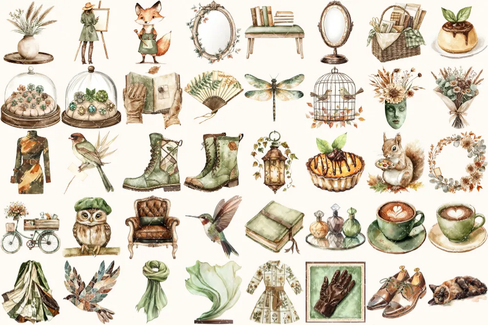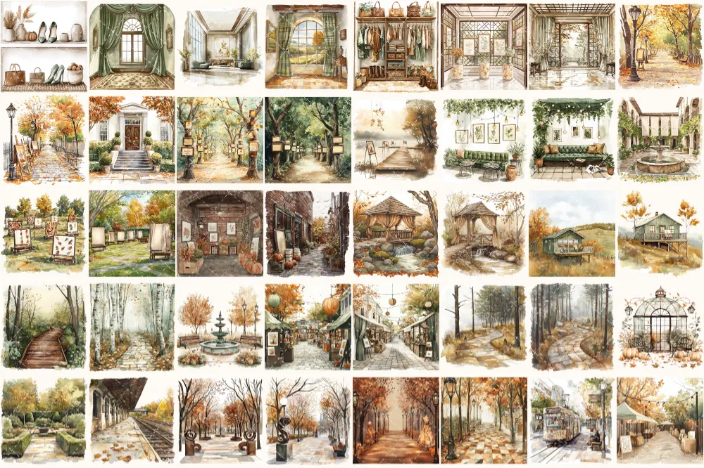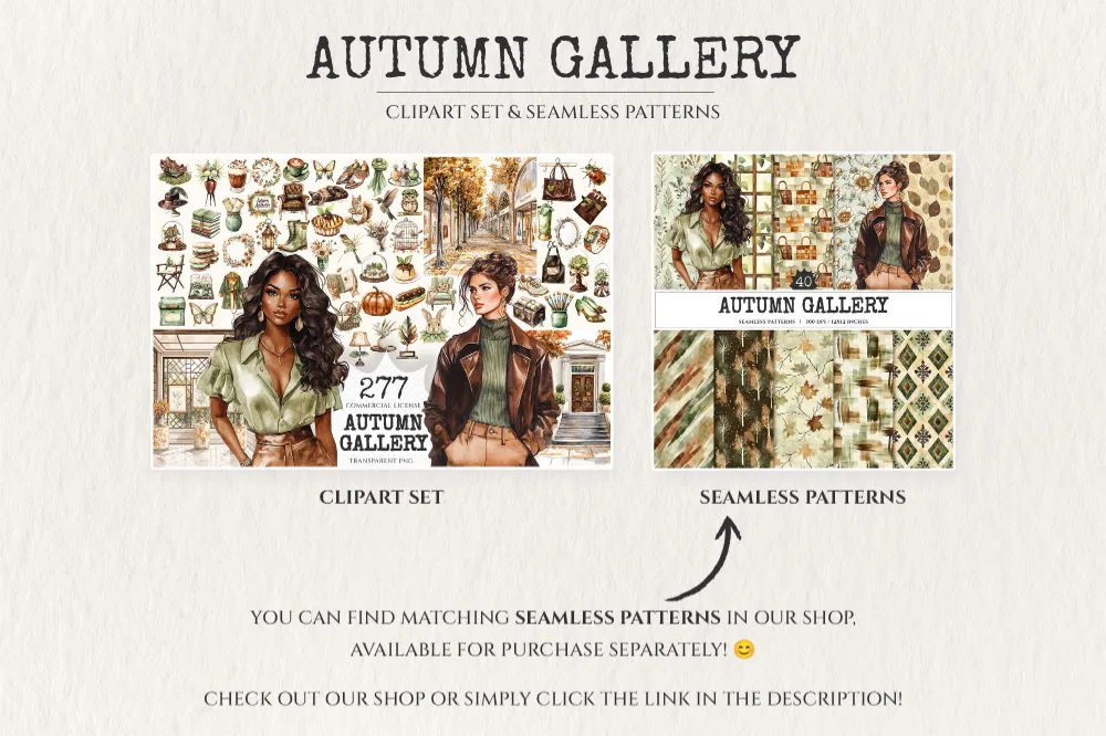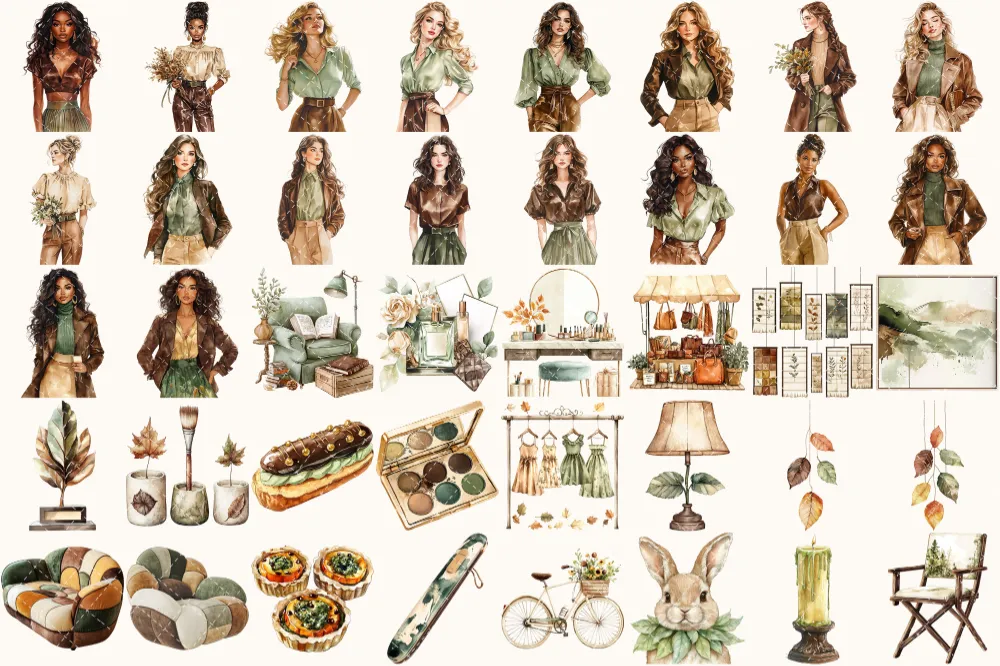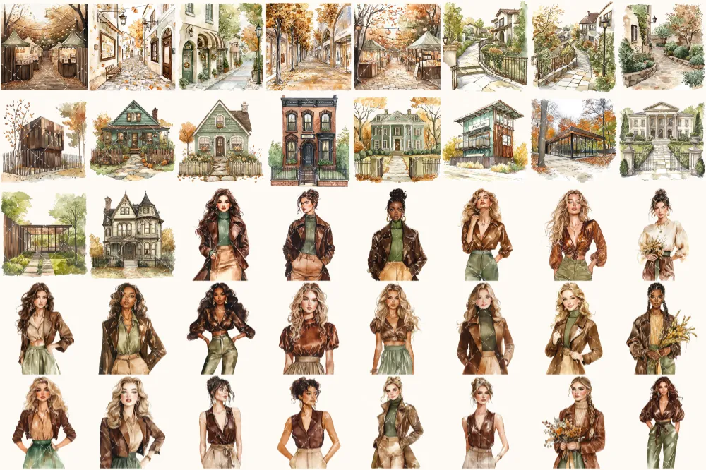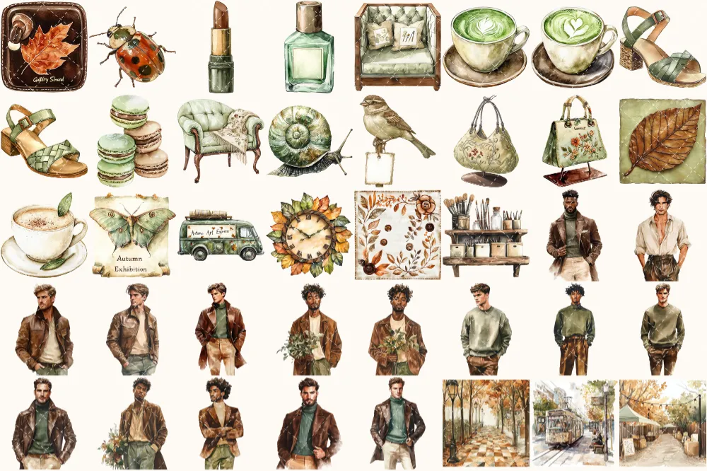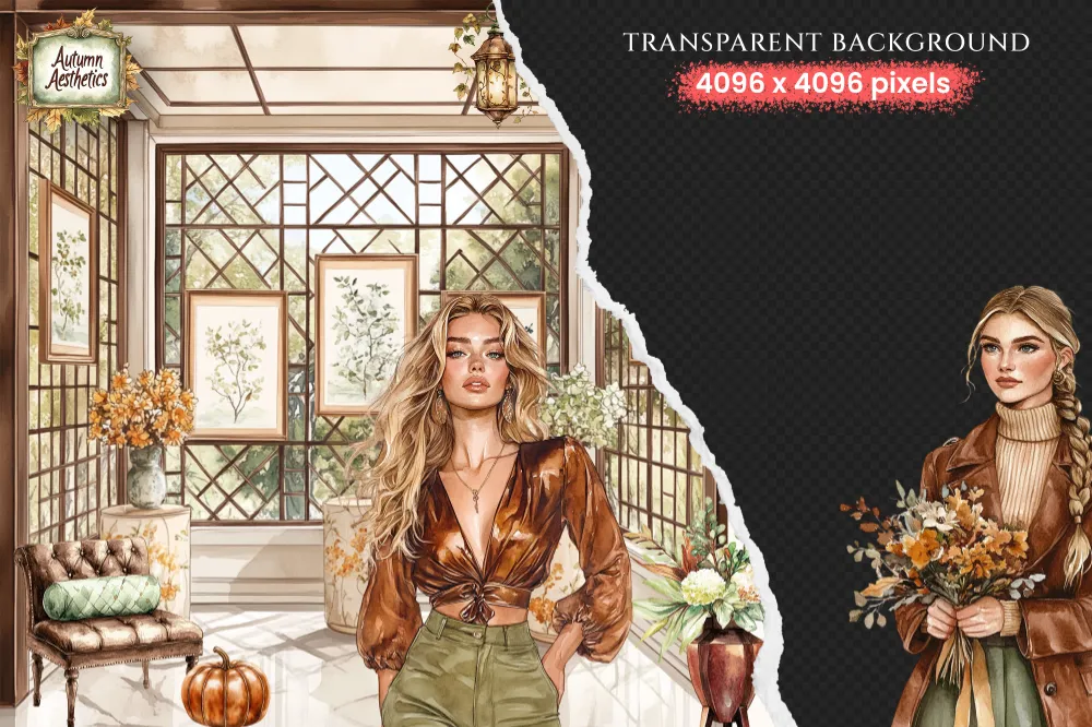 Autumn Gallery Watercolor Clipart Set – 272+ transparent PNG, Fall fashion graphics, Autumn museum images, Commercial use, Digital download