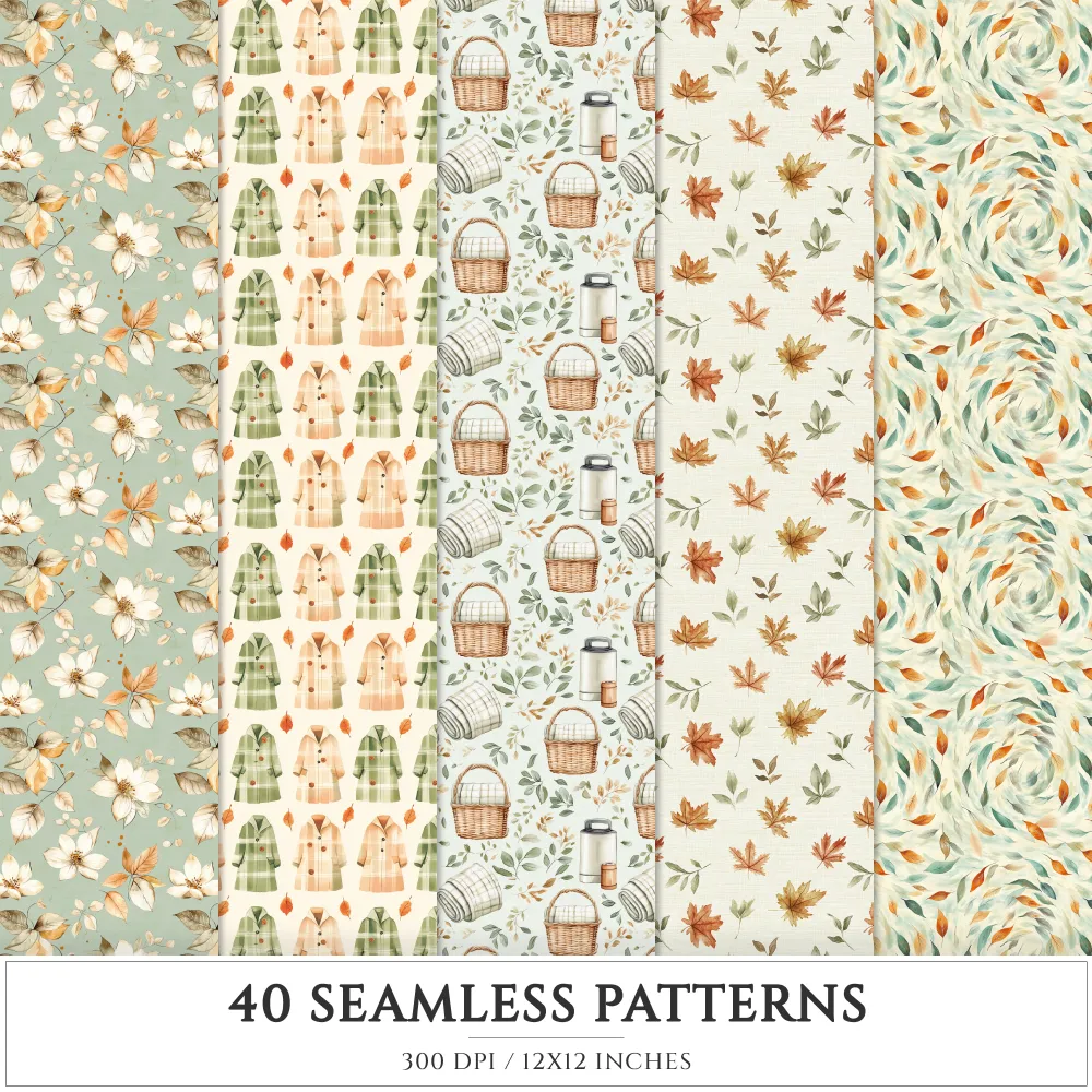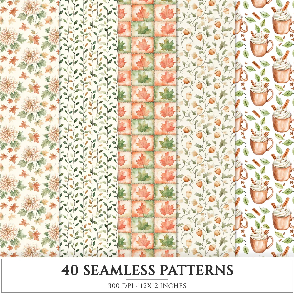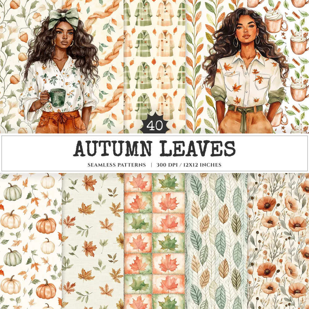 Autumn Leaves Seamless Patterns, Cozy autumn JPEG, Falling leaves pattern, Pumpkins, Foliage repeating pattern, Digital scrapbook paper