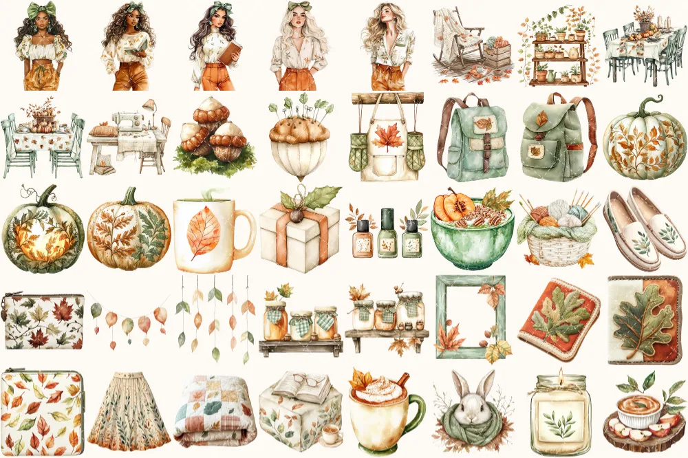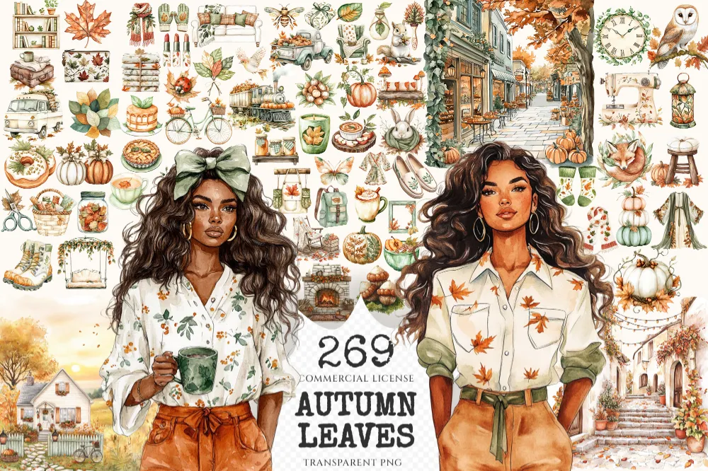 Autumn Leaves Watercolor Clipart Set – 265+ transparent PNG, Autumn pumpkins graphics, Leafy foliage art, Commercial use, Digital download