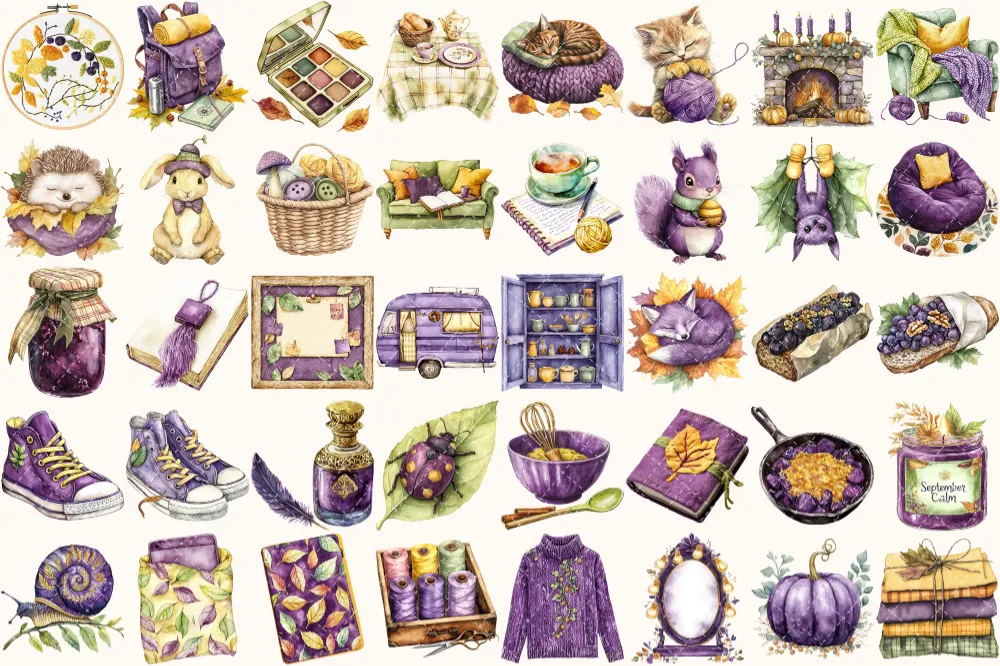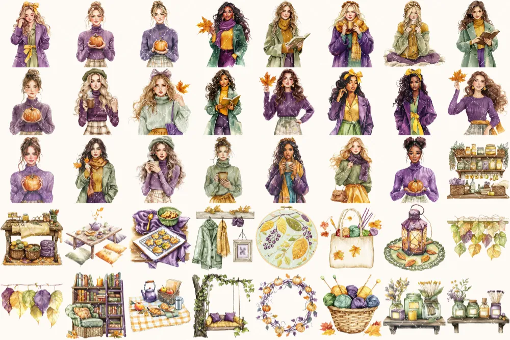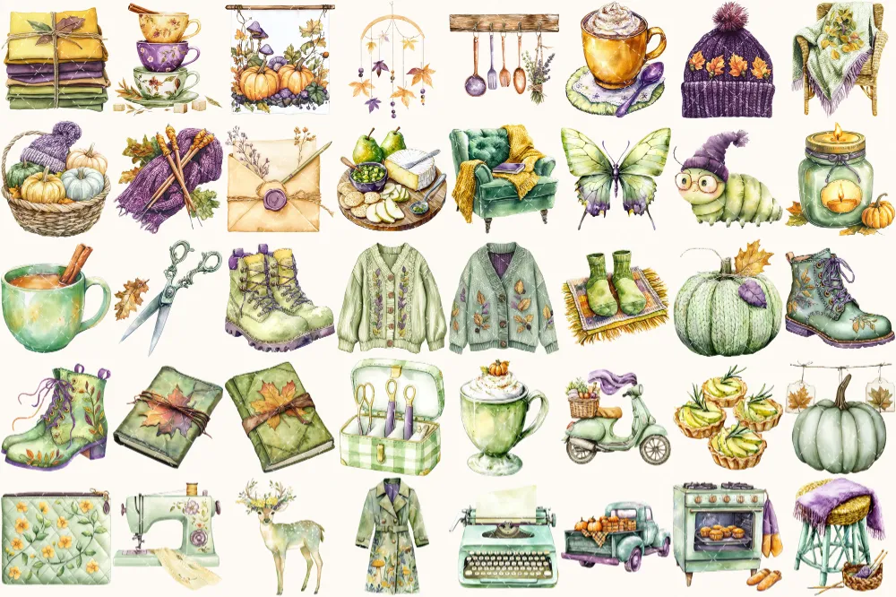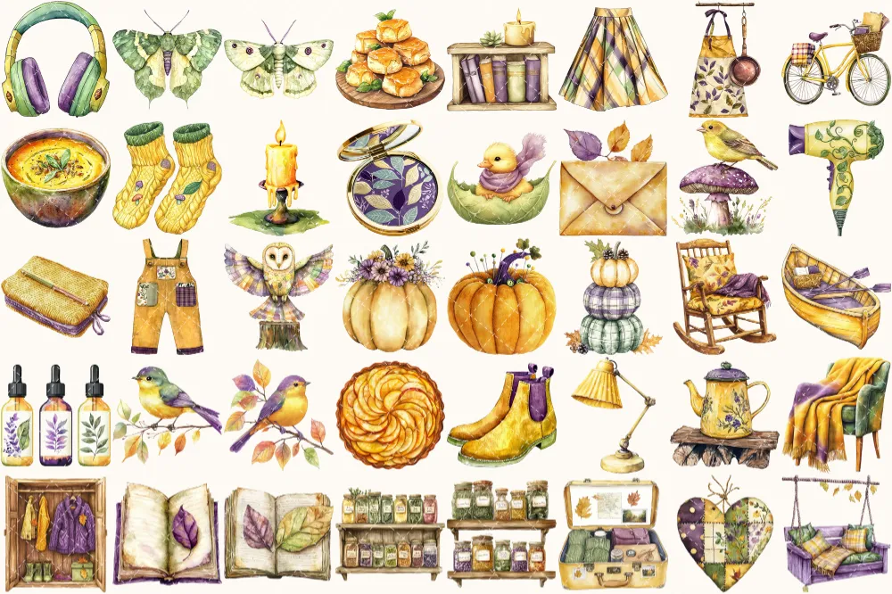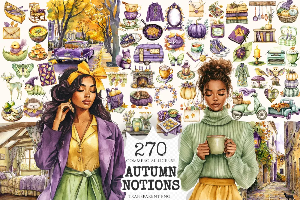 Autumn Notions Watercolor Clipart Set – 265+ transparent PNG, Artistic autumn graphics, Falling leaves art, Commercial use, Digital download