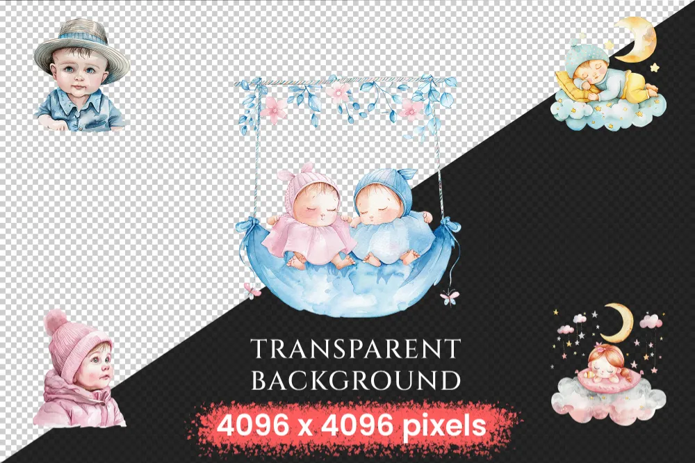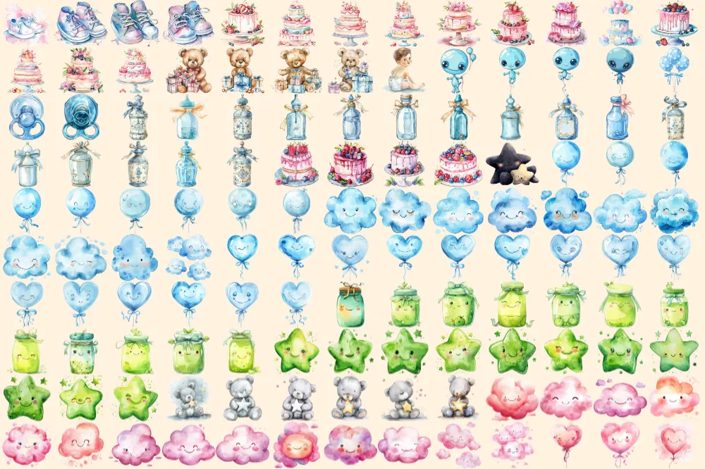 Baby Shower Watercolor Clipart Bundle – 900+ transparent PNG, Cherubic baby graphics, Adorable kids party, Commercial use, Digital download