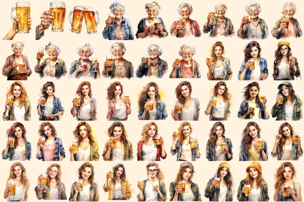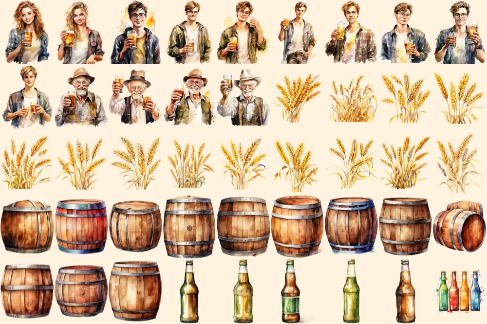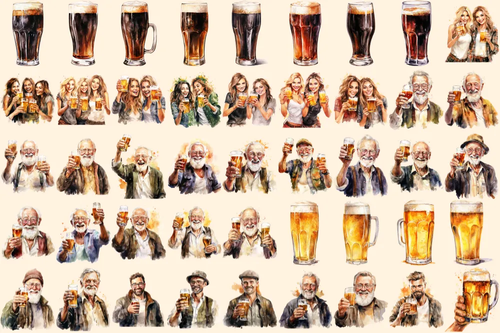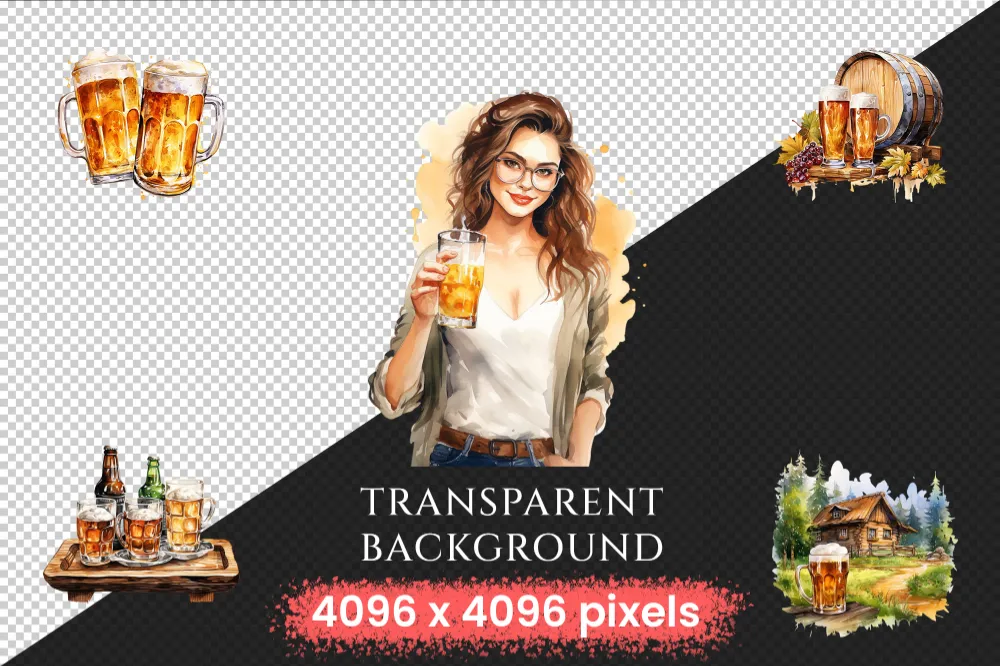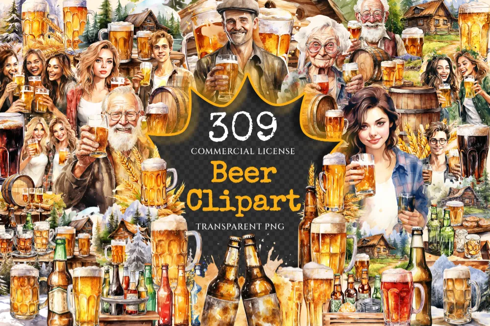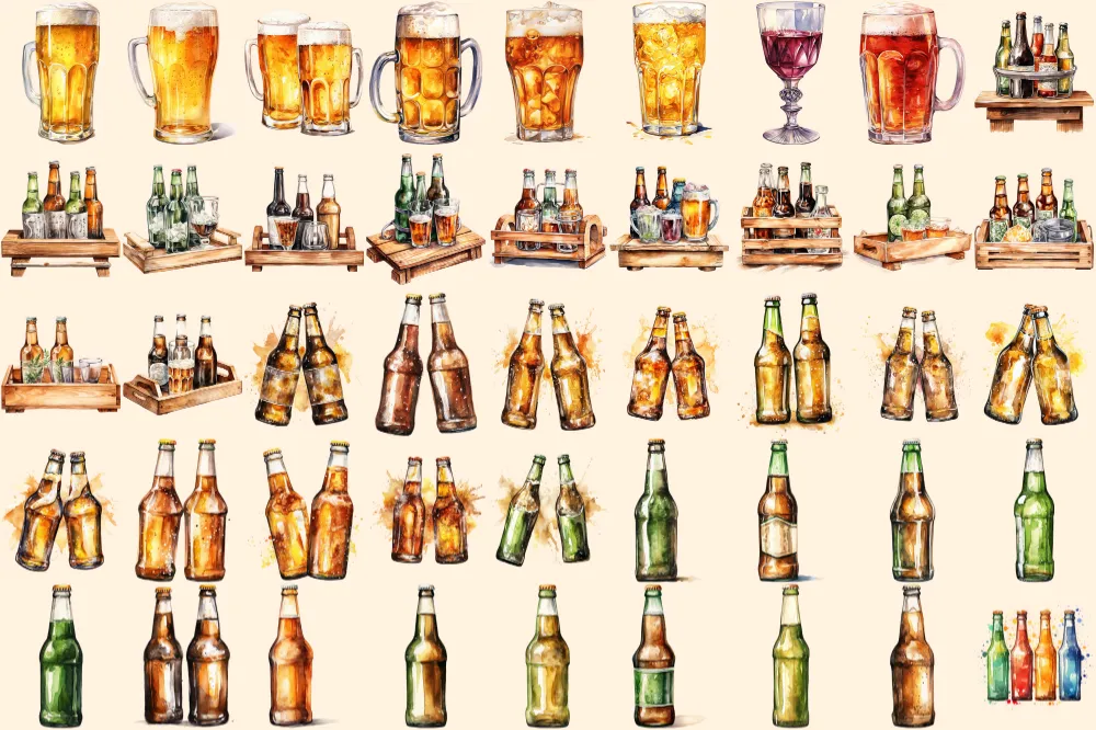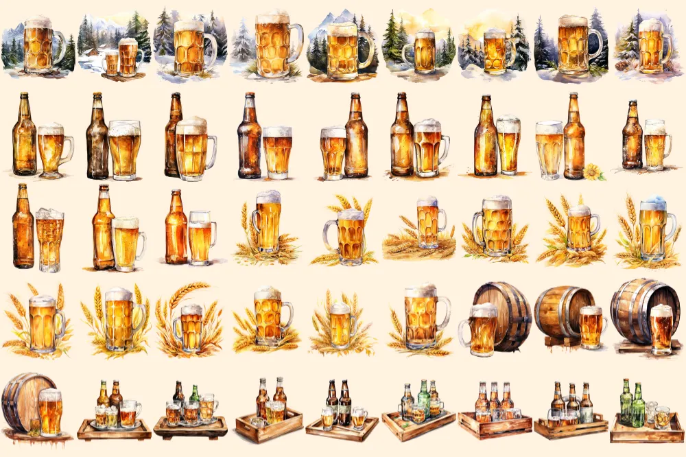 Beer Watercolor Clipart Bundle – 305+ transparent PNG, Craft beer illustrations, Lager and ale png images, Commercial use, Digital download