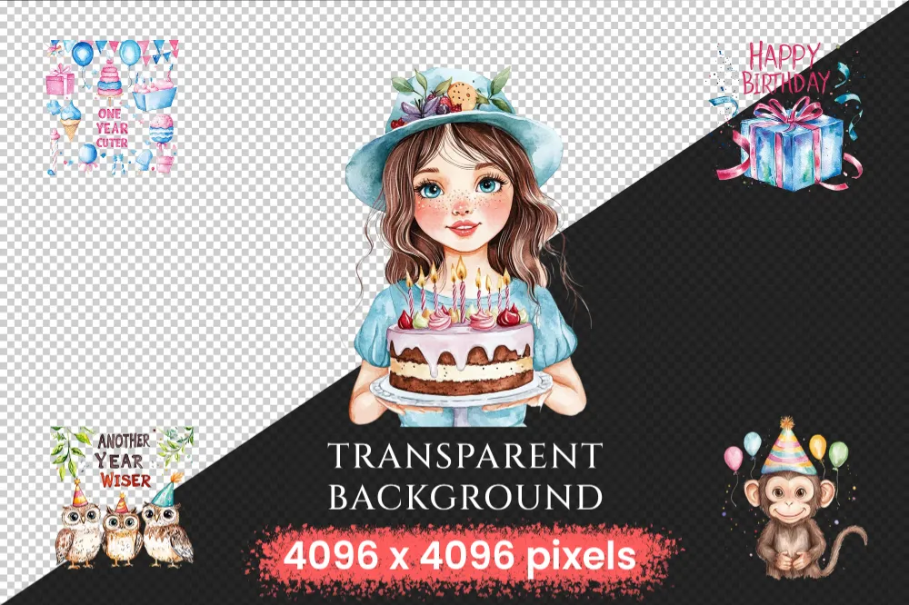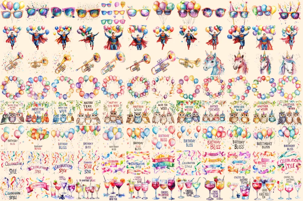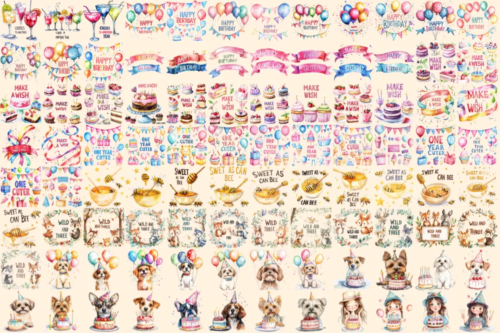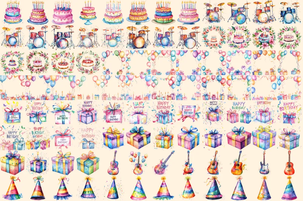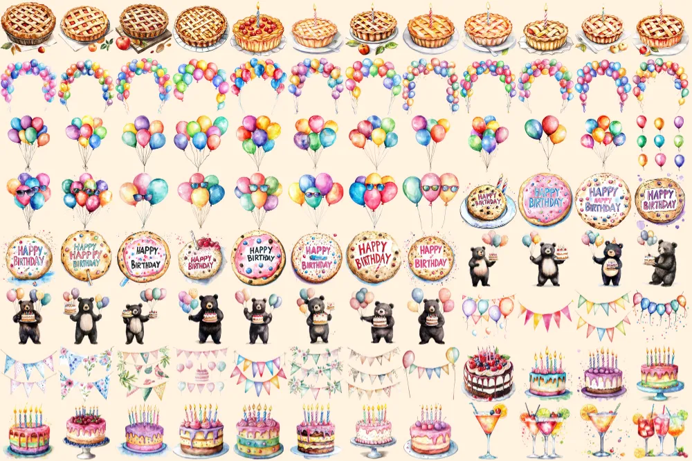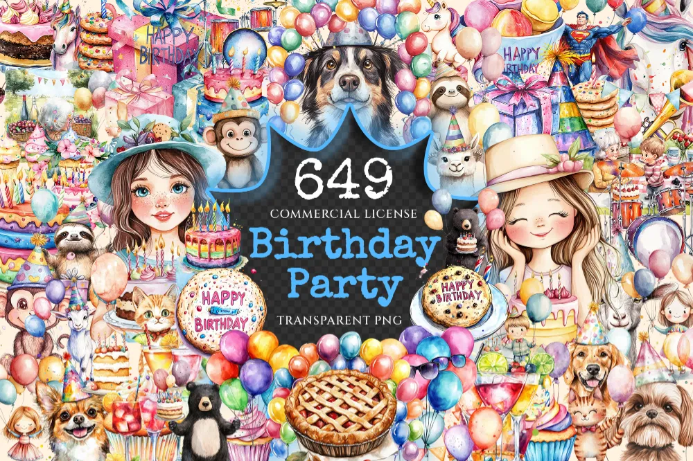 Birthday Party Watercolor Clipart Bundle – 645+ transparent PNG, Party treats graphics, Festive holiday png, Commercial use,Digital download