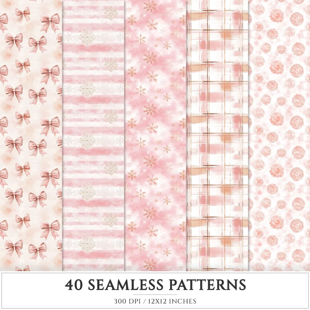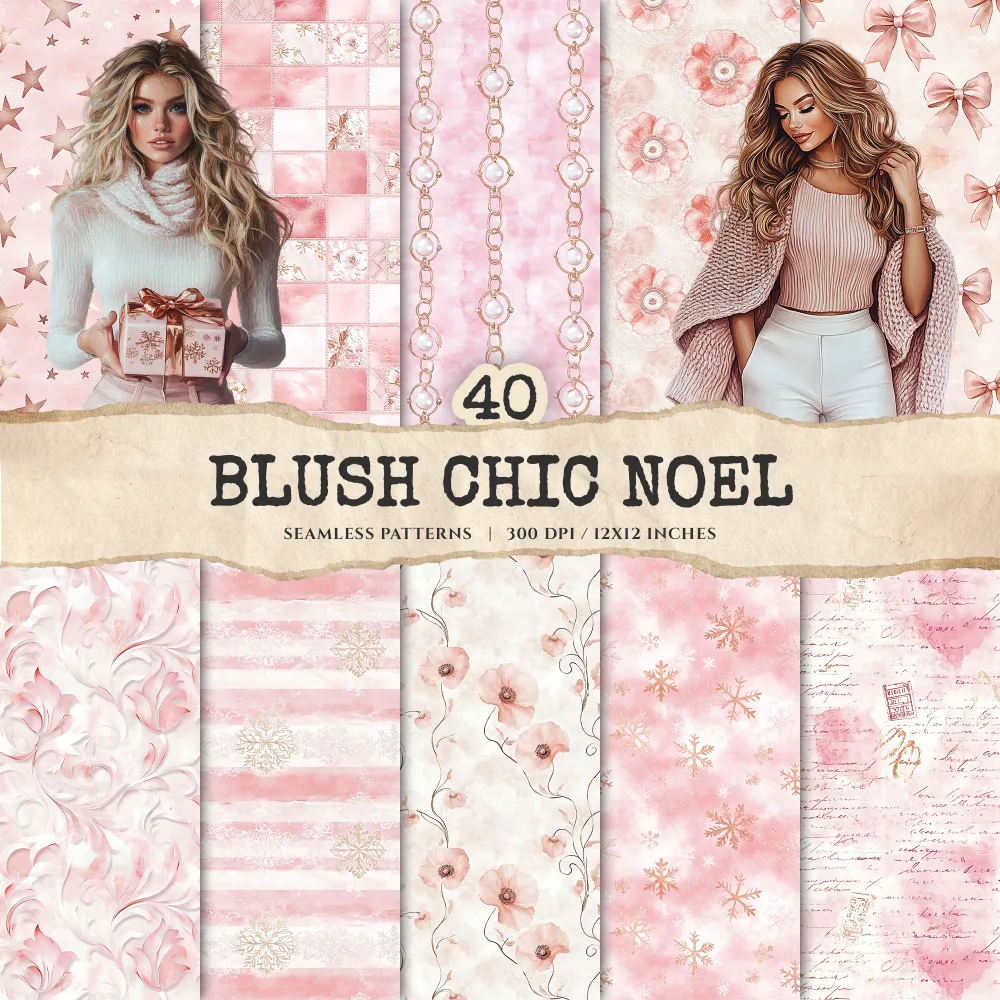 Blush Chic Noel Seamless Patterns, Christmas JPEG, Festive Patterns, Floral, Pastel, Girly Winter repeating pattern, Digital scrapbook paper