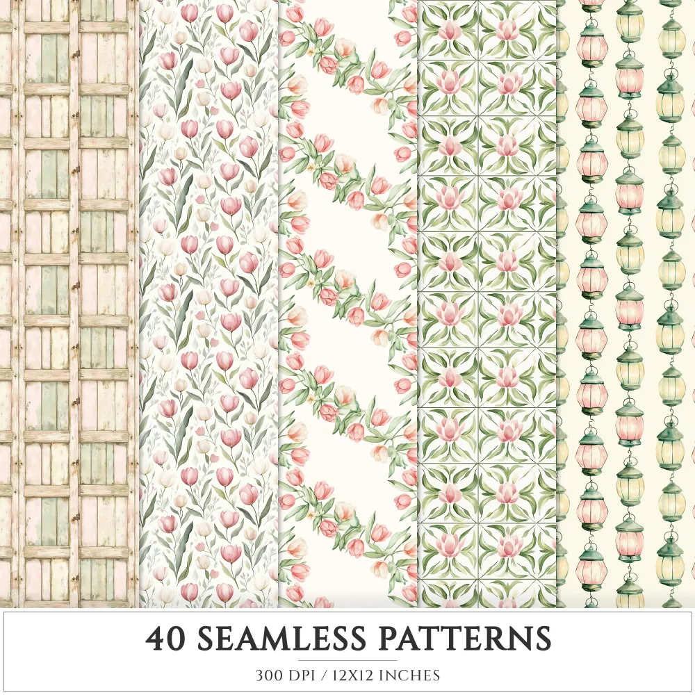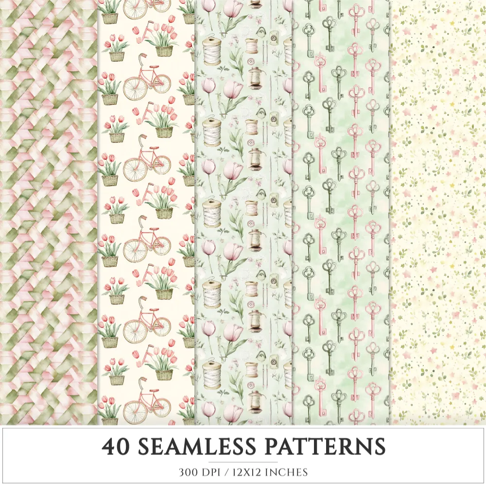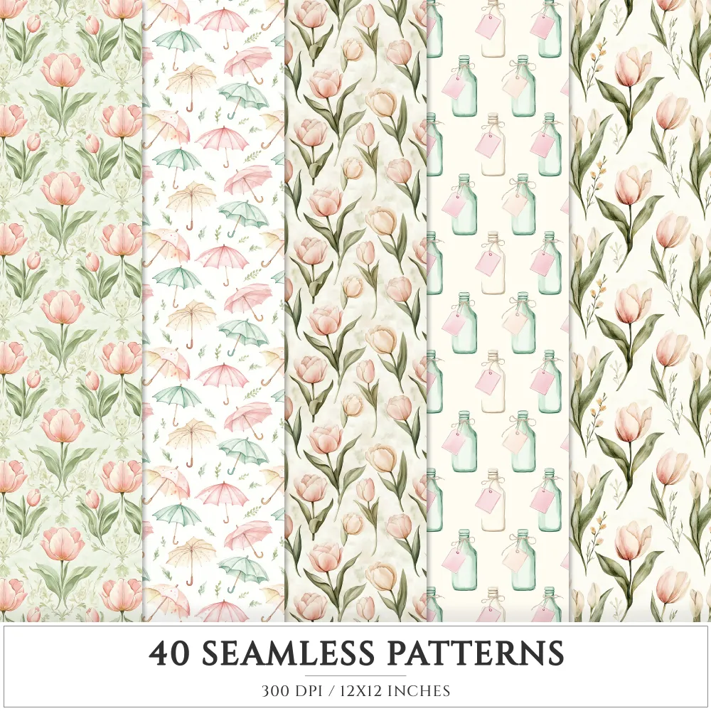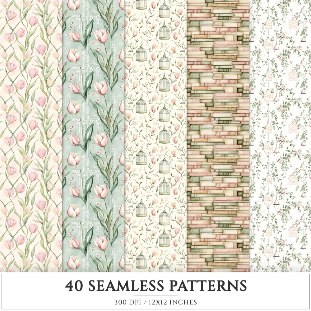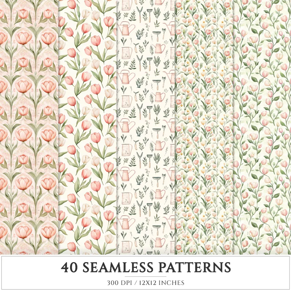 Blush Tulip Letters Seamless Patterns, Tulip Floral JPEG, Springtime, Floral bird Pattern, Cottage Repeating Pattern,Digital Scrapbook Paper