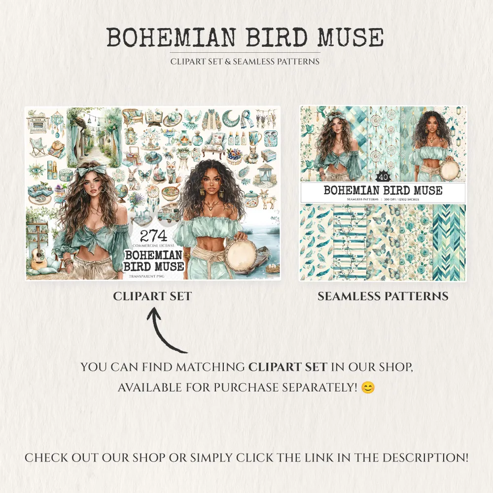 1. Bohemian Bird Muse Watercolor Clipart Set (274 PNG files):