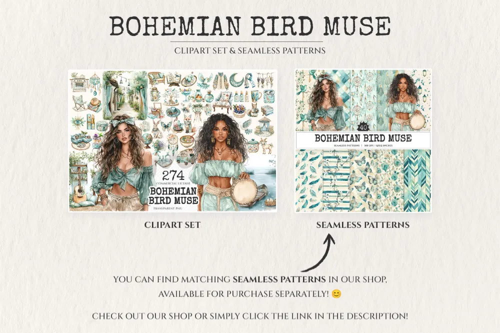 1. Bohemian Bird Muse Seamless Patterns (40 JPG files):