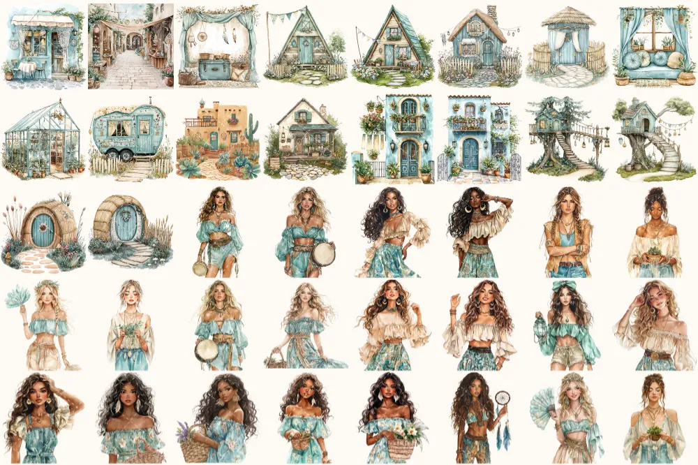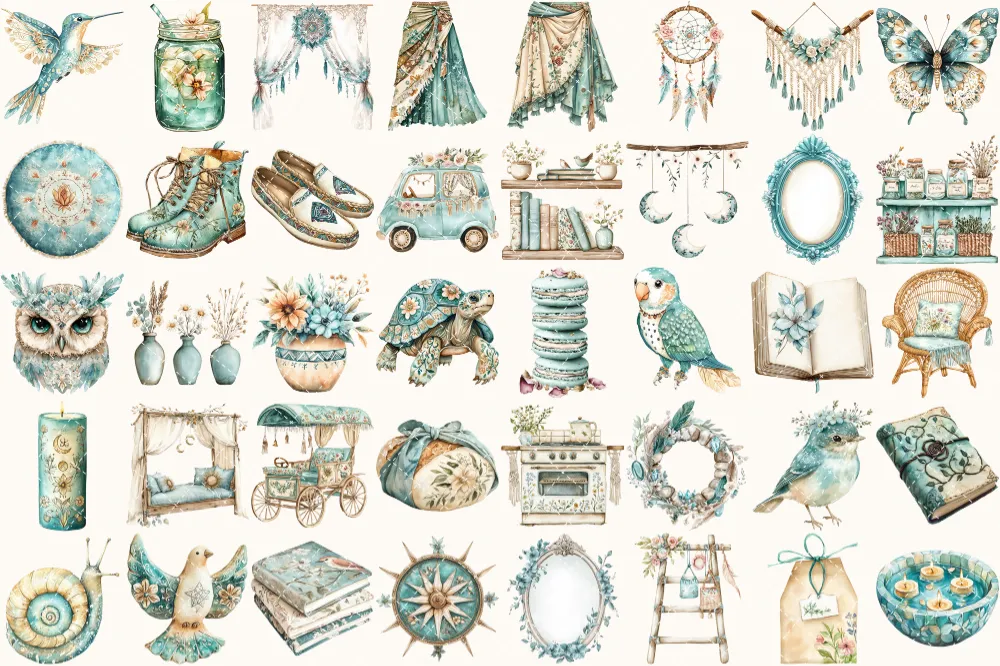 Bohemian Bird Muse Watercolor Clipart Set – 270+ transparent PNG, Boho spirit illustrations, Boho chic art, Commercial use, Digital download