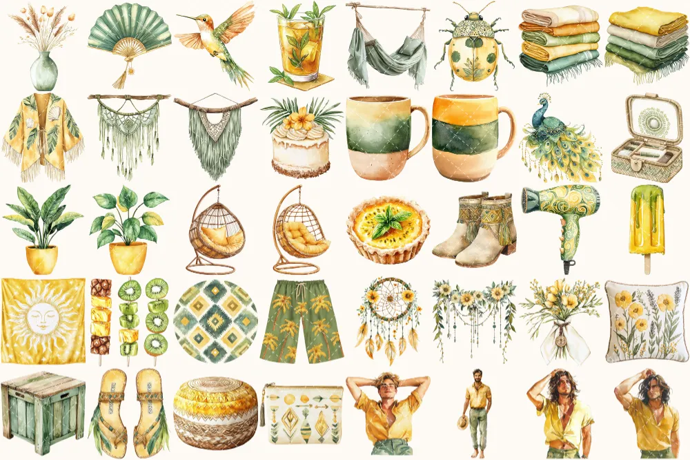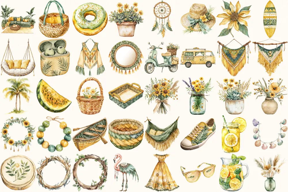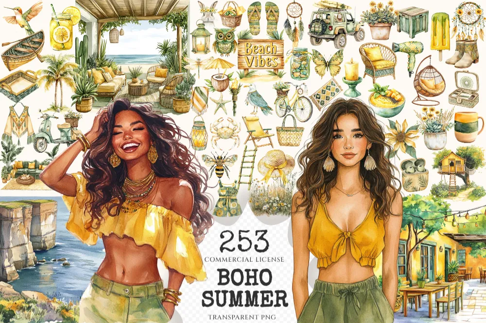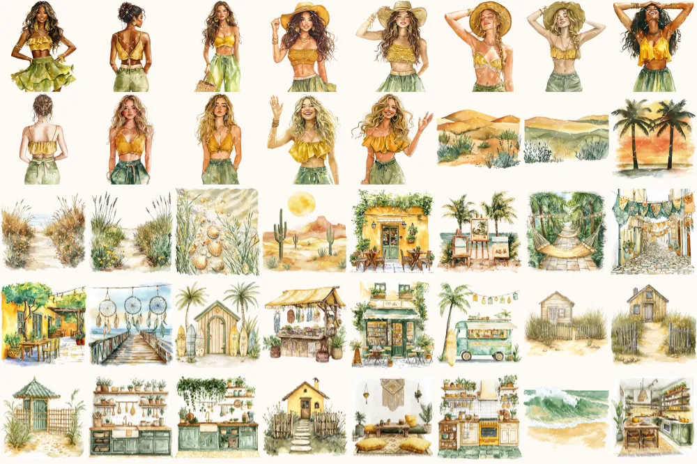 Boho Summer Watercolor Clipart Set – 250+ transparent PNG, Sunkissed boho graphics, Seaside fashion images, Commercial use, Digital download