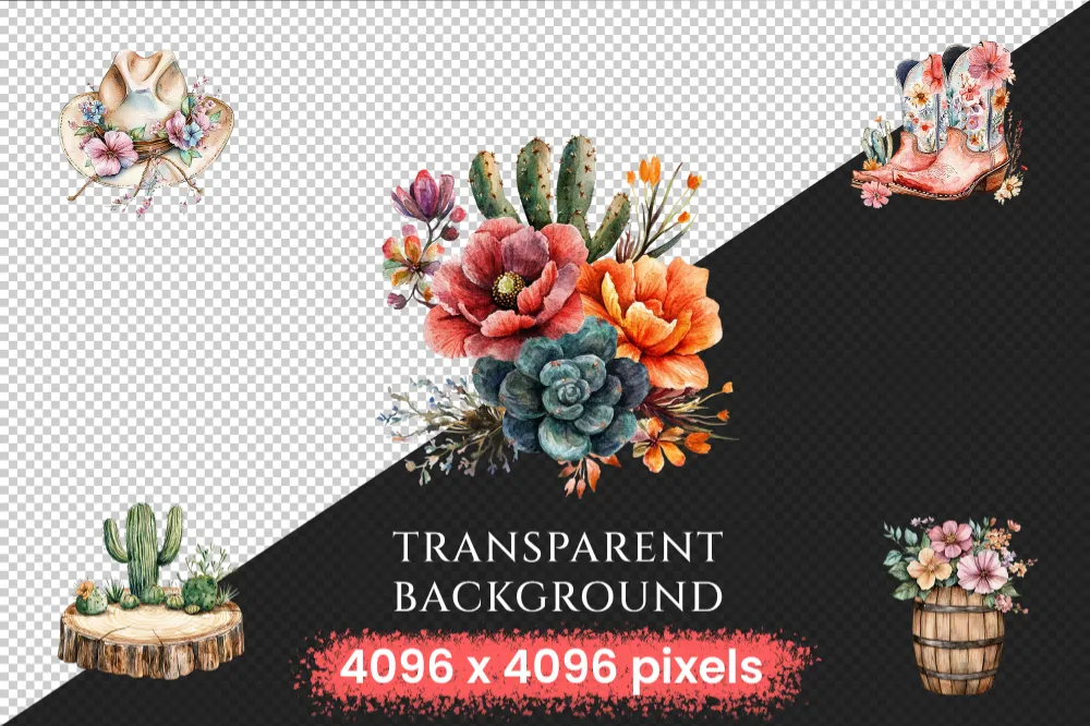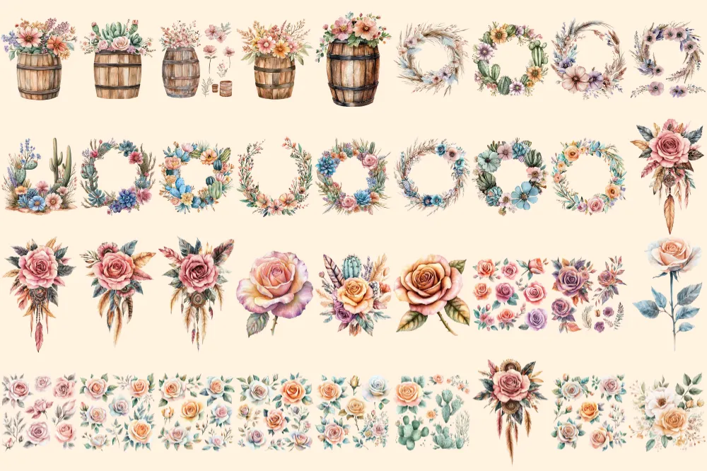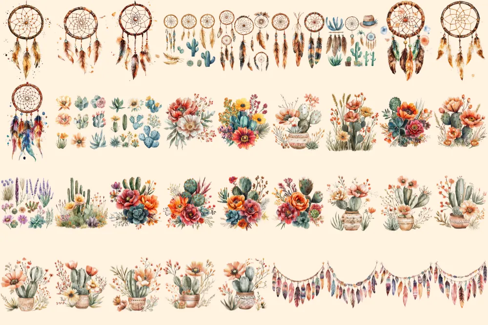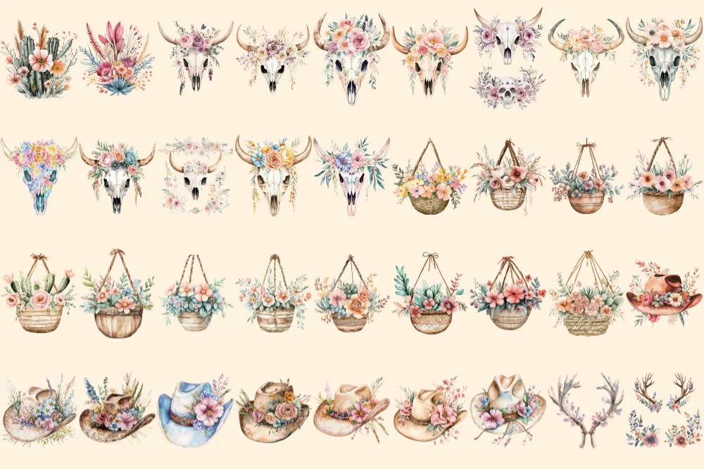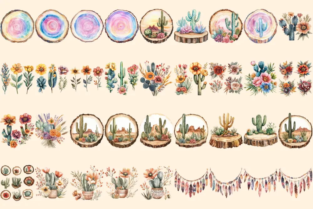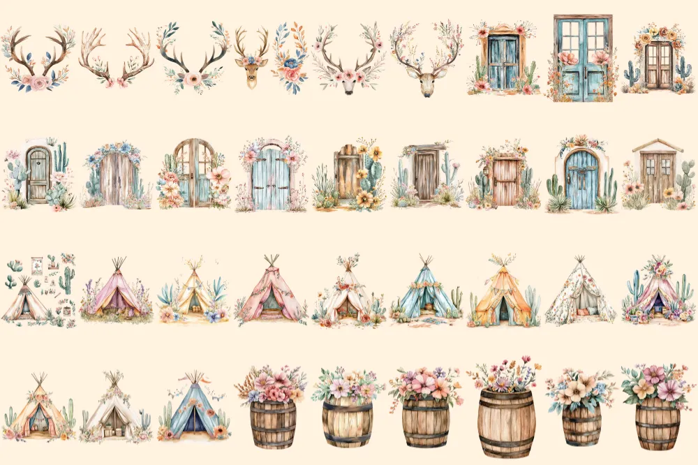 Boho Western Watercolor Clipart Bundle – 240+ transparent PNG, Western desert cowgirl graphics, Boho png, Commercial use, Digital download