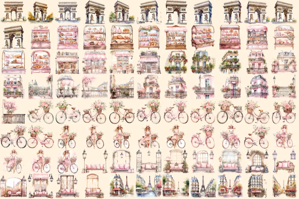 Bonjour Paris Watercolor Clipart Bundle – 575+ transparent PNG, Pink paris graphics, French illustrations, Commercial use, Digital download