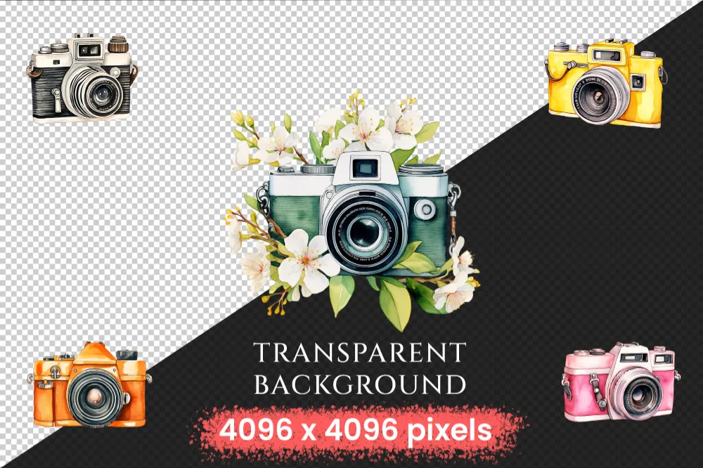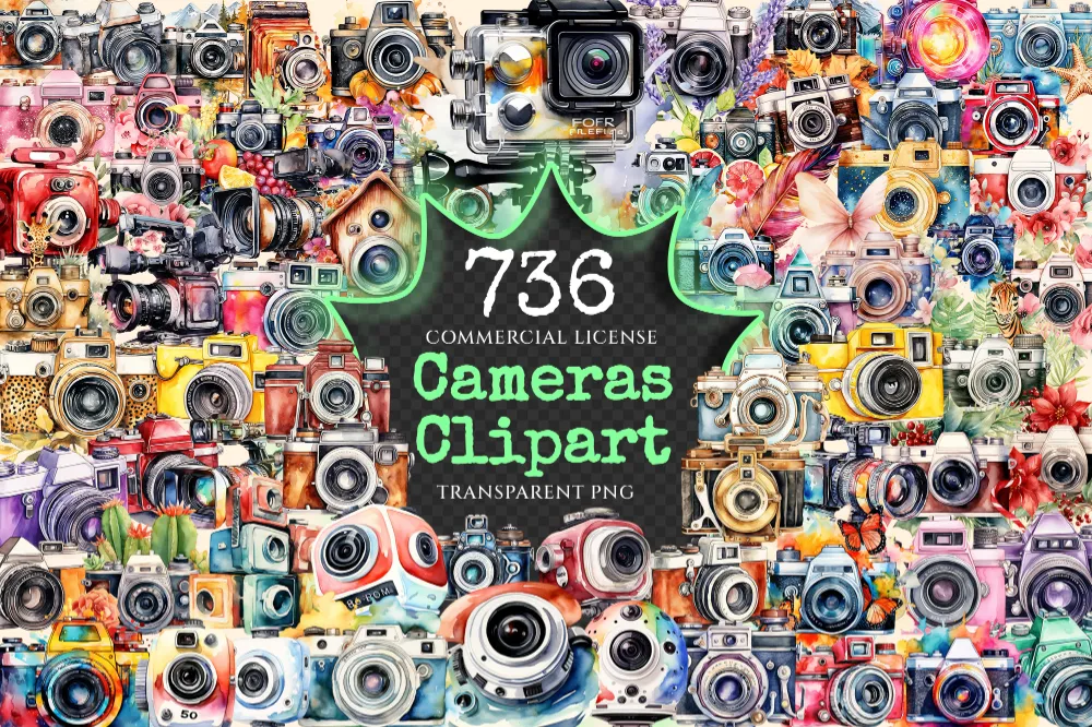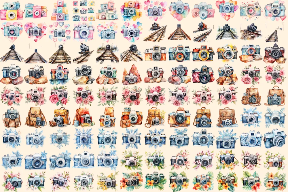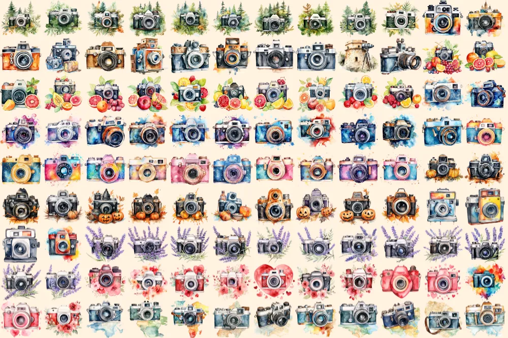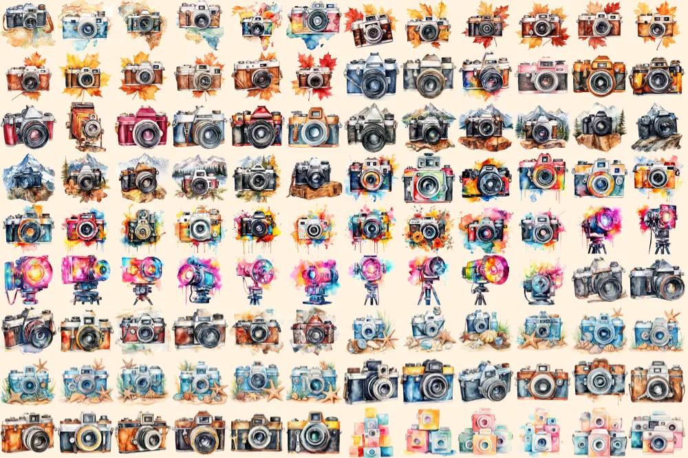 Cameras Watercolor Clipart Bundle – 730+ transparent PNG, Photography gear illustrations, Camera graphics, Commercial use, Digital download