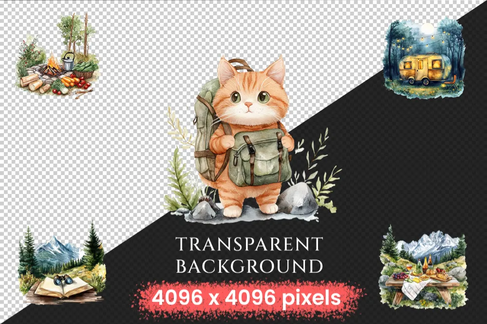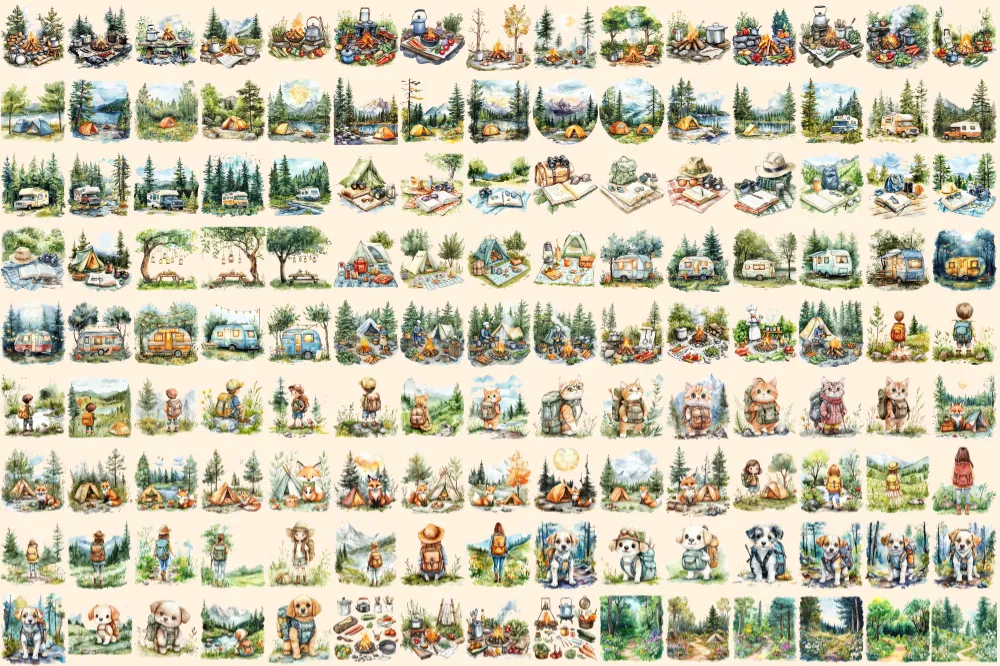 Camping Watercolor Clipart Bundle – 930+ transparent PNG, Nature adventure illustrations, Campsite graphics,Commercial use, Digital download