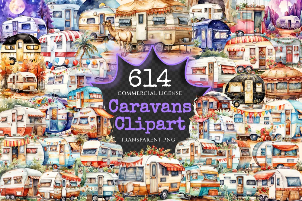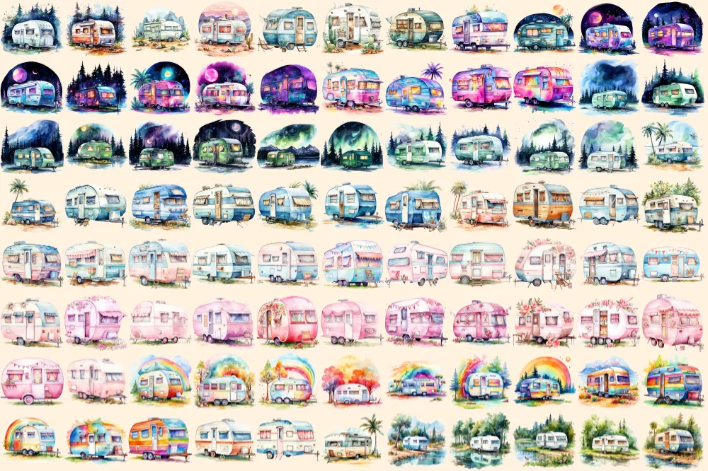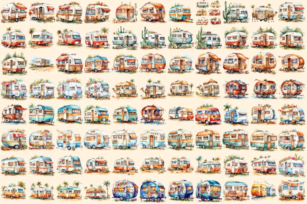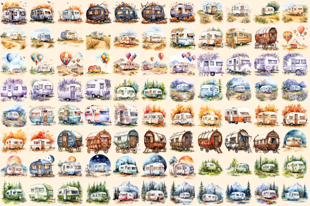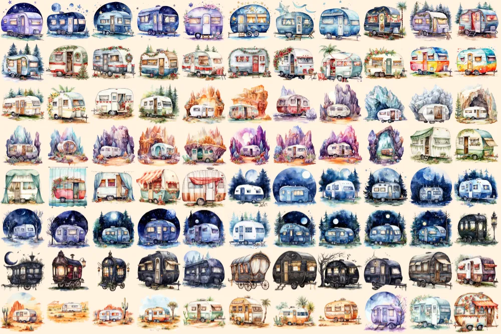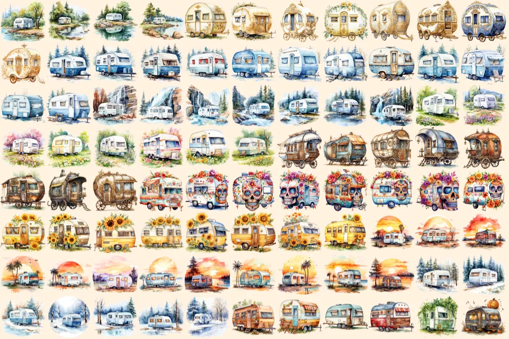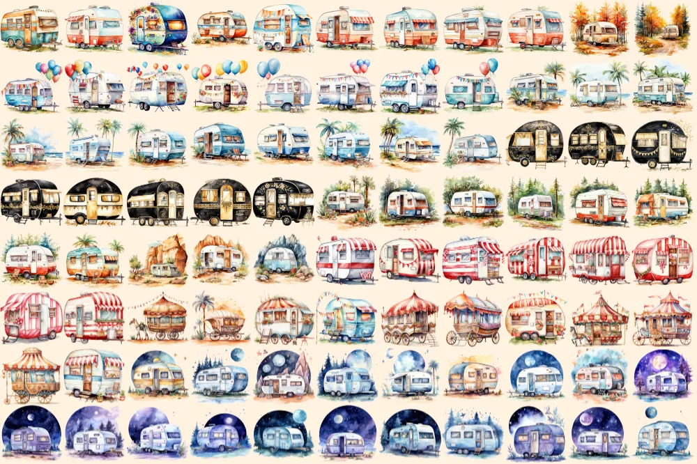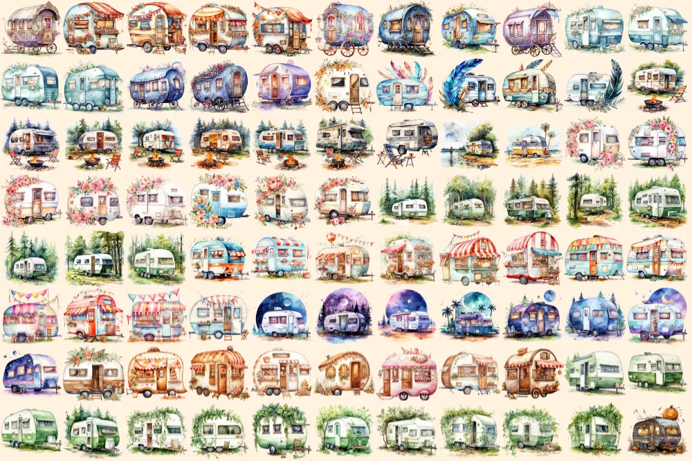 Caravans Watercolor Clipart Bundle – 610+ transparent PNG, Adventure camper illustrations, Mobile home png, Commercial use, Digital download