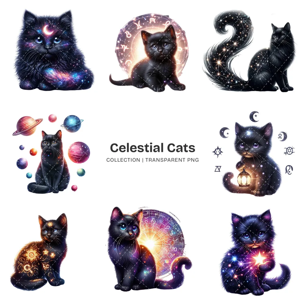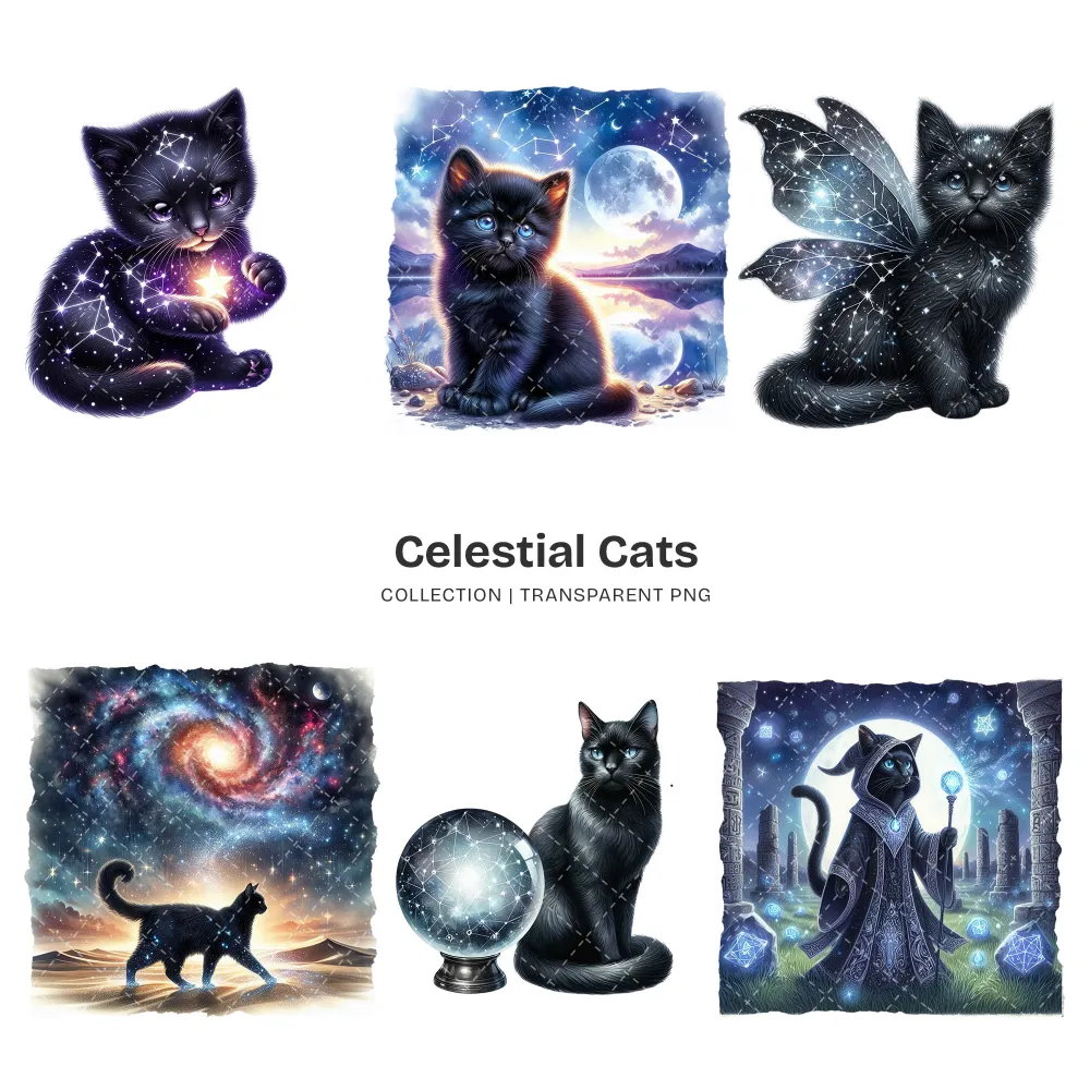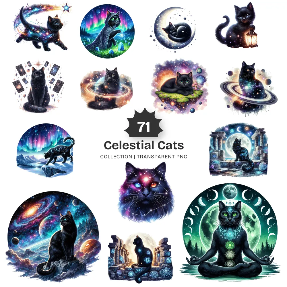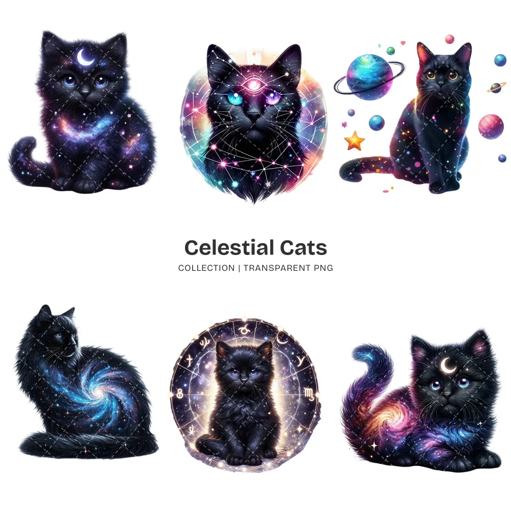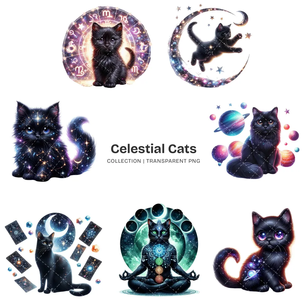 Celestial Cats PNG Clipart Collection – 71 PNG, Mystical Kitten Graphics, Enchanting, Astrology Printables, Commercial use, Digital download
