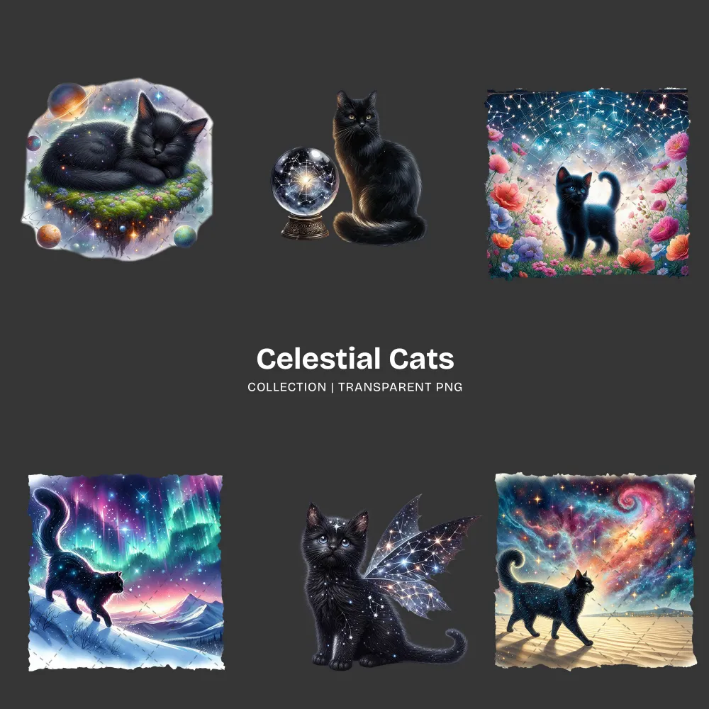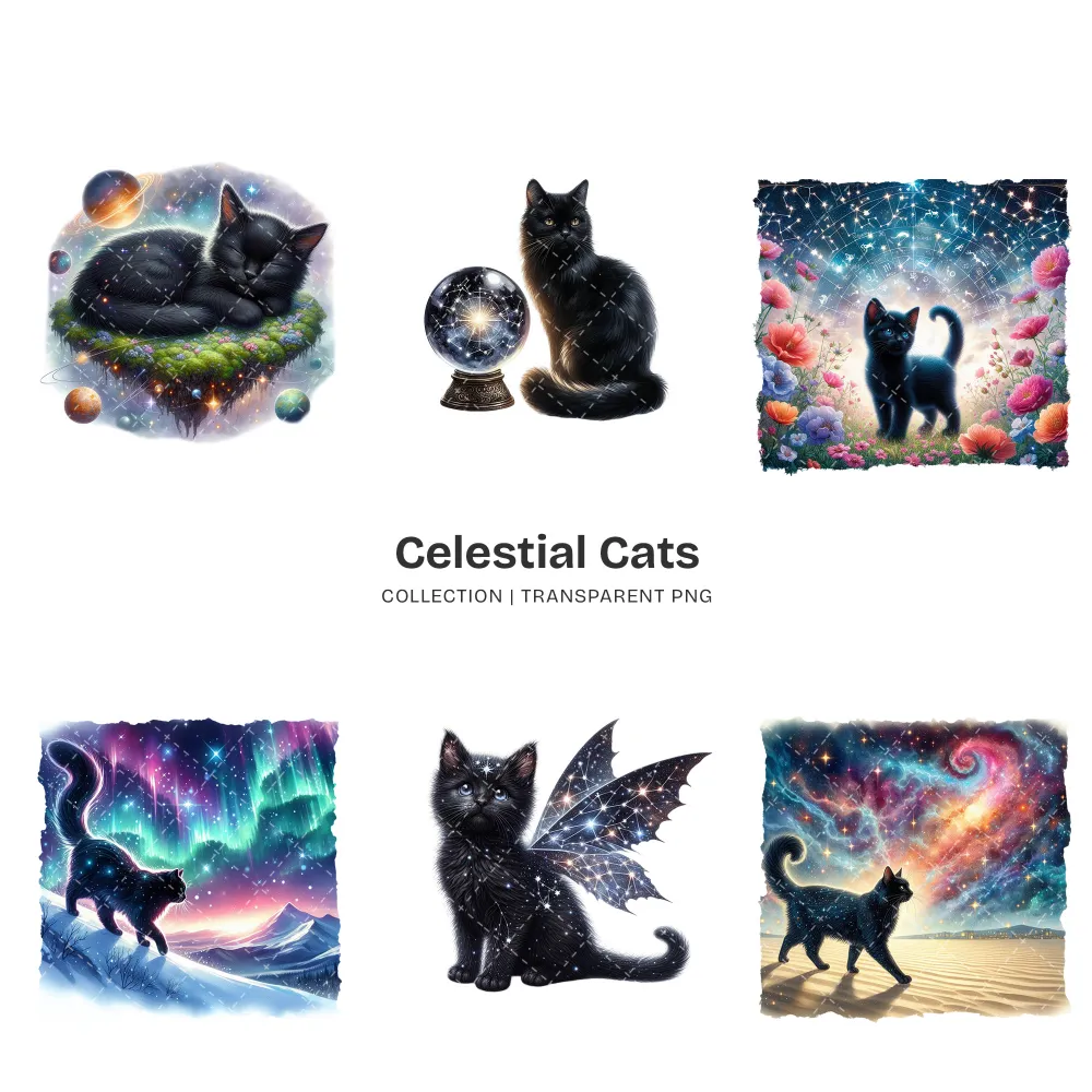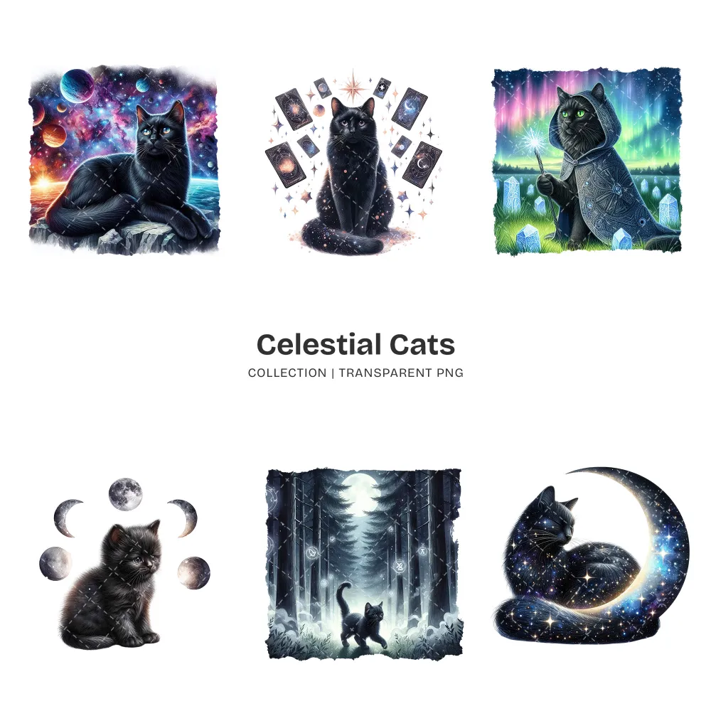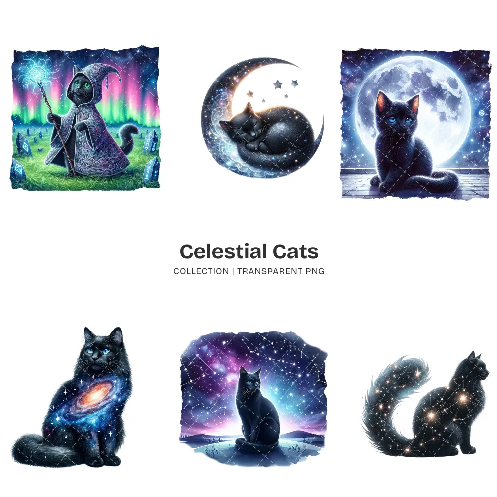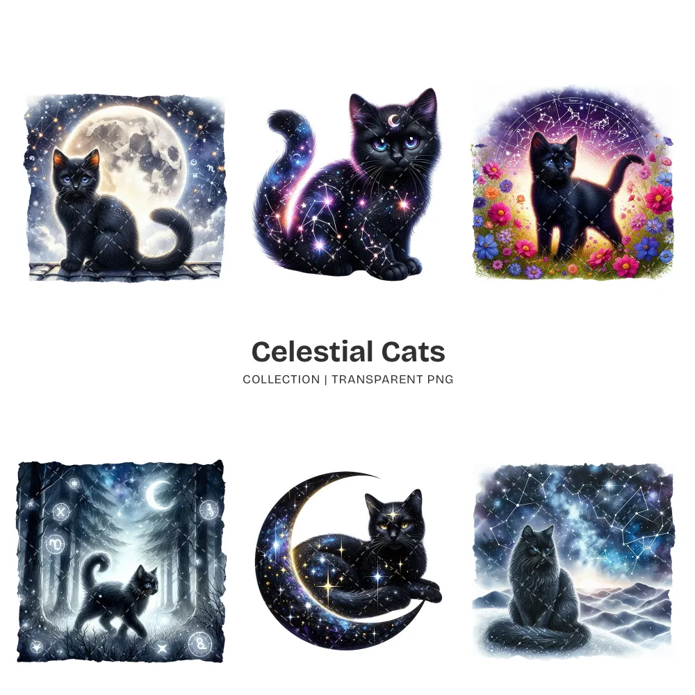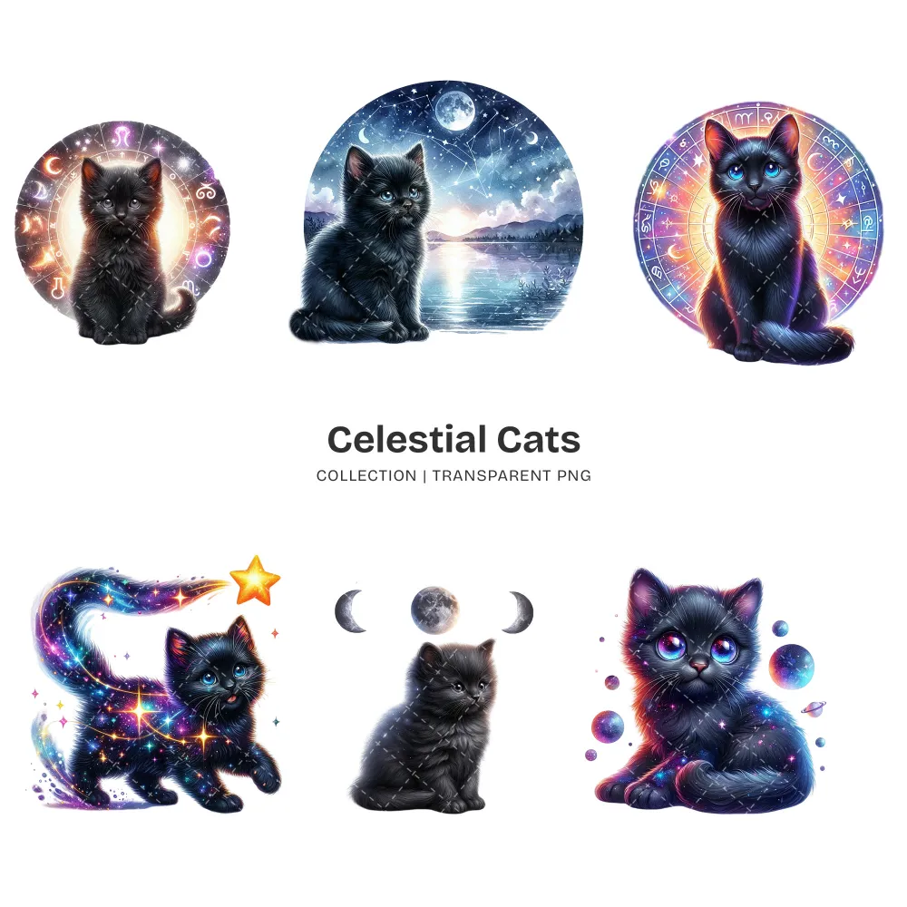 Celestial Cats PNG Clipart Collection – 71 PNG, Mystical Kitten Graphics, Enchanting, Astrology Printables, Commercial use, Digital download