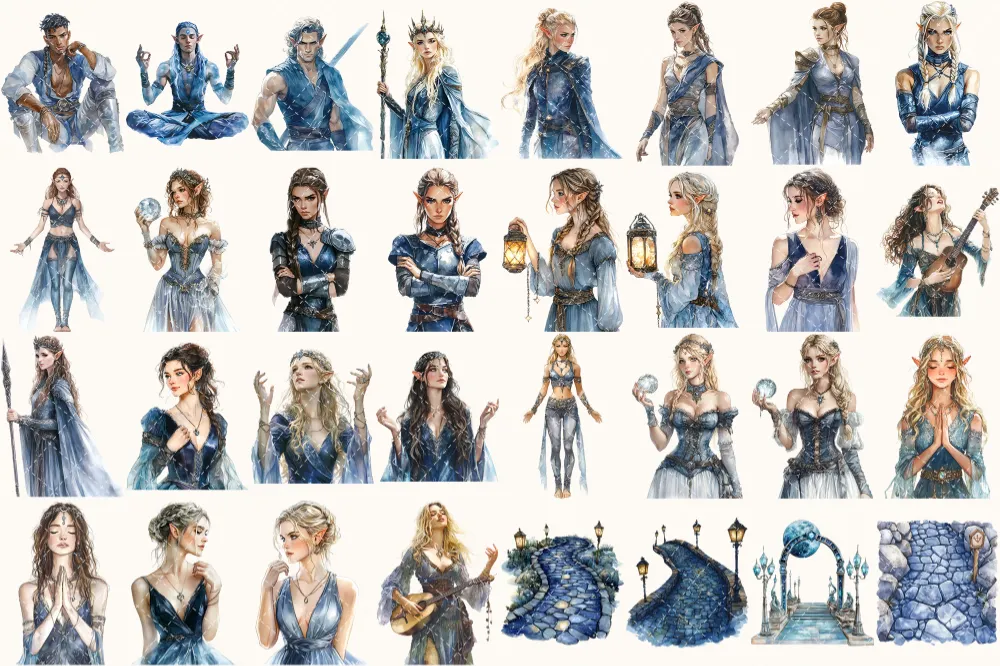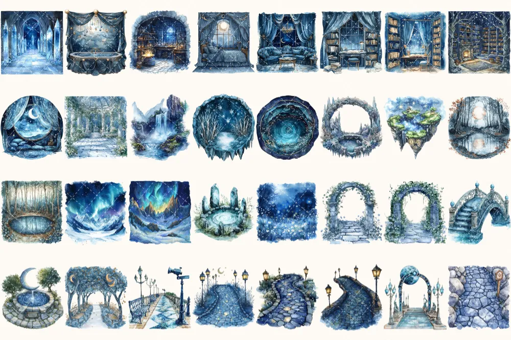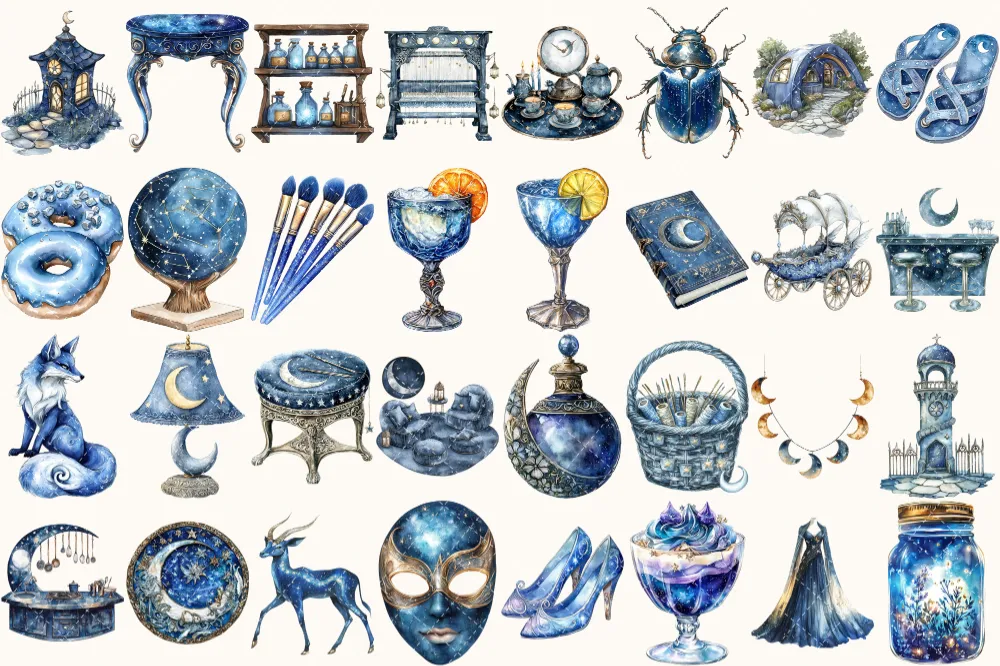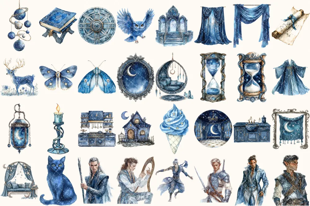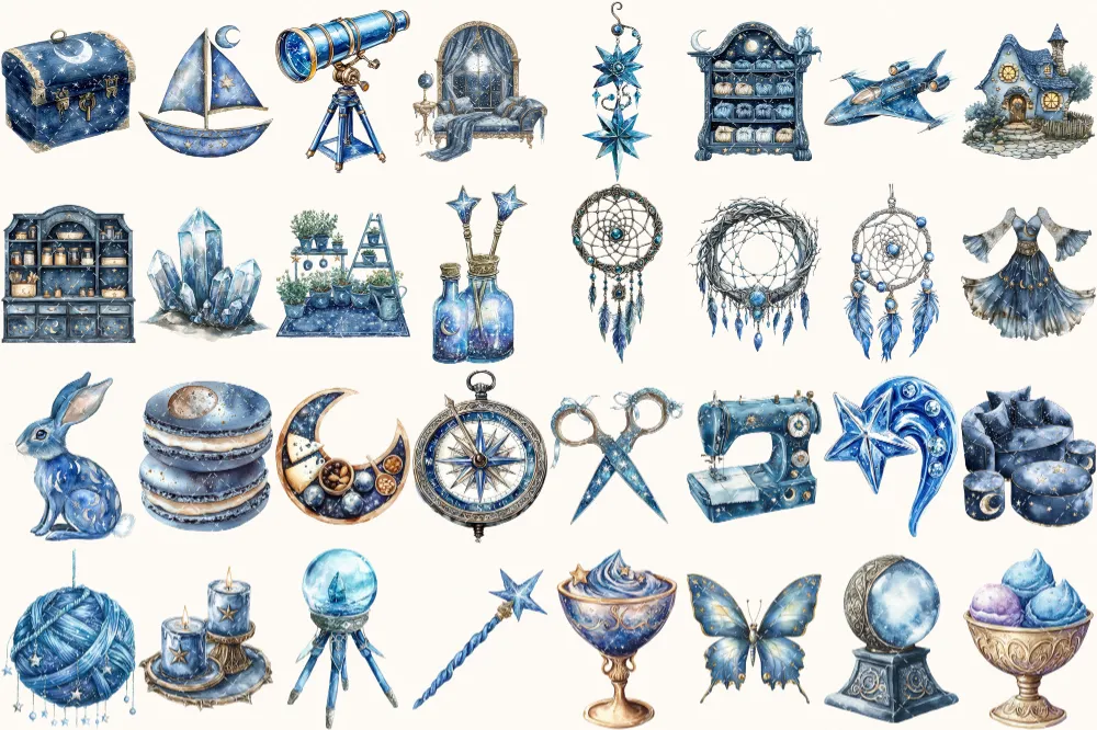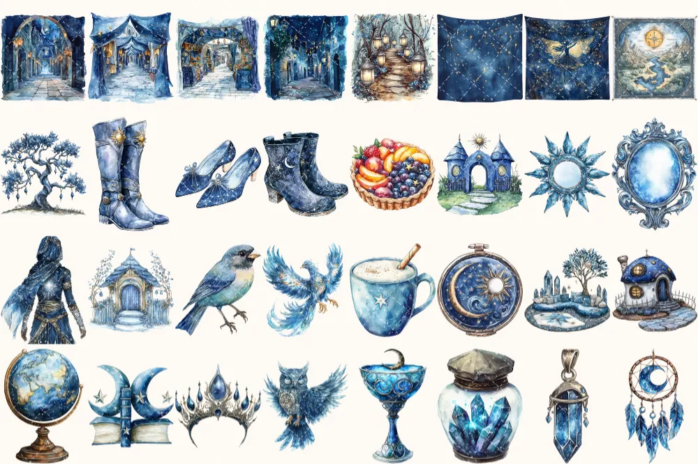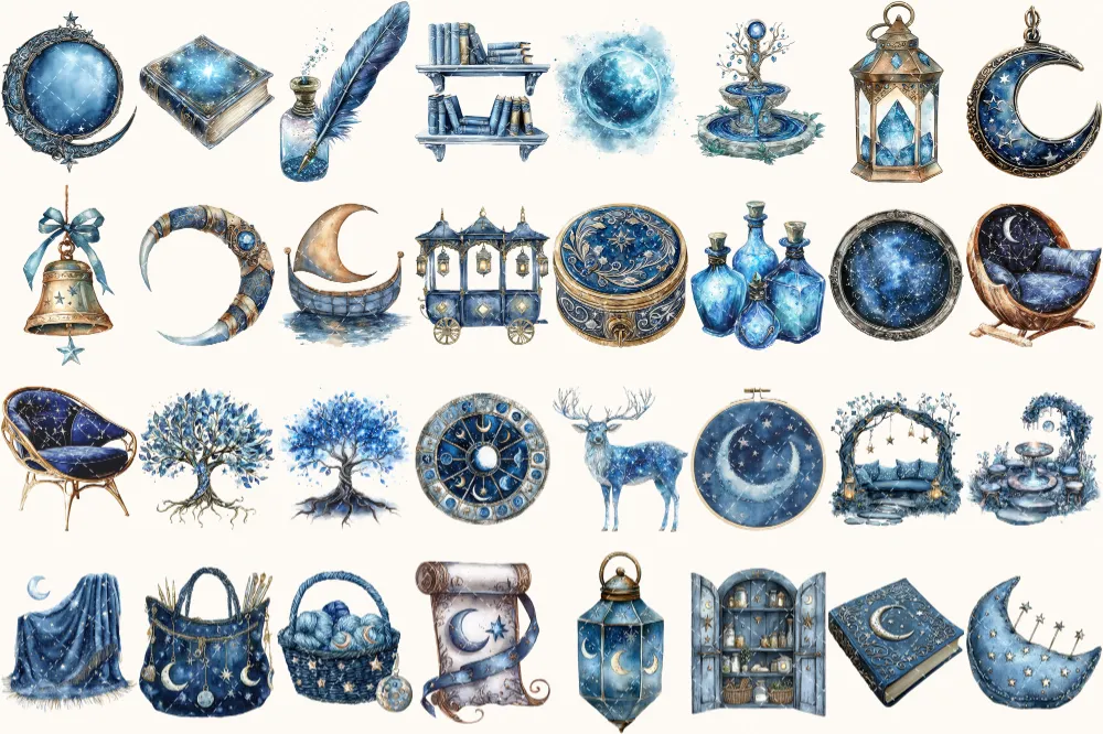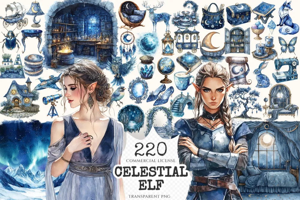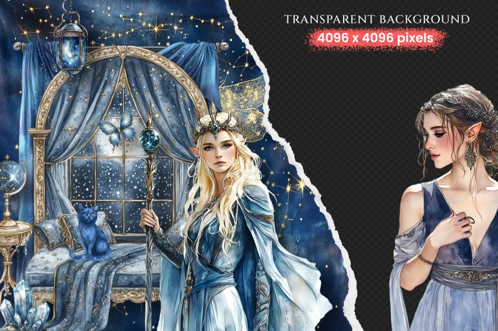 Celestial Elf Watercolor Clipart Set – 215+ transparent PNG, Magical nightscape graphics, Cosmic stars art, Commercial use, Digital download