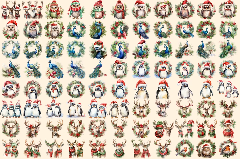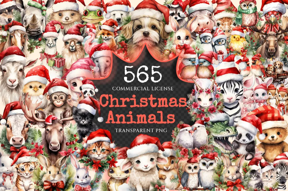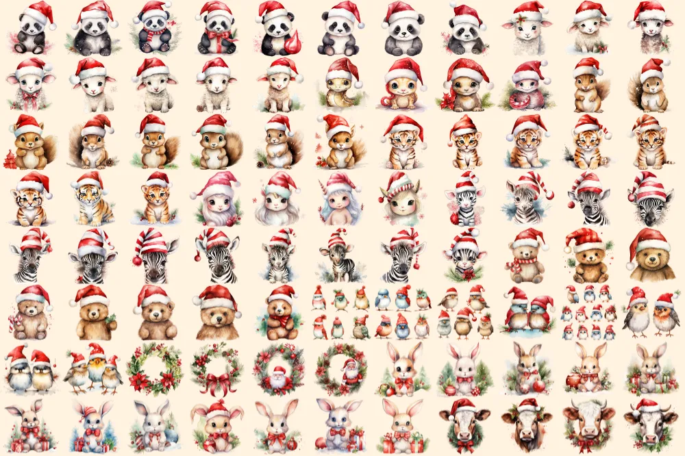 Christmas Animals Watercolor Clipart Bundle – 560+ transparent PNG, Festive animal images, Santa hat wreath, Commercial use,Digital download