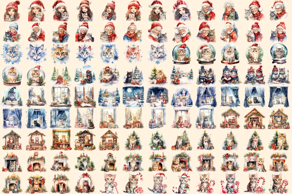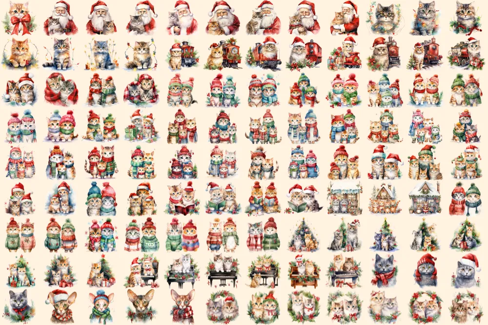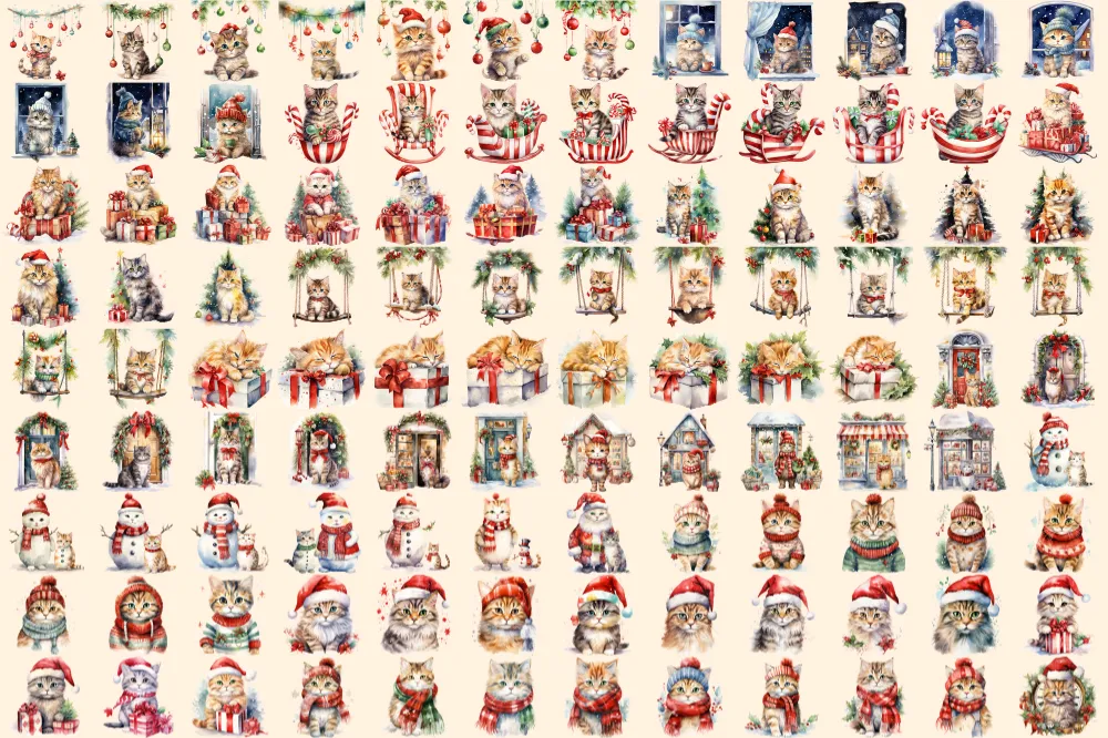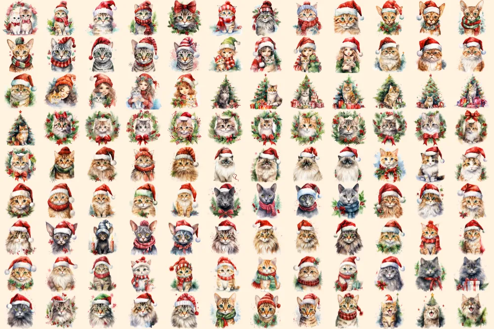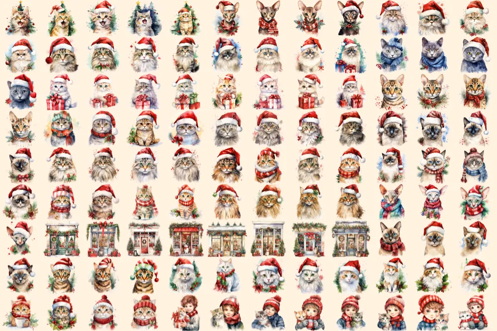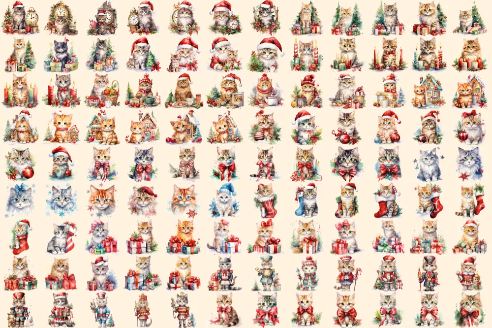 Christmas Cats Watercolor Clipart Bundle – 721+ transparent PNG, Holiday cat images, Cozy festive kitty png, Commercial use,Digital download