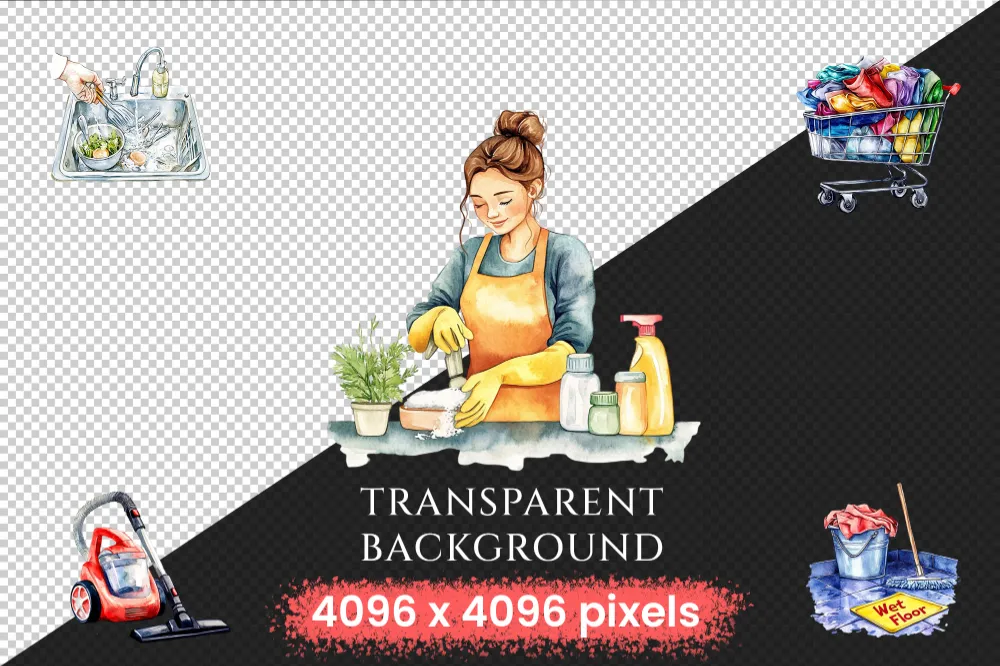 Cleaning Watercolor Clipart Bundle – 825+ transparent PNG, Cleaning supplies illustration, Sanitation png, Commercial use, Digital download