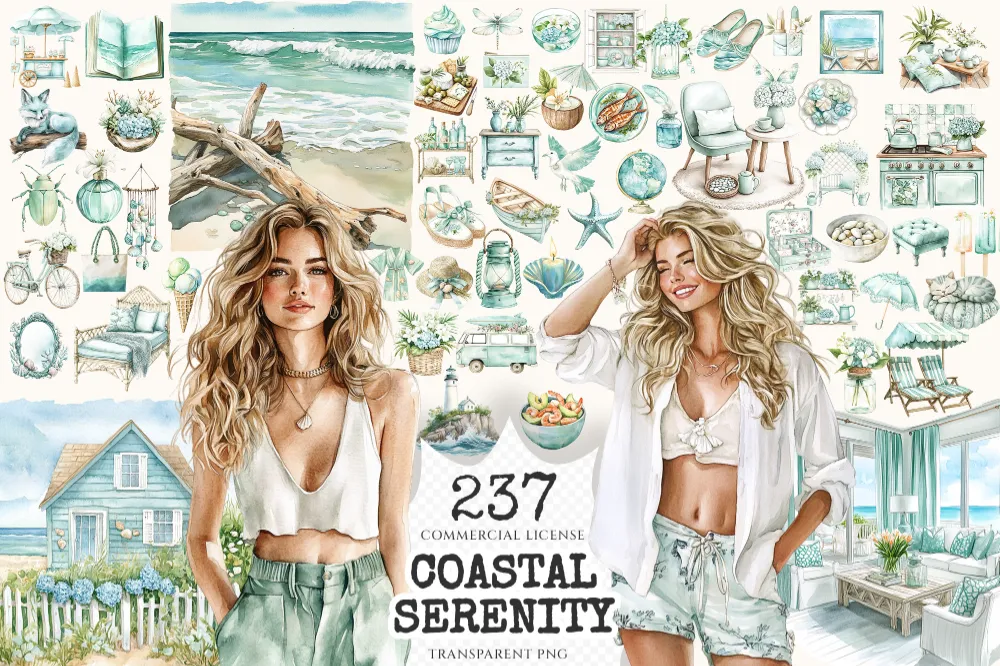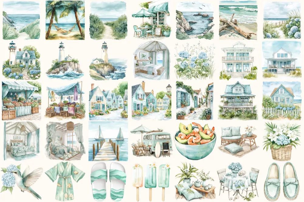 Coastal Serenity Watercolor Clipart Set – 233+ transparent PNG, Sunny beach graphics, Summer seaside art, Commercial use, Digital download