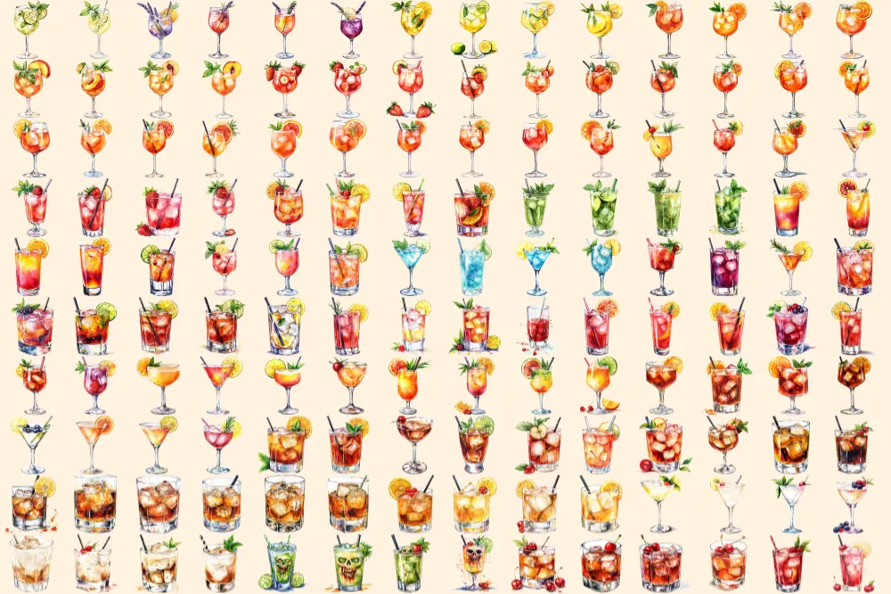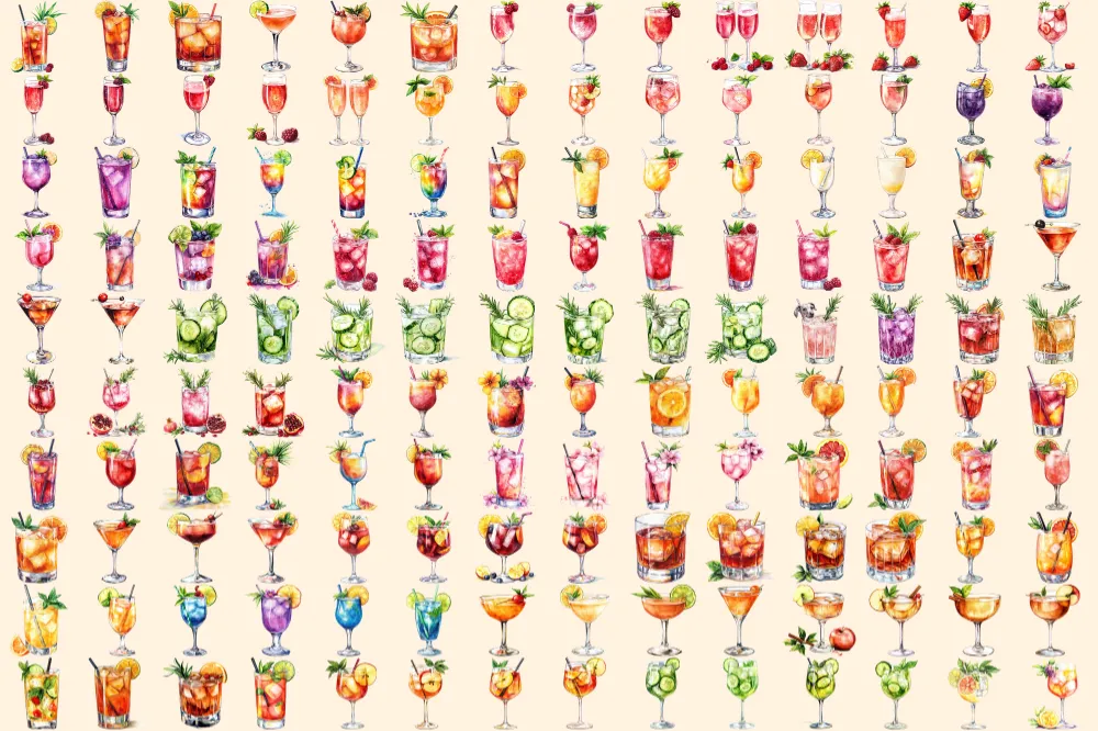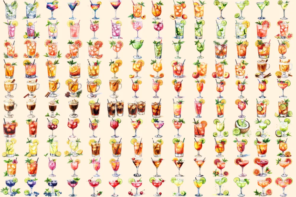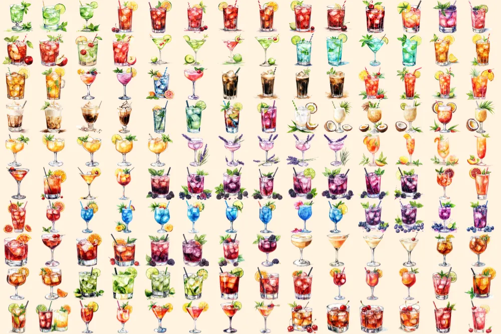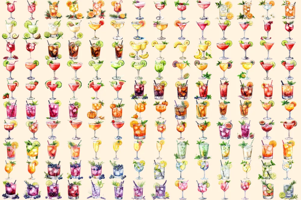 Cocktail Watercolor Clipart Bundle – 970+ transparent PNG, Celebration drinks graphics, Champagne clipart, Commercial use, Digital download
