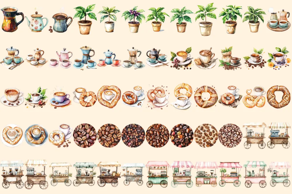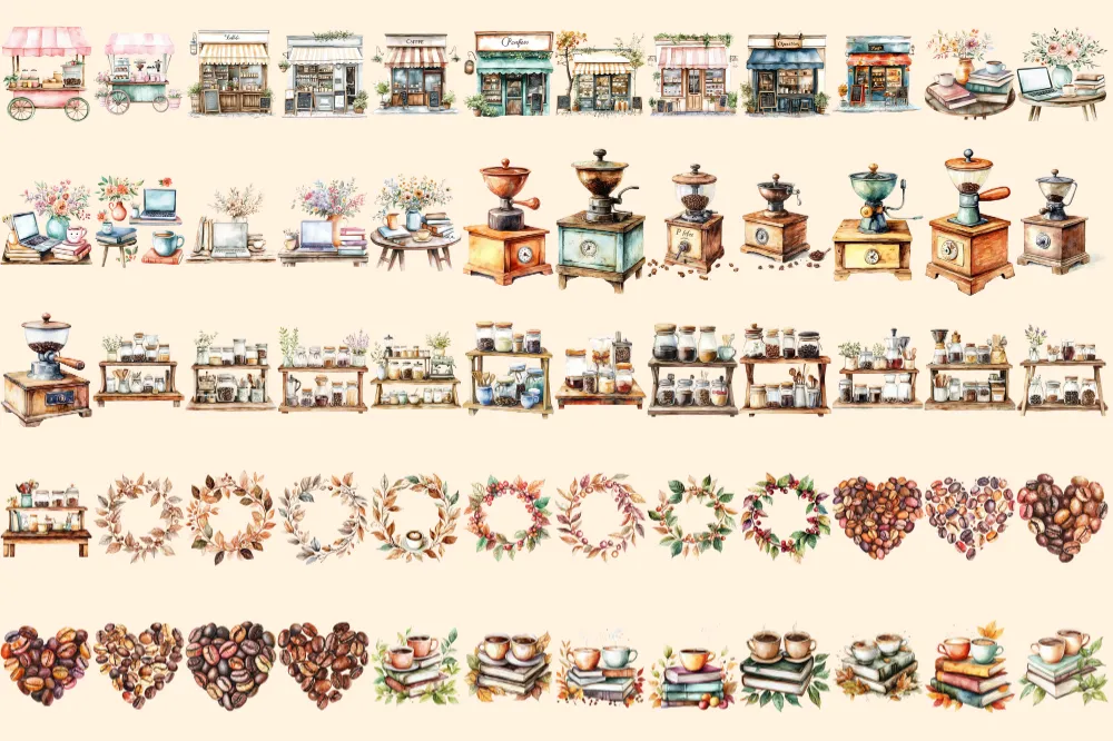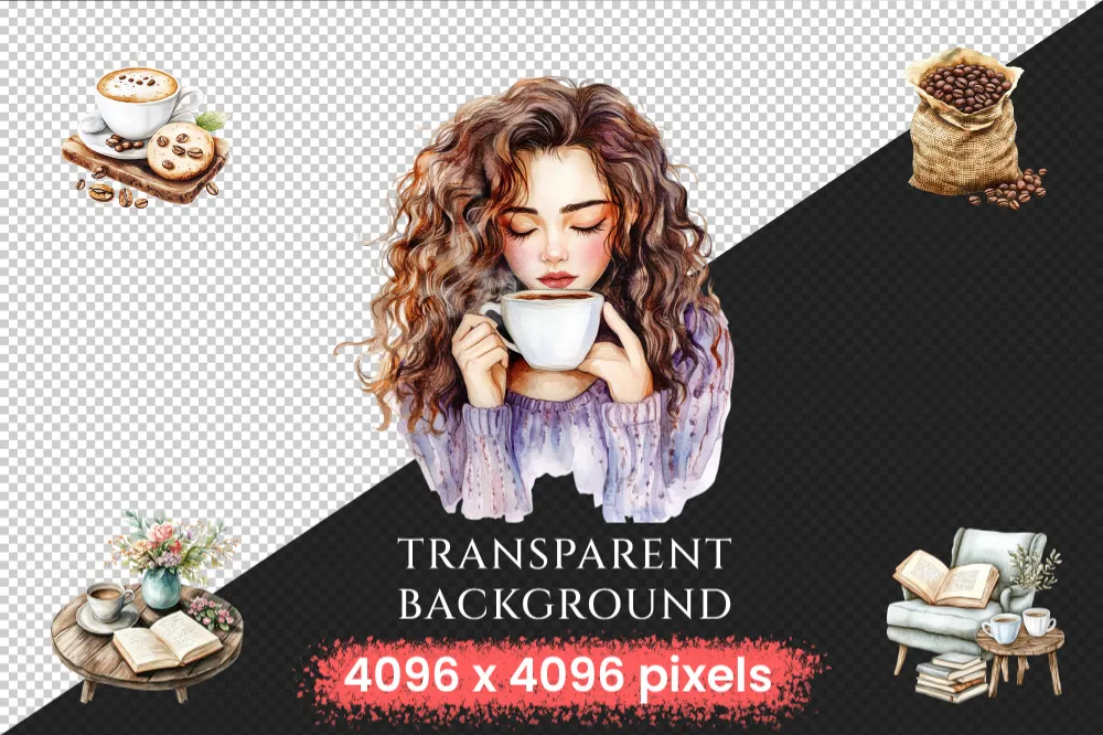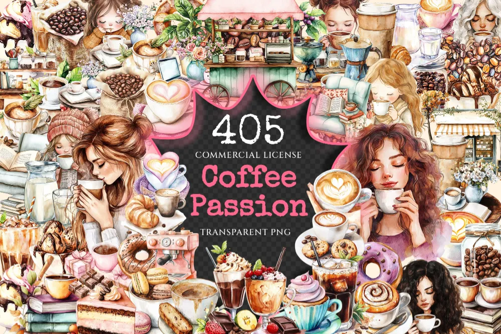 Coffee Passion Watercolor Clipart Bundle – 400+ transparent PNG, Fragrant coffee graphics, Warm cafe png, Commercial use, Digital download