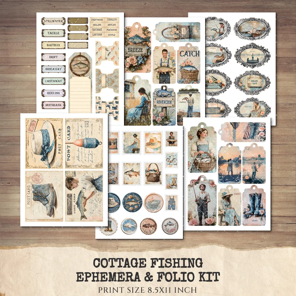 Cottage Fishing Ephemera & Folio Kit – Rustic Fishing, Angler Printables, Vintage, Boots Rods Ponds, Fishing Tags, Kits, Digital Download