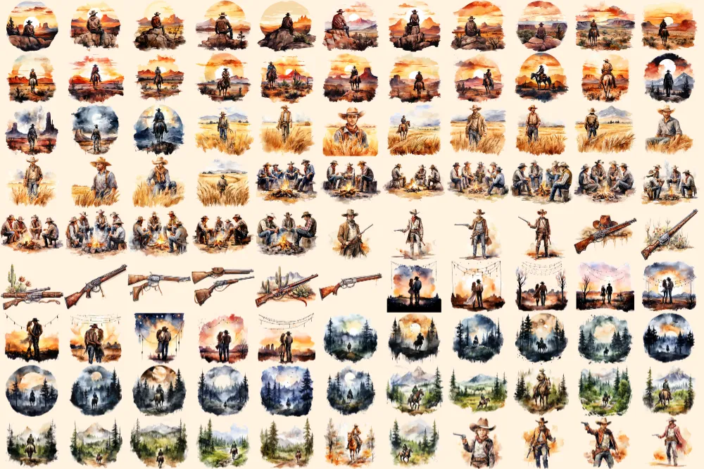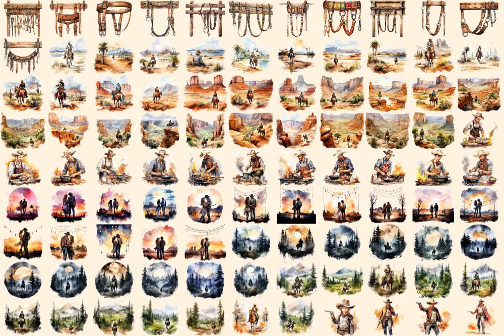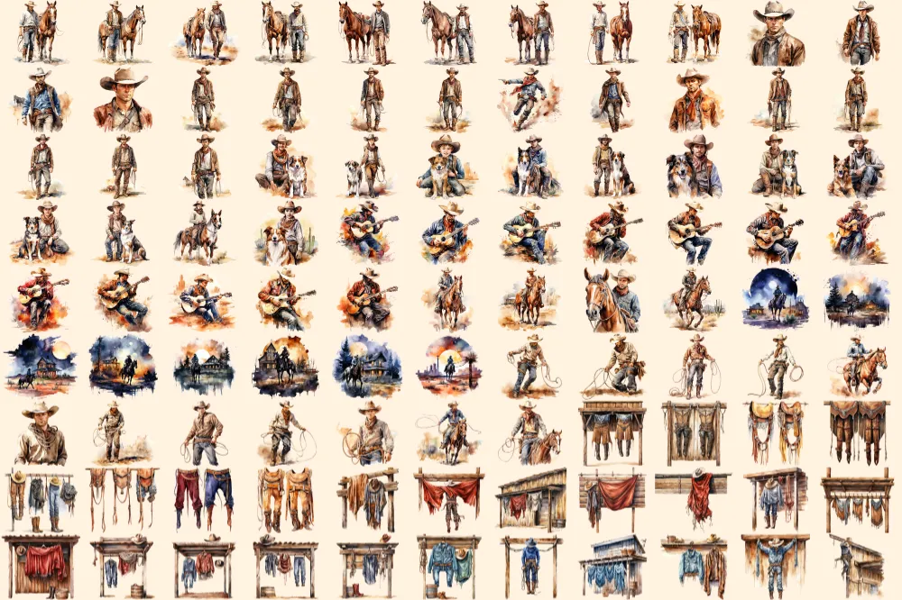 Cowboy Watercolor Clipart Bundle – 650+ transparent PNG, Frontier cowboy illustrations, Wild west rodeo, Commercial use, Digital download