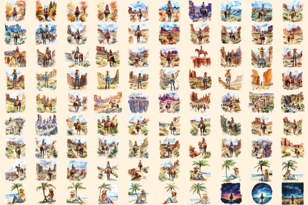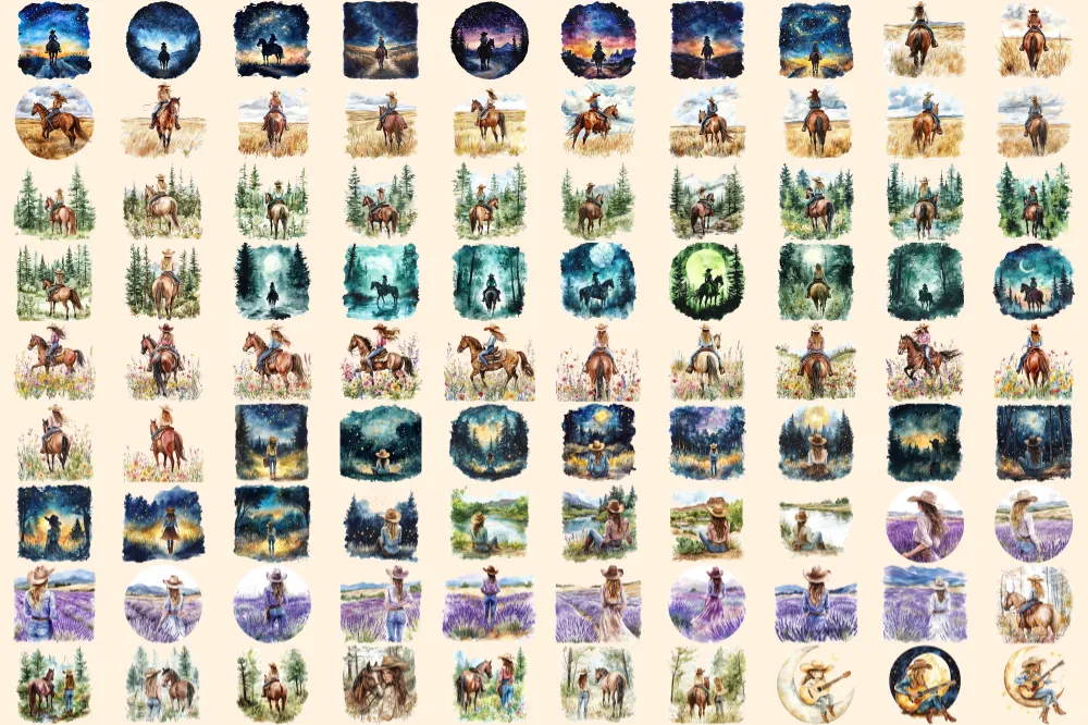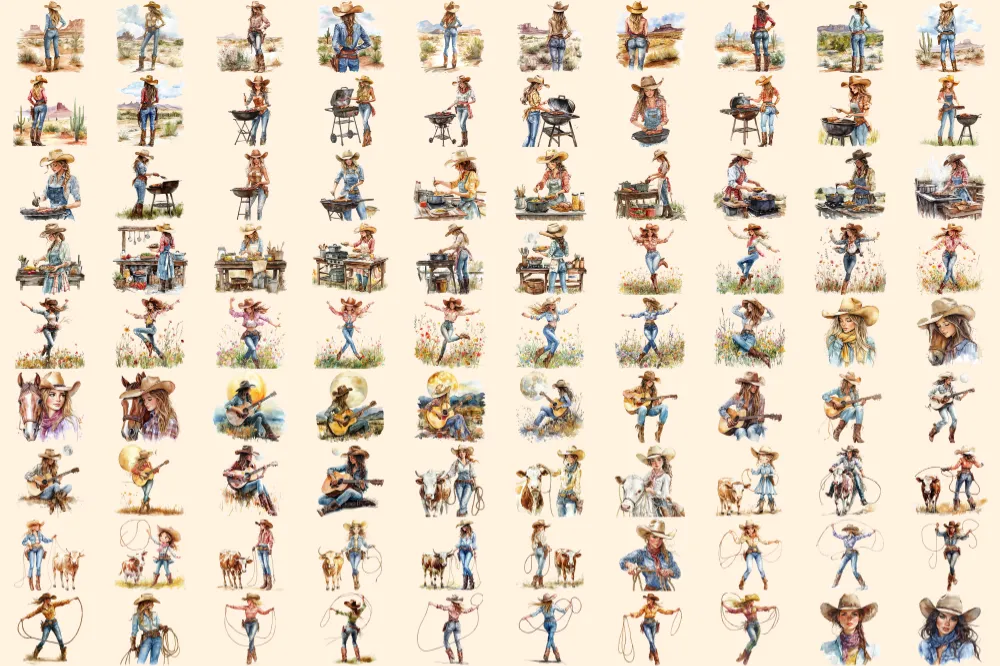 Cowgirls Watercolor Clipart Bundle – 623+ transparent PNG, Western female graphics, Cowgirl rodeo images, Commercial use, Digital download