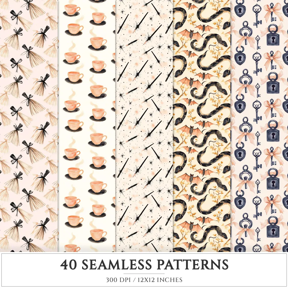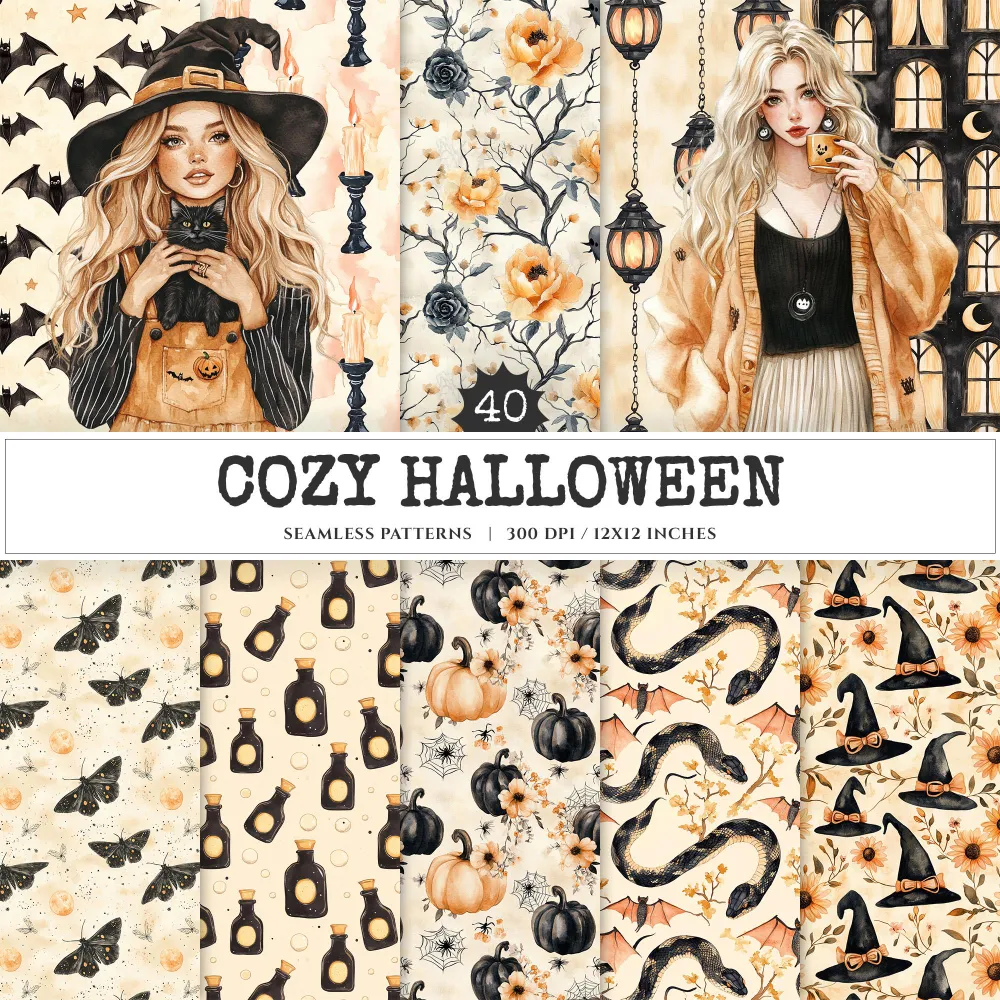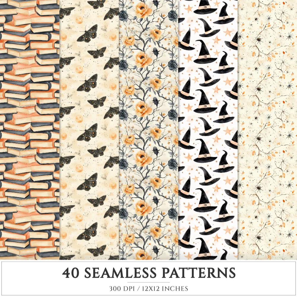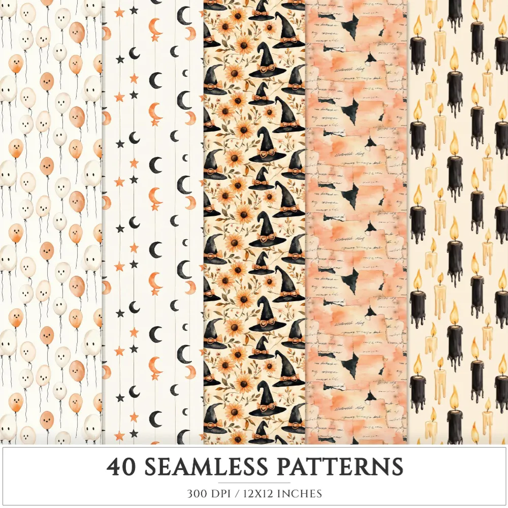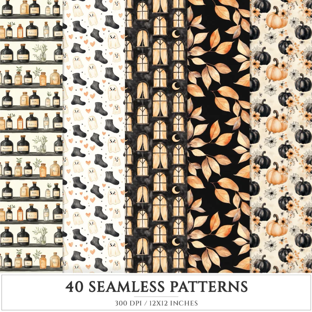 Cozy Halloween Seamless Patterns, Spooky halloween JPEG, Skulls pattern, Witch Hat, Ghosts, Bats repeating pattern, Digital scrapbook paper