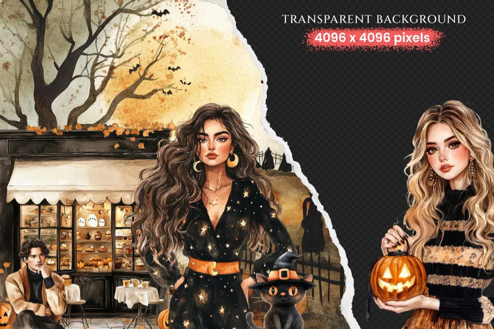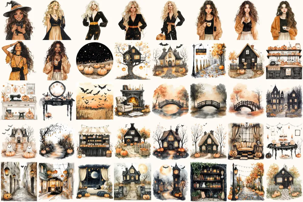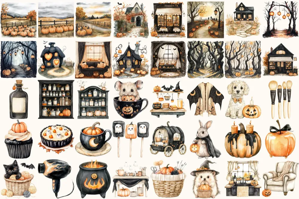 Cozy Halloween Watercolor Clipart Set – 260+ transparent PNG, Modern haunted graphics, Subtle spooky png, Commercial use, Digital download