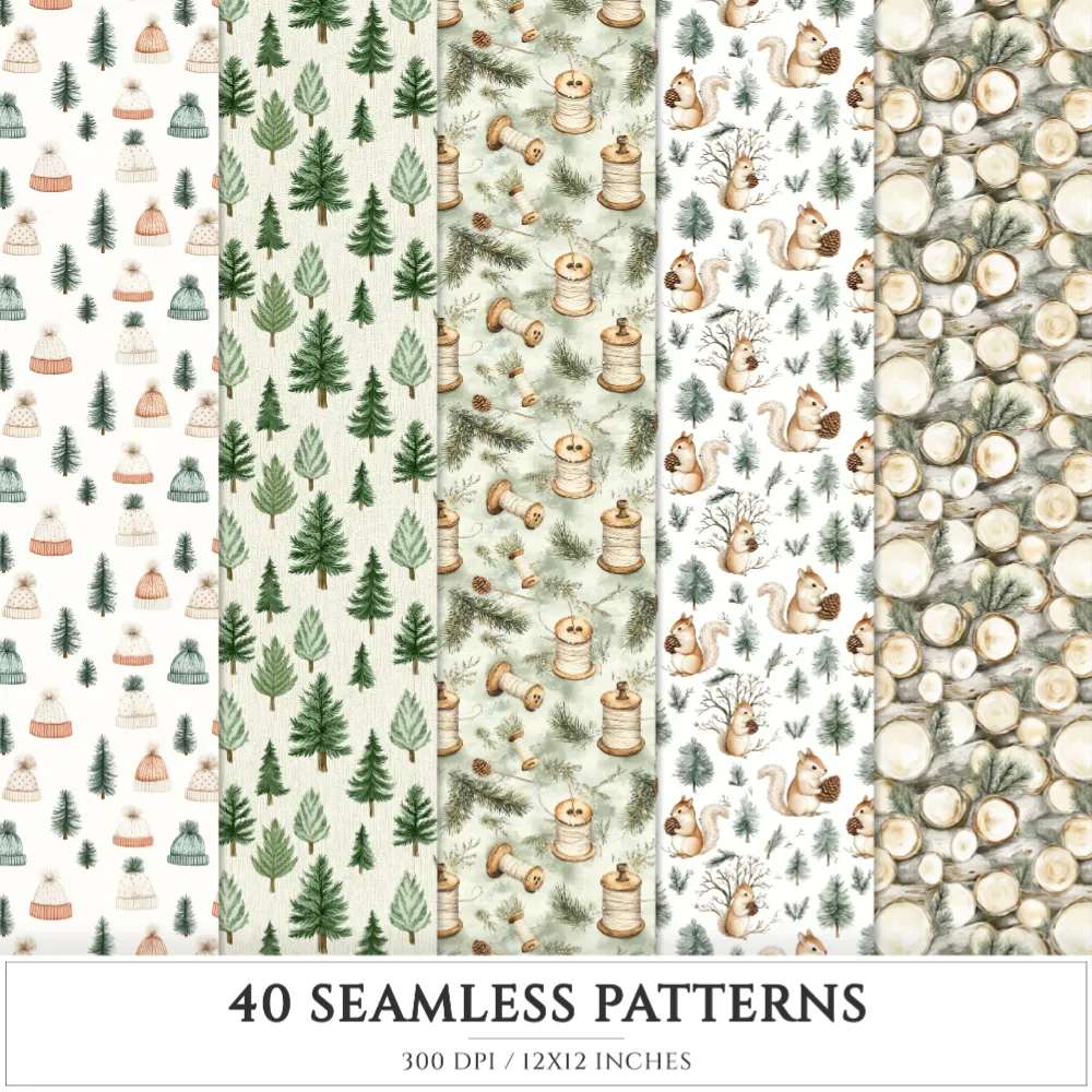 Cozy Pines and Winter Seamless Patterns, Christmas JPEG, Reindeer seamless pattern, Foxes, Pines repeating pattern, Digital scrapbook paper