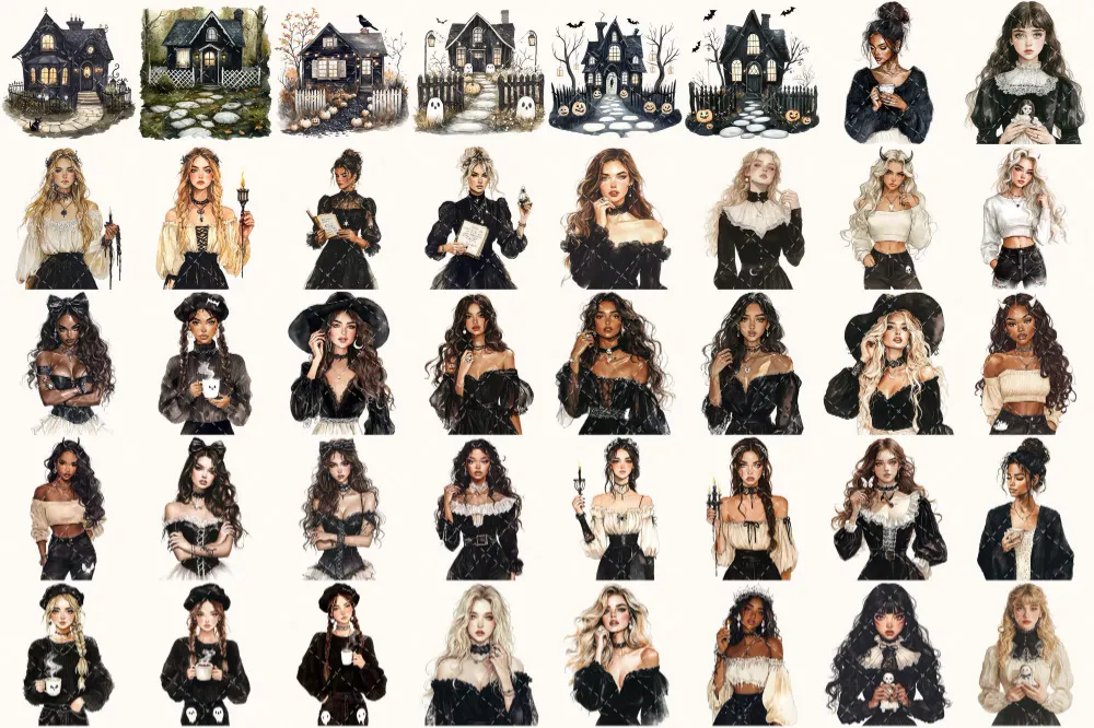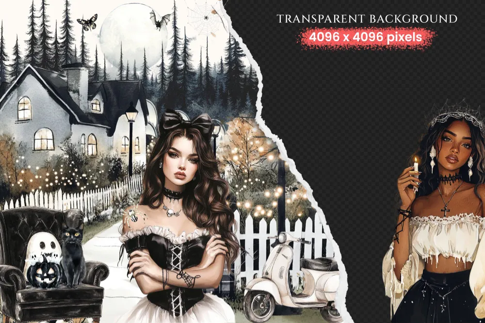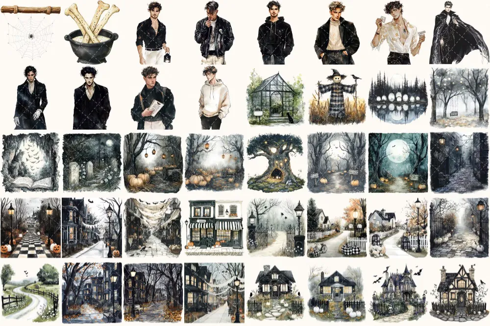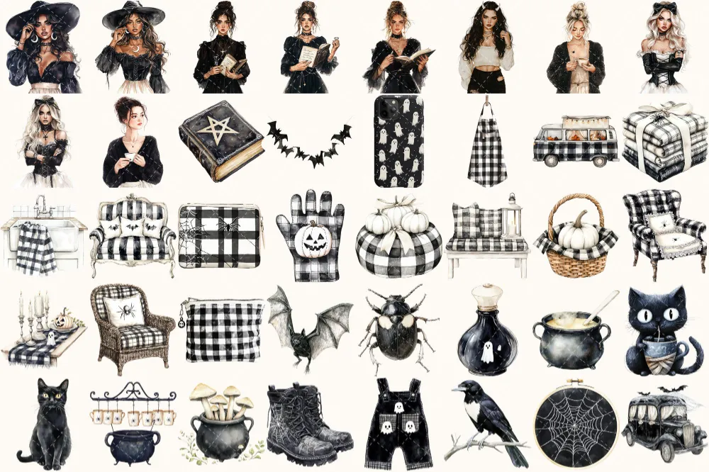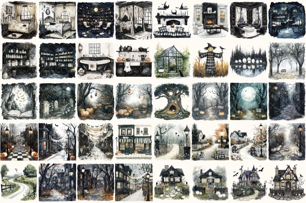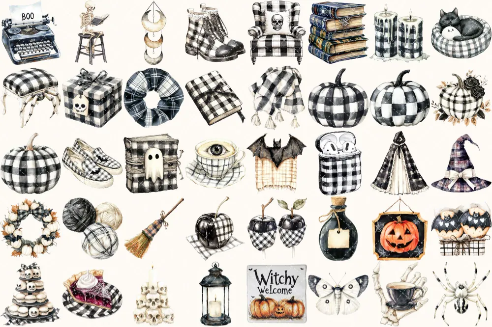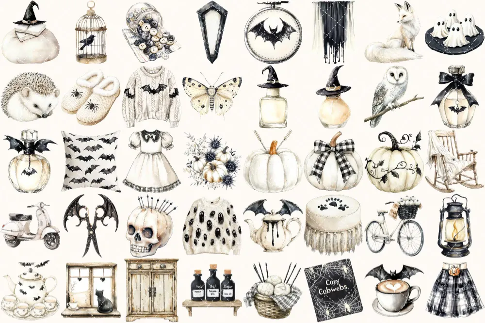 Creepy and Cozy Watercolor Clipart Set – 250+ transparent PNG, Spooky graphics, Autumn halloween decor png, Commercial use, Digital download